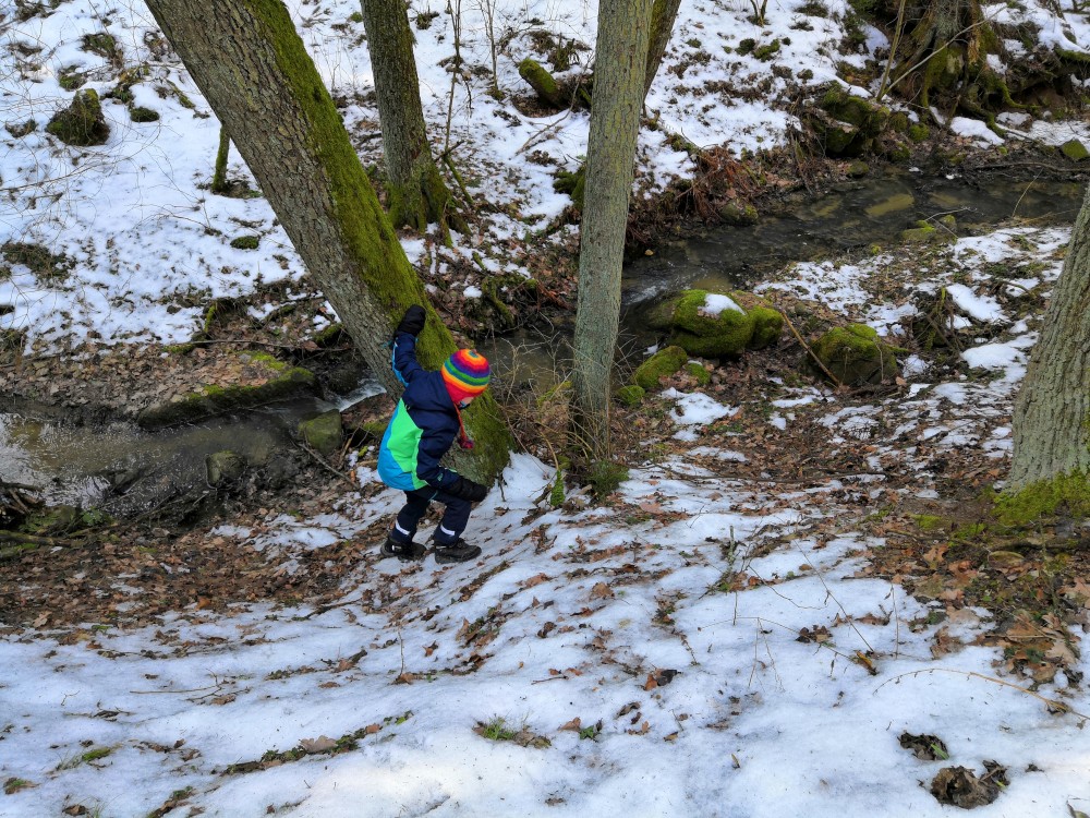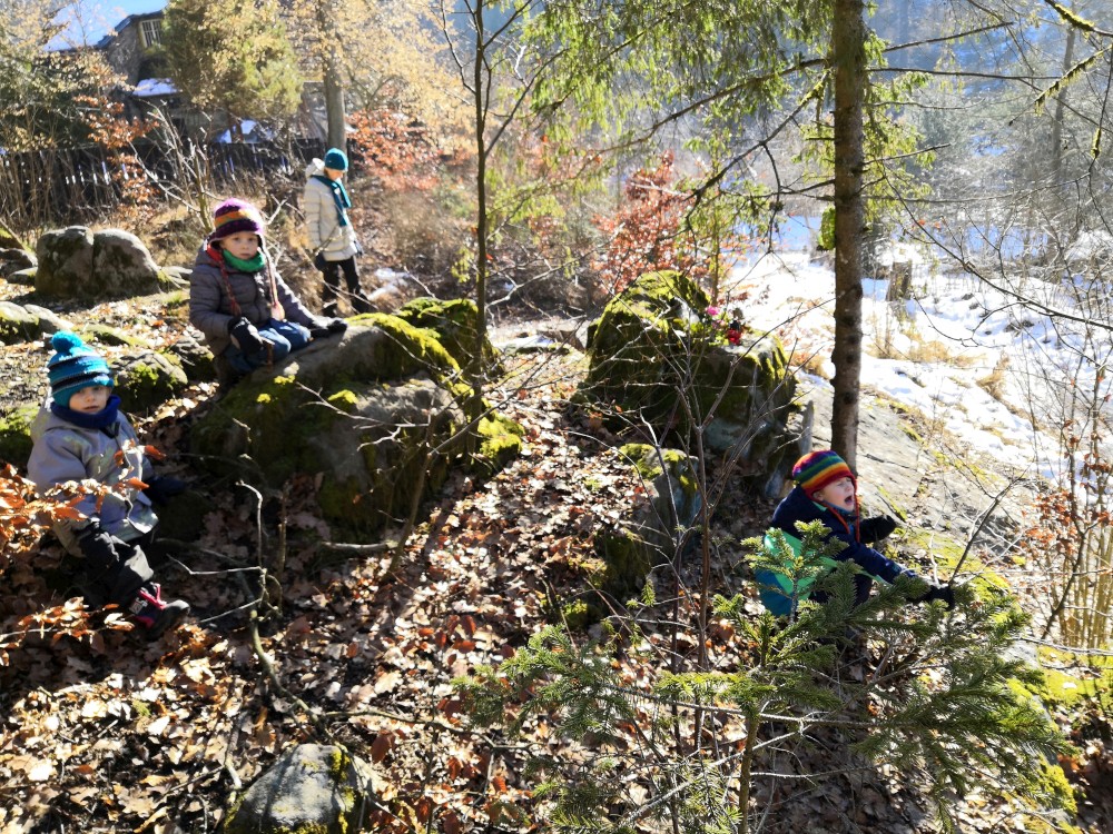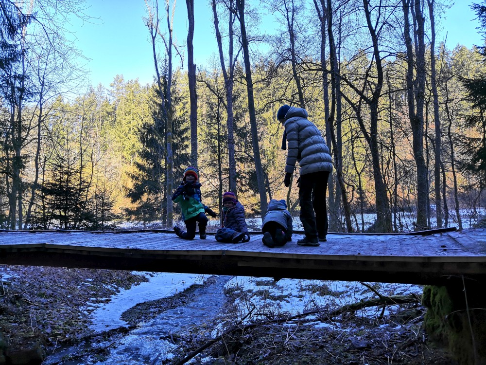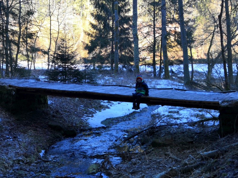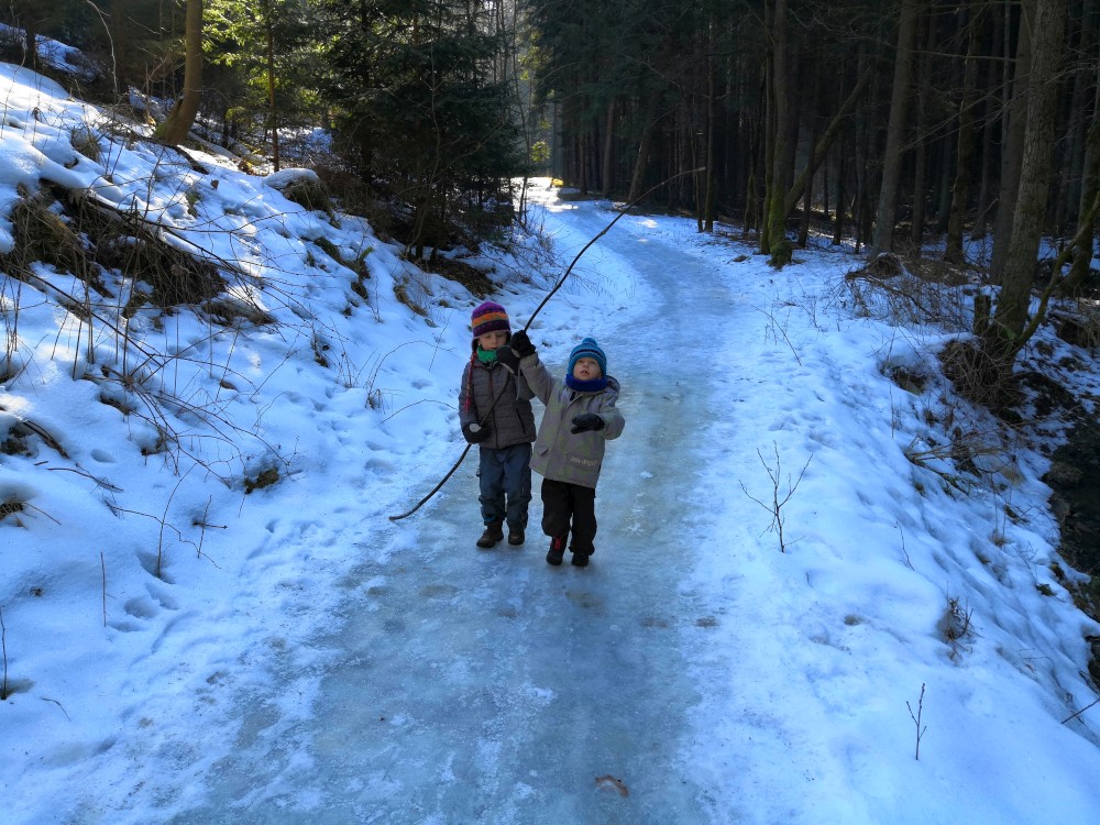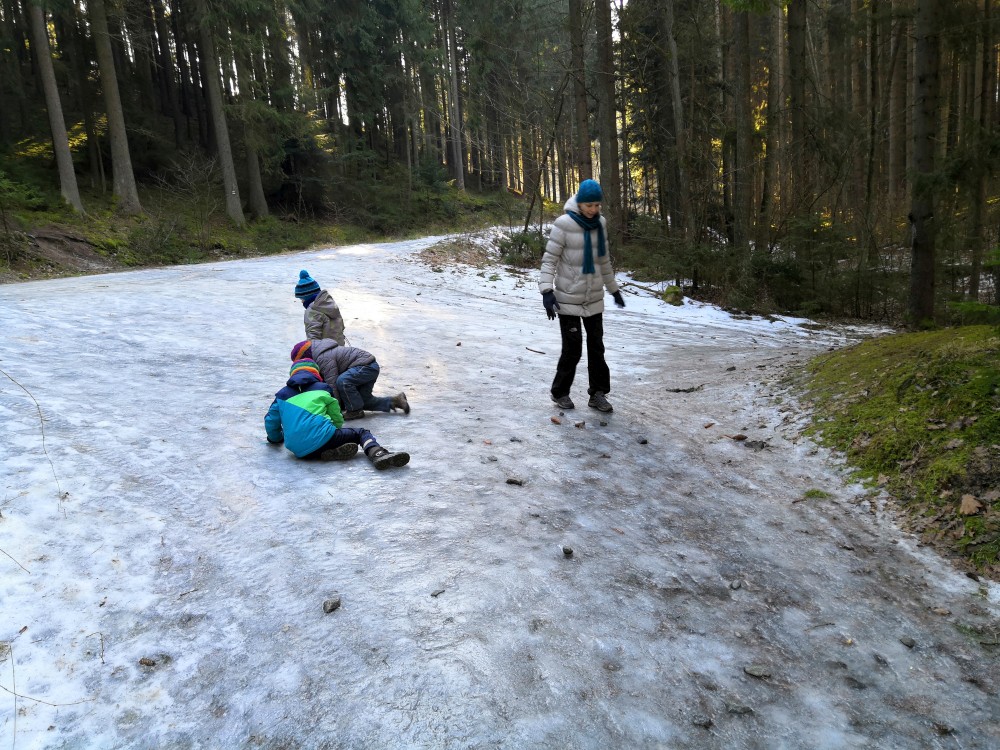 Dopoledne je krásně, svítí sluníčko. Jdeme na procházku na Harrachovku Vlčím dolem. Vracíme se na oběd domů.