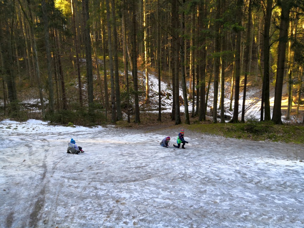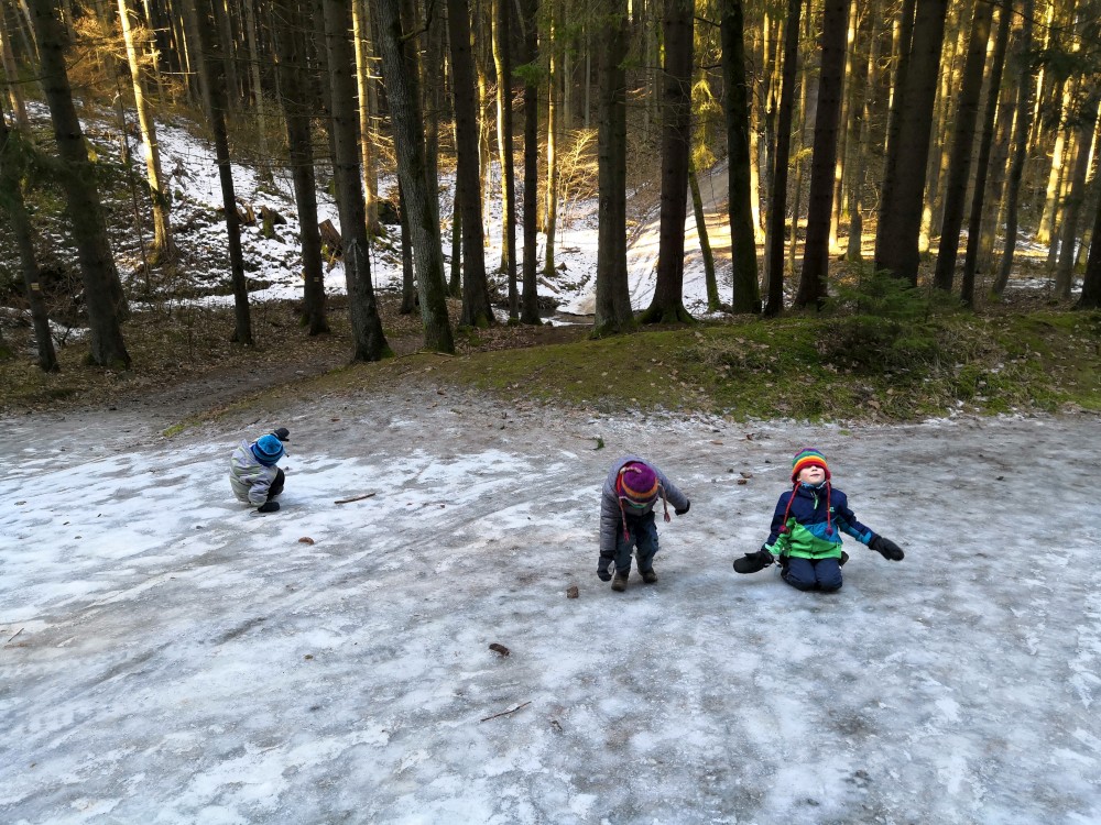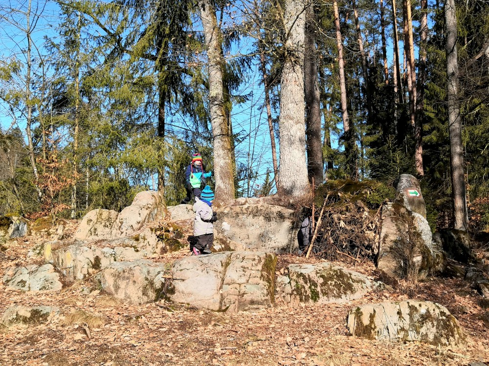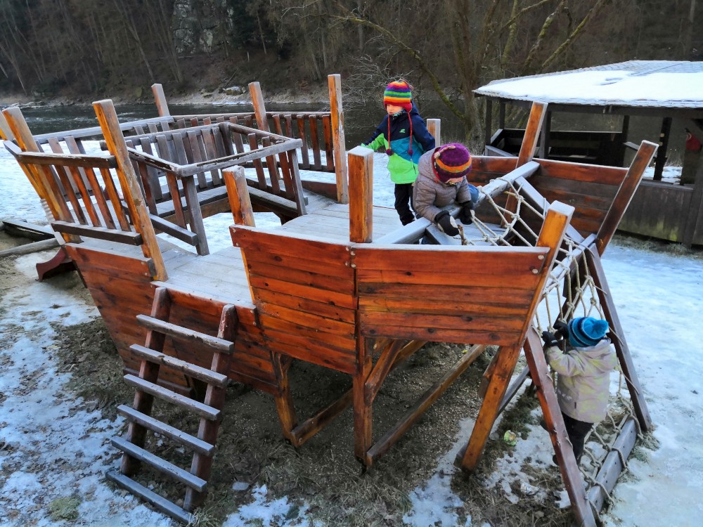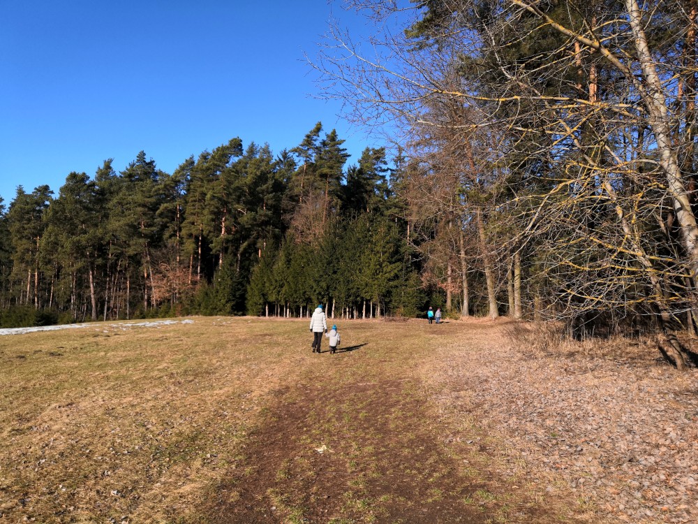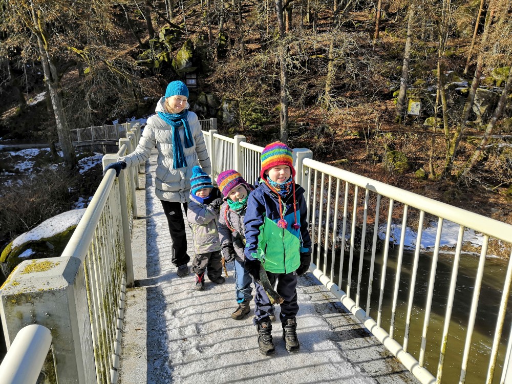 Dopoledne je krásně, svítí sluníčko. Jdeme na procházku na Harrachovku Vlčím dolem. Vracíme se na oběd domů.