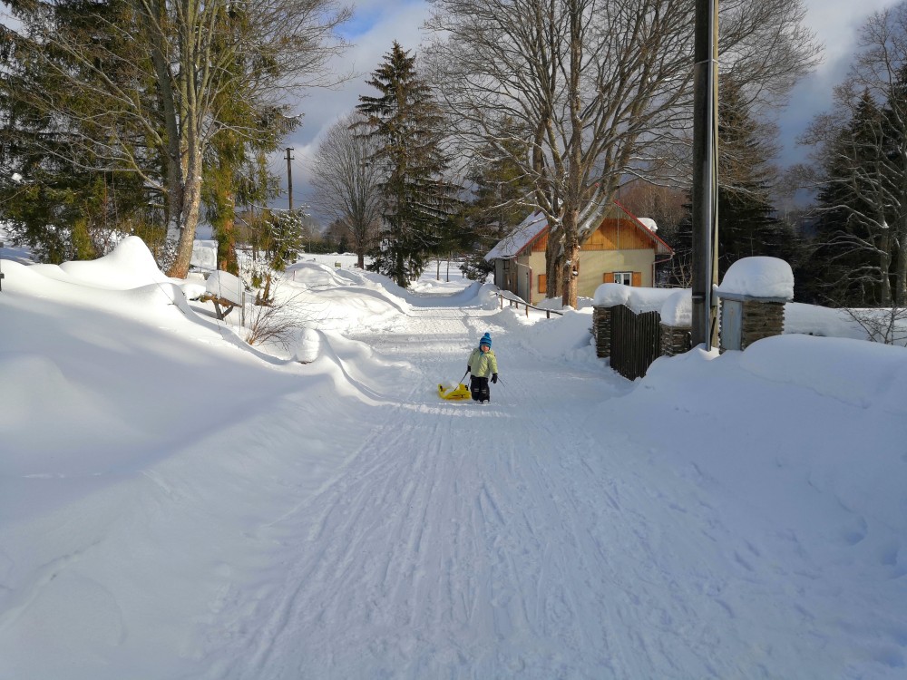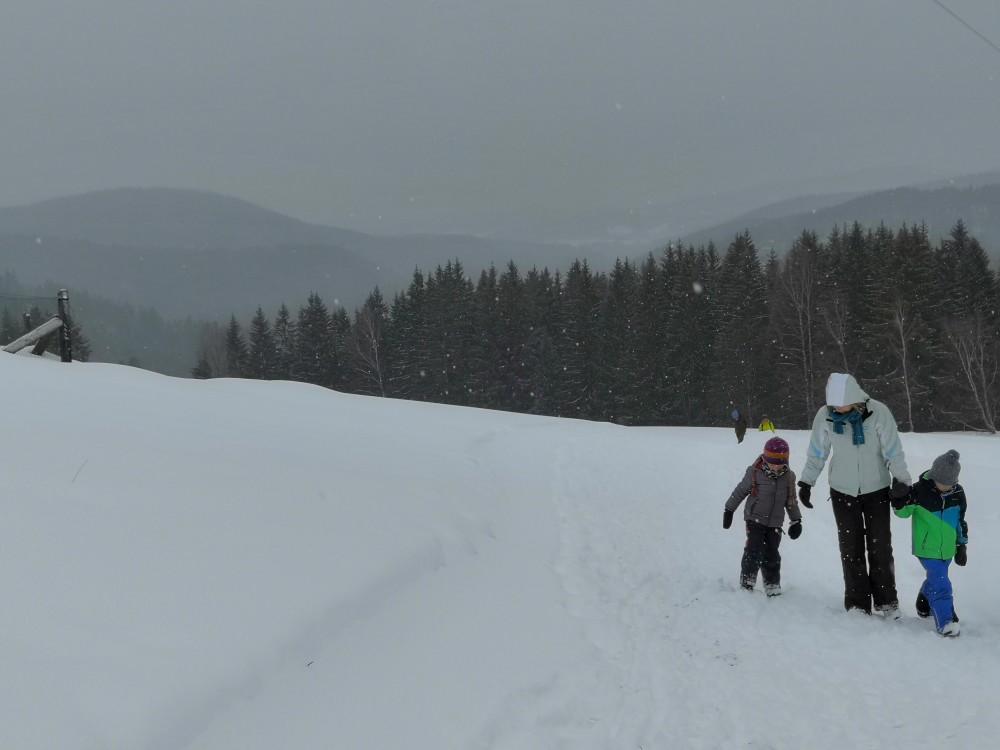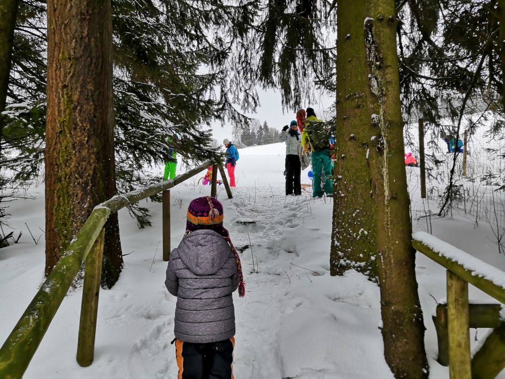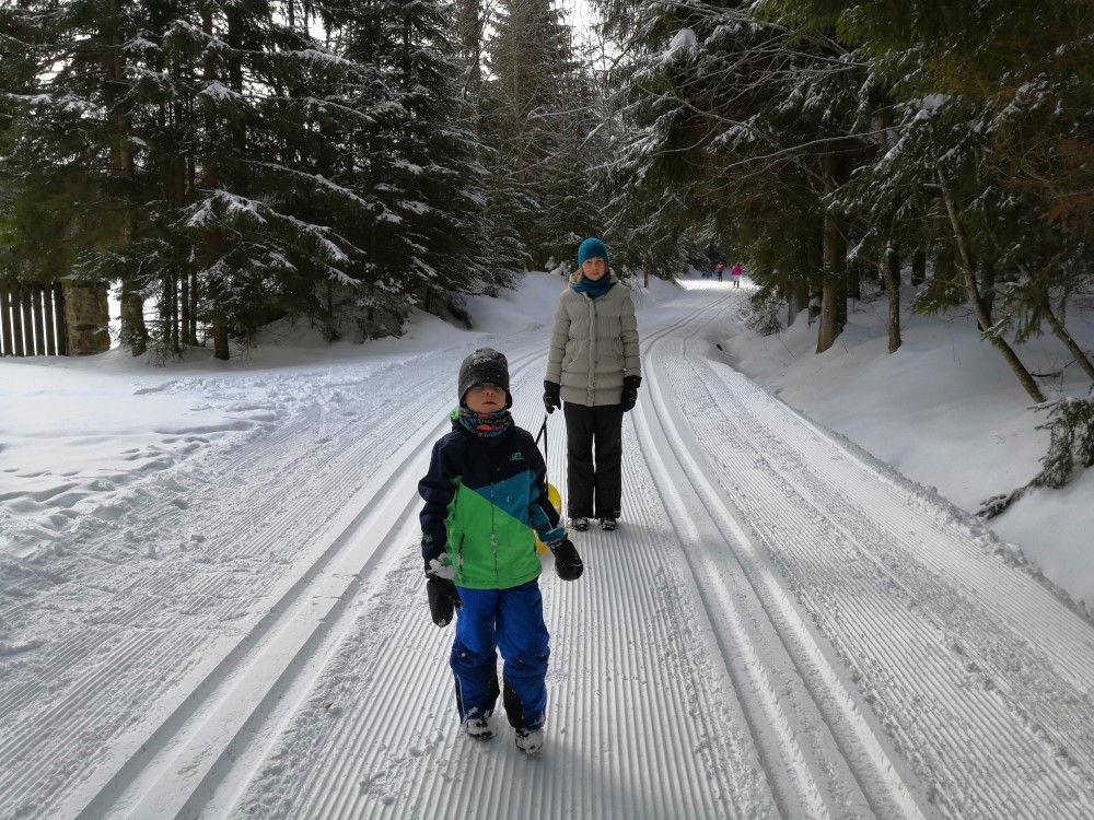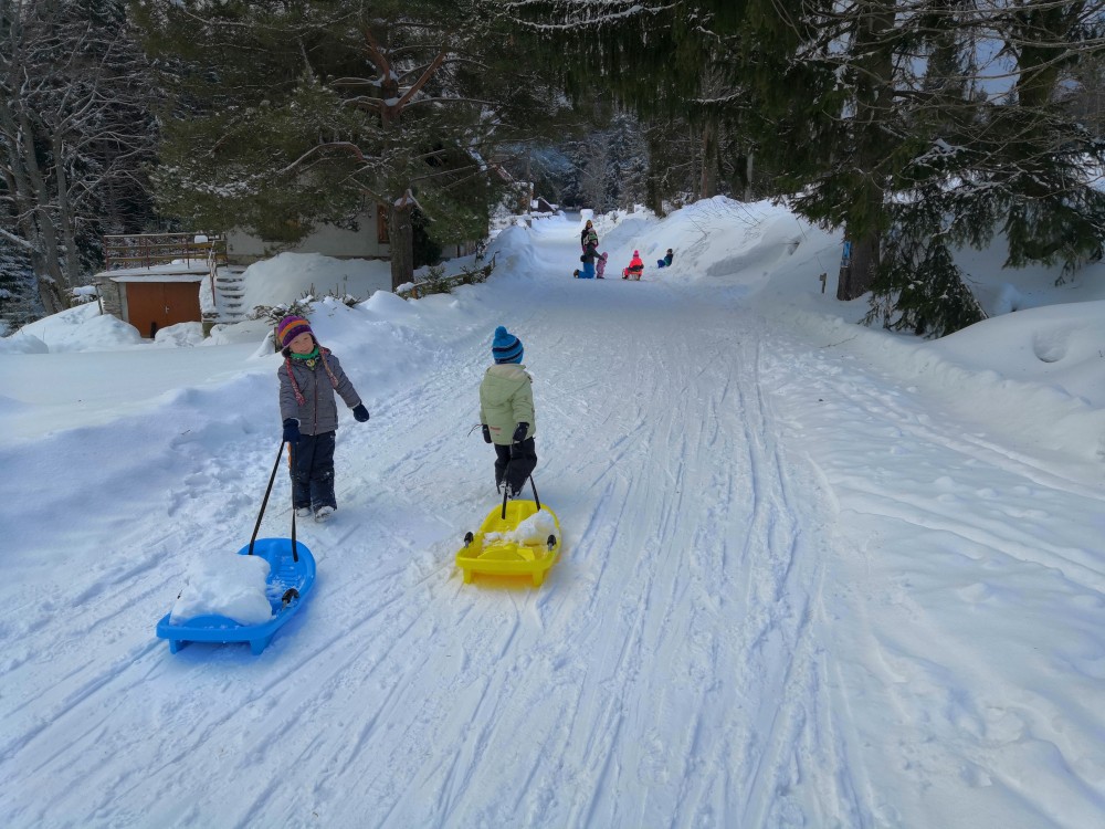 Po pozorování jelenů se přesouváme do hotelů Srní a dáváme oběd. Pak už se přesouváme na pension a bobujeme korytem na zápraží, děti i dospělí. Dáváme večeři, uspáváme a trávíme společně večer.