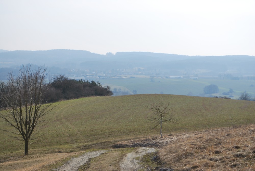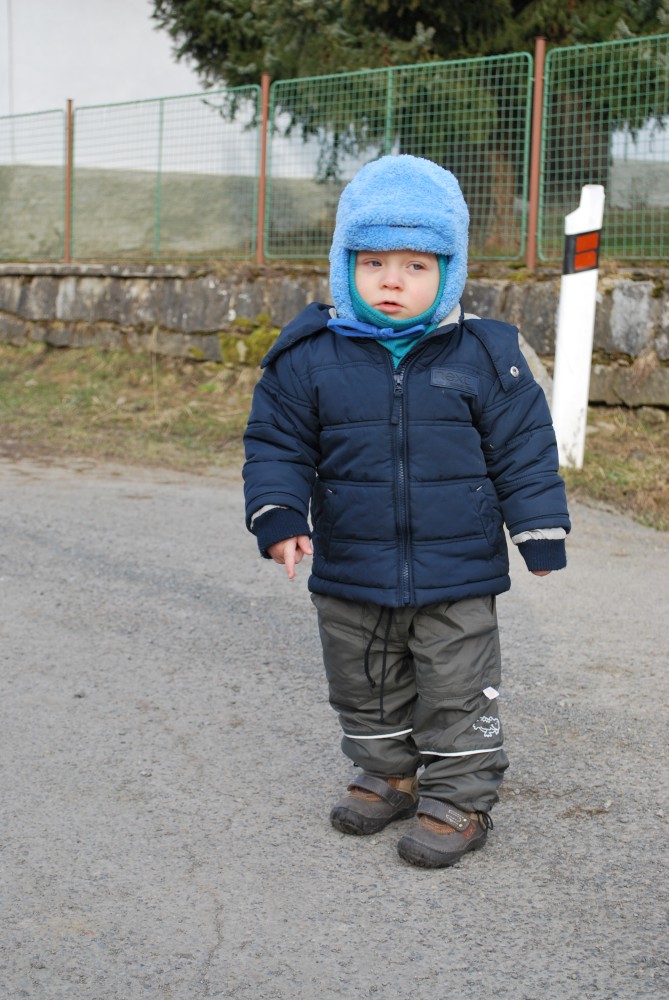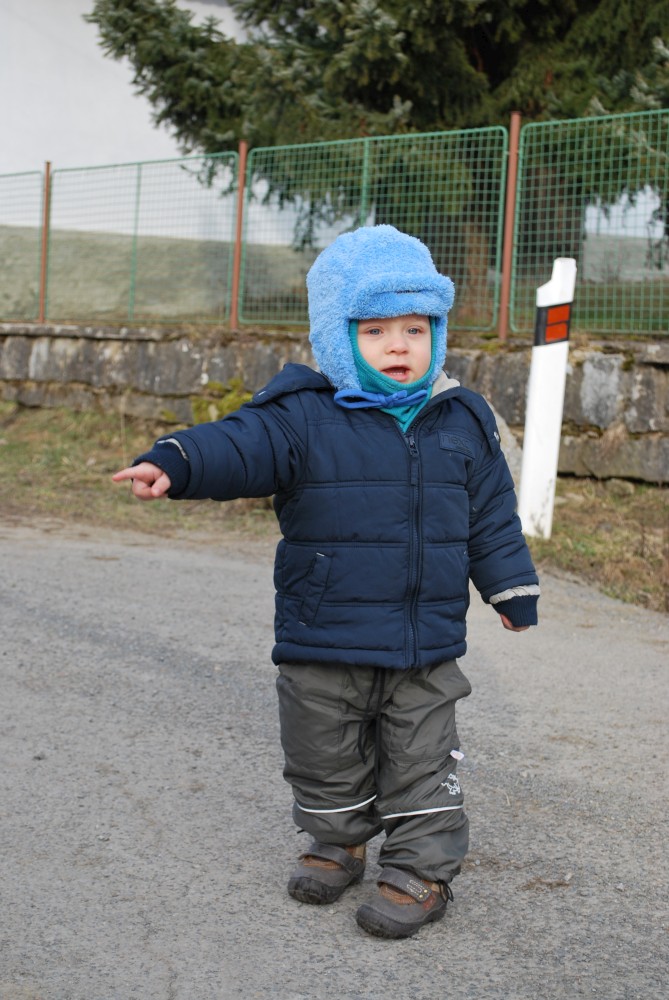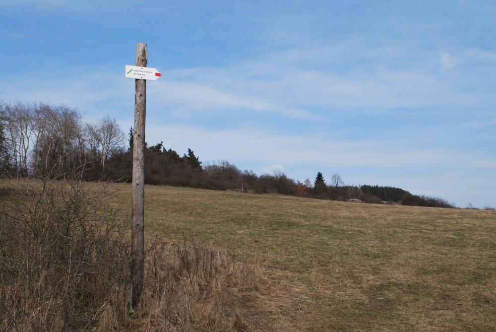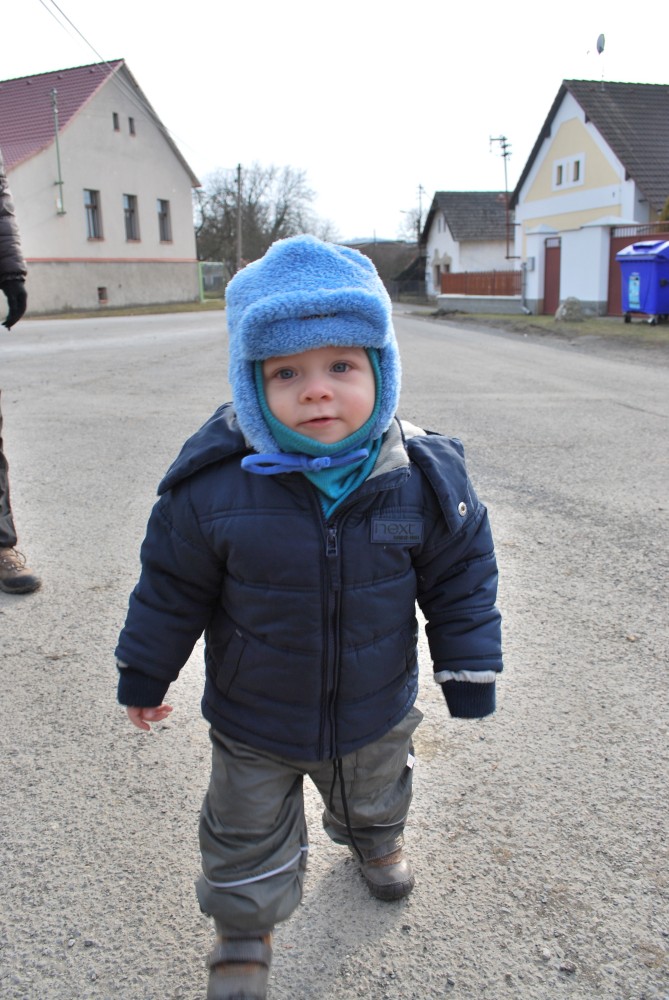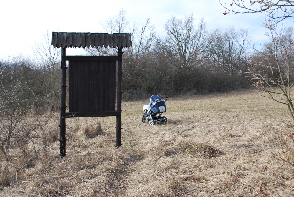 Nejdříve stoupáme po asfaltce východním směrem. Po chvíli se oddělujeme od naučné stezky, abychom se na ní zase po chvíli zase napojili. Míjíme obec Skoupí a jdeme skrz větrnou mez zvanou Kozince (je to 9.zastavení NS Petrovicko). To je fakt hezké místo. Jsou zde krásné výhledy do kraje. Jen je tu dneska hodně větrno. Odtud klesáme dolů k Divišově jeskyni (je to 8.zastavení NS Petrovicko). Podzemí má asi 60 m, ale jeskyně není otevřená. Nahlížíme dovnitř, děláme společné foto a jedeme po modré dále. Modrá značka vede přes poměrně příkrou cestu po skále. Tam to s kočárkem nepůjde. Navíc se Víťa probouzí, takže to stáčíme zpět na asfaltku a kolem kaple, kde vyvěrá pramen, se vracíme zpět do Týnčan. Procházíme se s Víťou po návsi, sedáme do auta a jedeme domů.