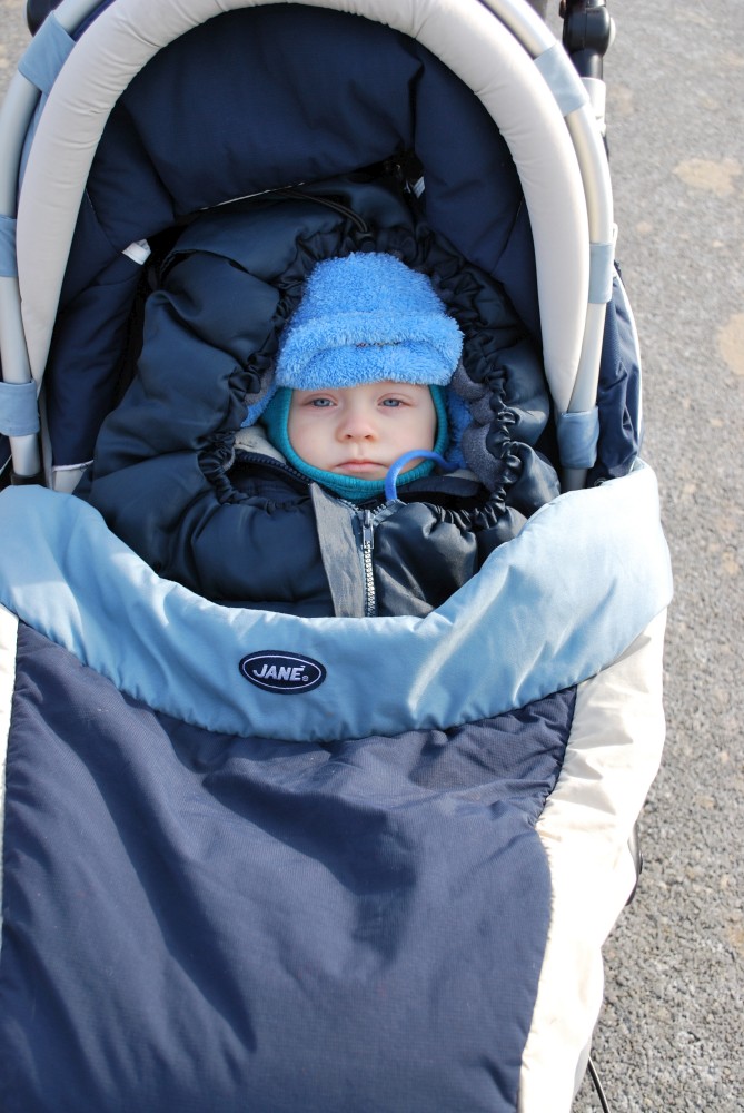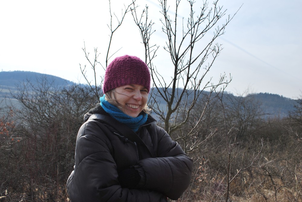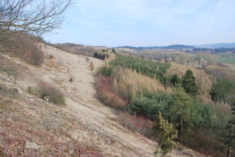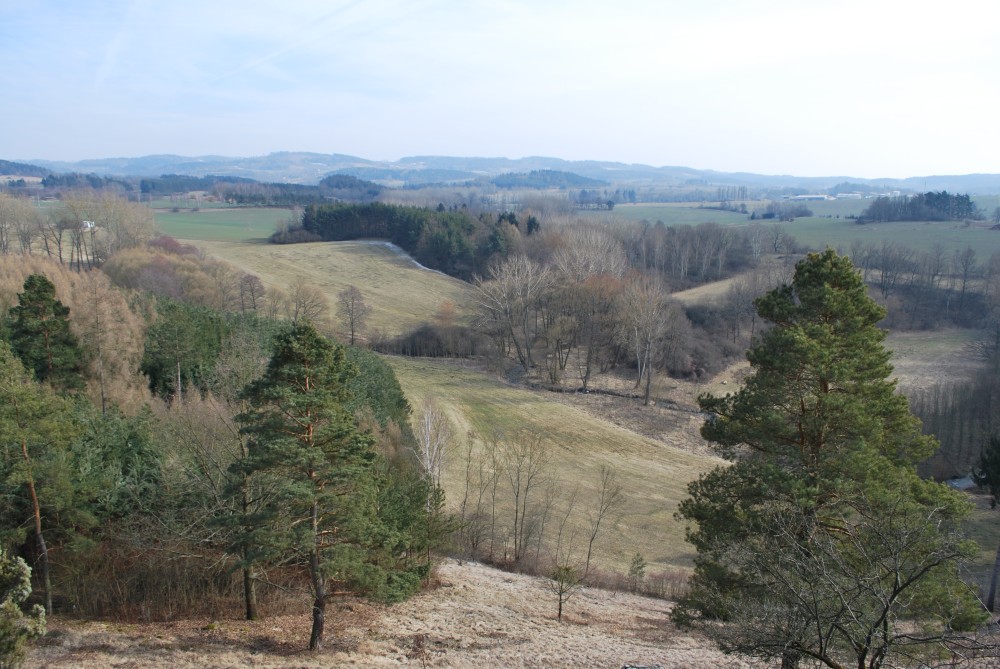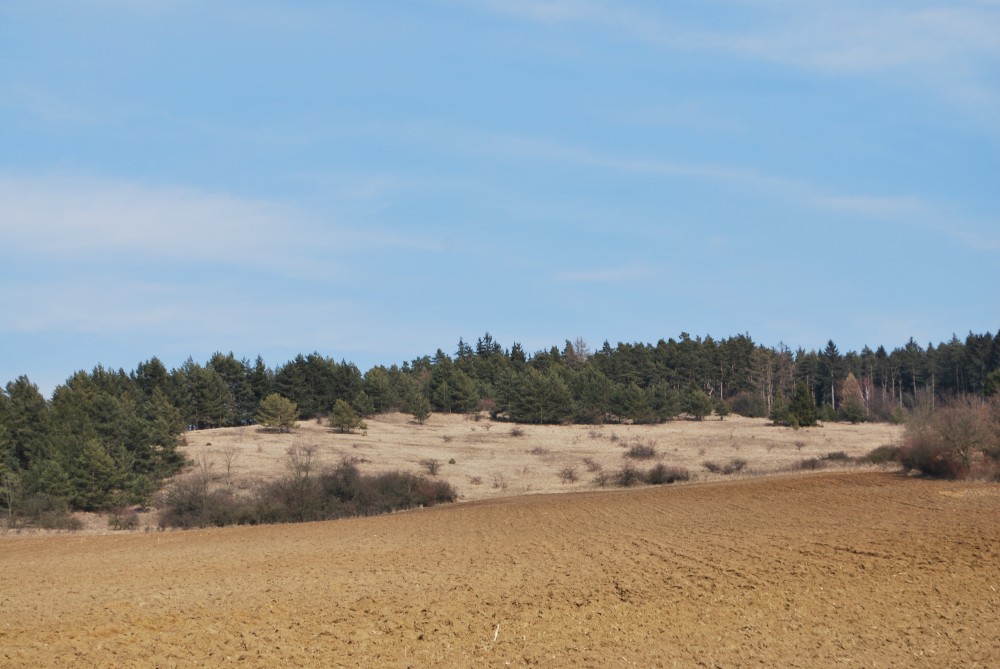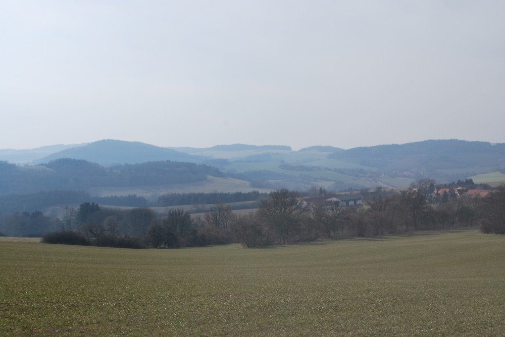 Nejdříve stoupáme po asfaltce východním směrem. Po chvíli se oddělujeme od naučné stezky, abychom se na ní zase po chvíli zase napojili. Míjíme obec Skoupí a jdeme skrz větrnou mez zvanou Kozince (je to 9.zastavení NS Petrovicko). To je fakt hezké místo. Jsou zde krásné výhledy do kraje. Jen je tu dneska hodně větrno. Odtud klesáme dolů k Divišově jeskyni (je to 8.zastavení NS Petrovicko). Podzemí má asi 60 m, ale jeskyně není otevřená. Nahlížíme dovnitř, děláme společné foto a jedeme po modré dále. Modrá značka vede přes poměrně příkrou cestu po skále. Tam to s kočárkem nepůjde. Navíc se Víťa probouzí, takže to stáčíme zpět na asfaltku a kolem kaple, kde vyvěrá pramen, se vracíme zpět do Týnčan. Procházíme se s Víťou po návsi, sedáme do auta a jedeme domů.