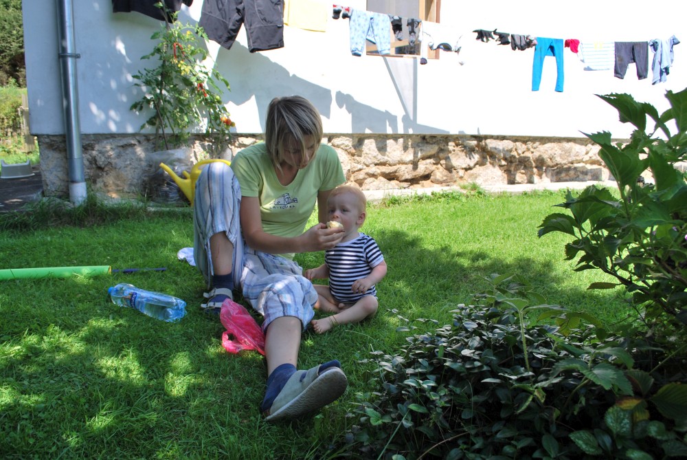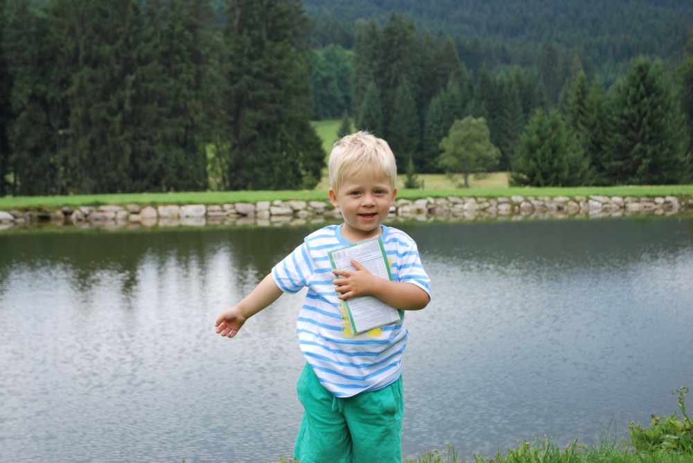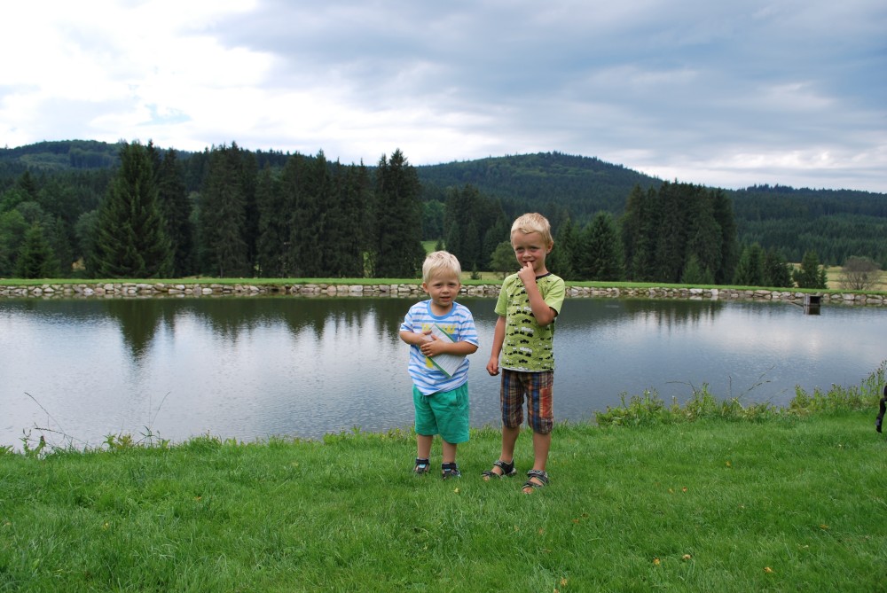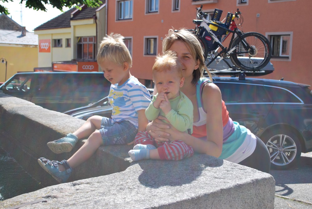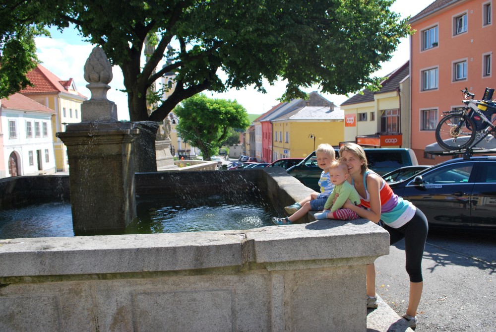 Na víkend jedeme do Velkých Skalin poblíž jihočeské Kaplice na chatičku Štěrbů. Bereme sebou kola. Jedeme v sobotu brzo ráno z Tábora, vybalujeme na chatičce a hned vyrážíme na výlet. Jedeme autem přes Benešov nad Černou do Černého údolí. Tam necháváme auto a se Štěrbičema vyrážíme směr Žofín. Víťa je v sedačce, za sebou ještě táhnu ve vozíku Jiříka.