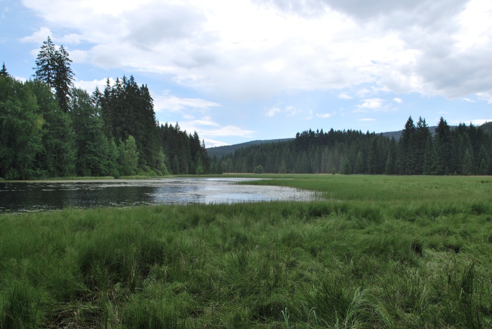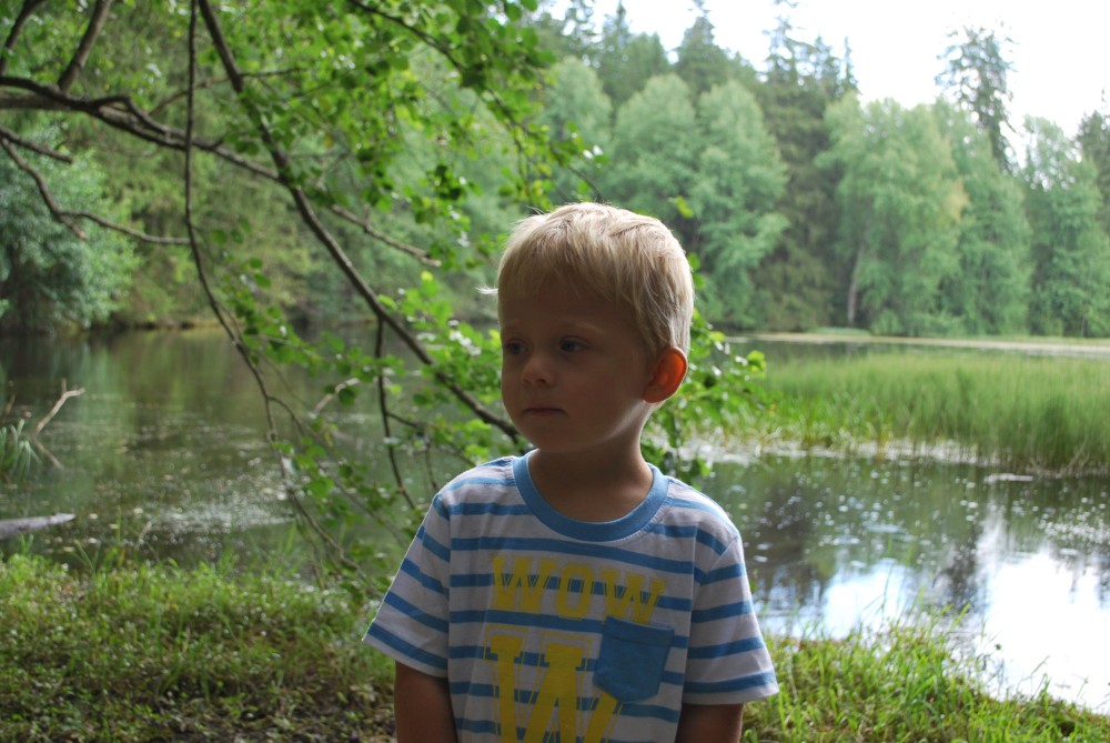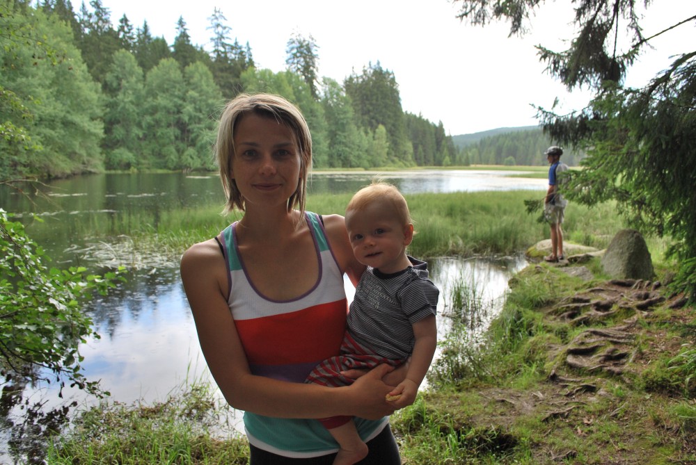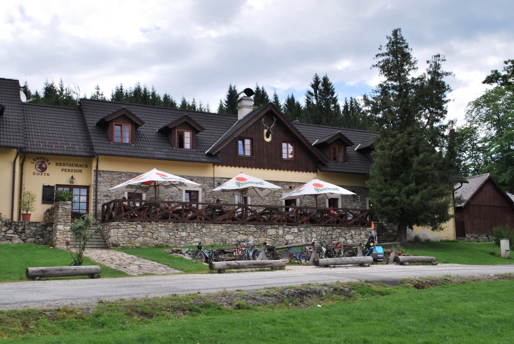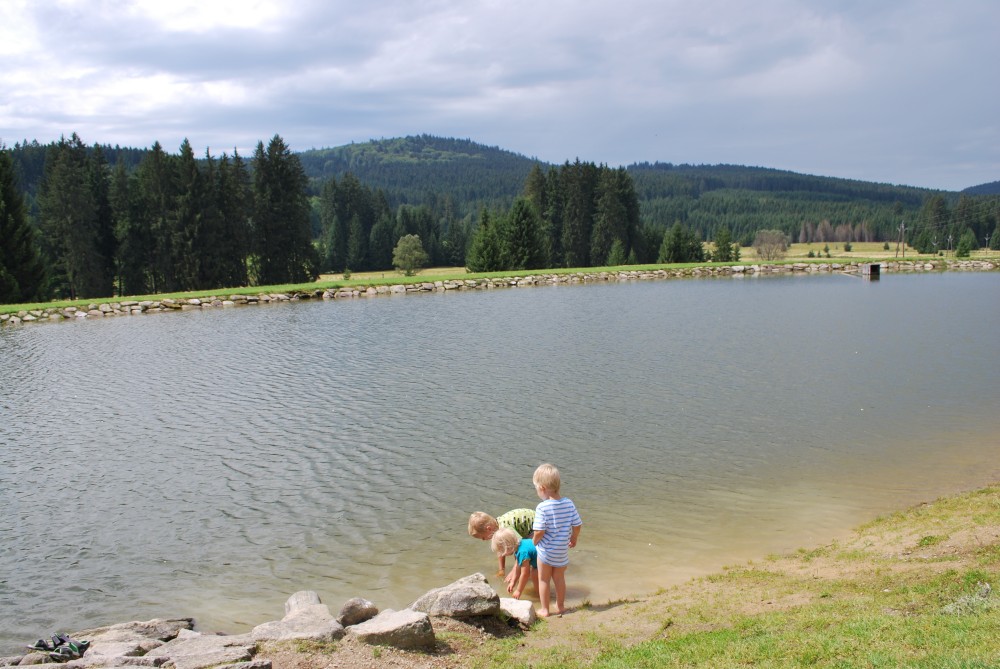 Ujeli jsme asi 4 kilometry a zastavujeme na Žofíně. Je tu krásně, děti se čvachtají v jezírku. Dáváme oběd a vyrážíme zase na kolo. Objíždíme přírodní rezevaci Žofínský prales a zastavujeme se u Huťského rybníka. Pak se vracíme přes Žofín zpět do Černého údolí. Jen tak tak unikáme vydatné přeháňce. Ta nás kropí celou cestu autem zpět na chatičku.