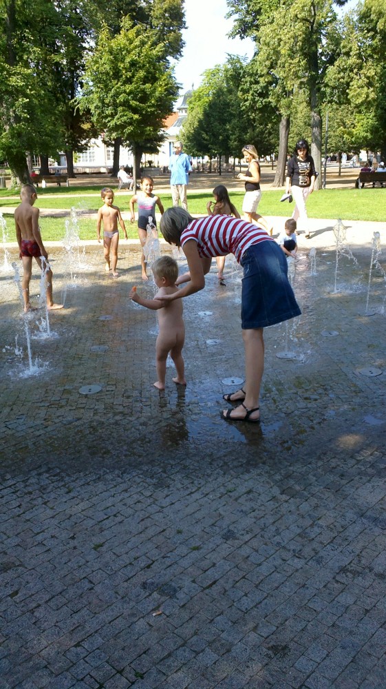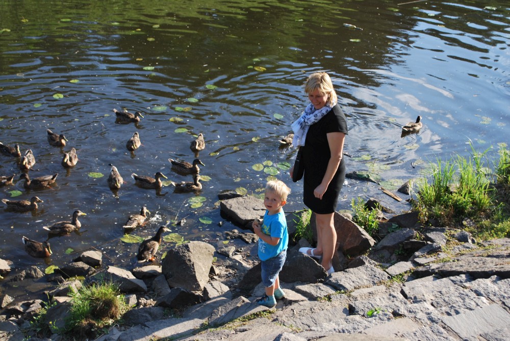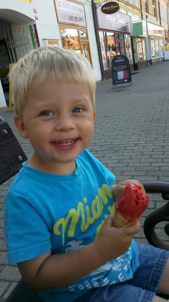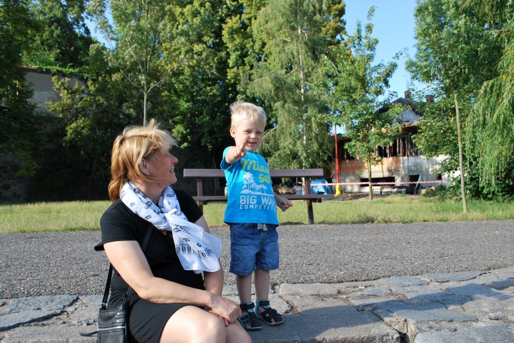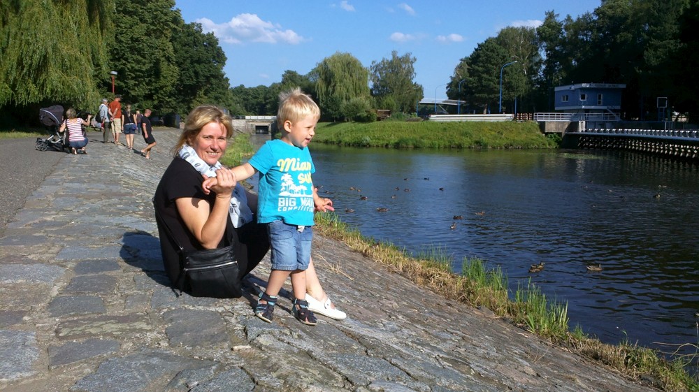 Procházíme se po parku, Víťa se koupe ve fontáně a brodí se místní říčkou, kupujeme si pizzu a pak zmrzlinu. Jdeme se podívat k Labi. Víťovi se líbí kachny a labutě.