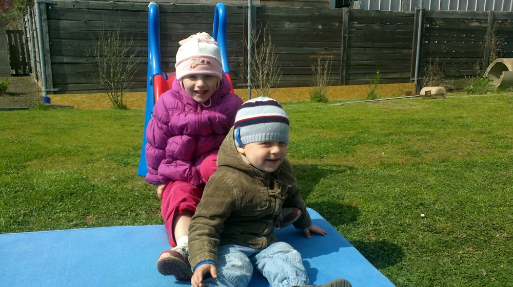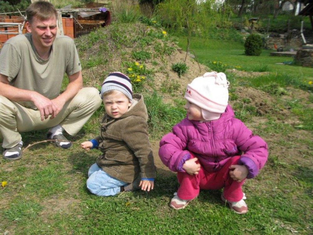 Pak jedeme ještě navštívit babičku Hanku do Čekanic. Víťa si hraje s Eliškou.