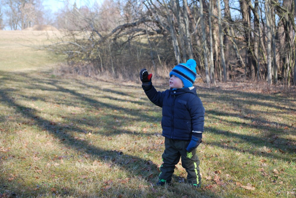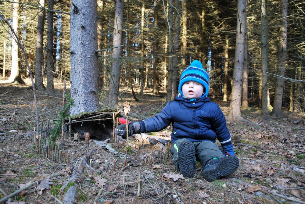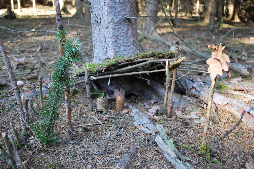 Jdeme s Víťou do lesa. Postavili jsme domeček z větviček, mechu a šišek.
