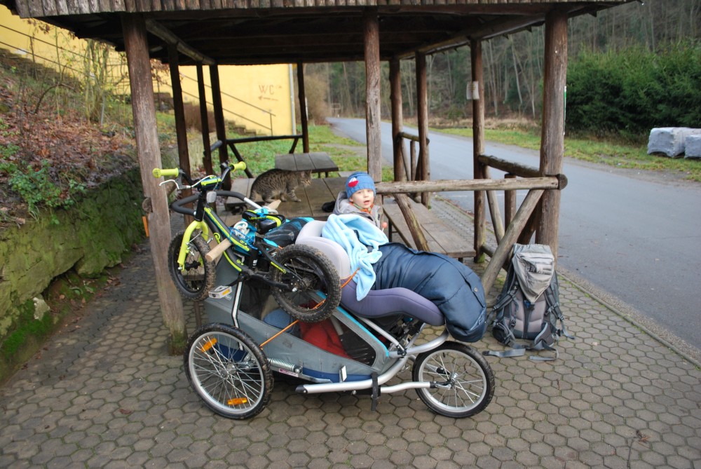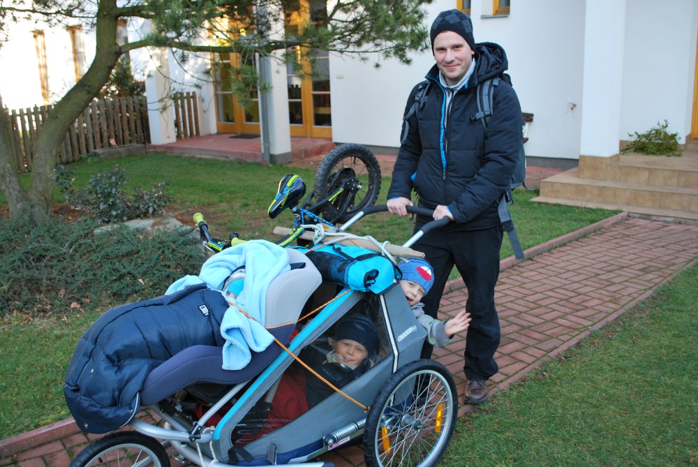 Je potřeba dotáhnout vánoční úklid. A aby na to byl klid, je nejlepší vyklidit z domu kluky. Stačí jeden zlepšovák, aby se na vozík vešli všichni tři a můžeme vyrazit na Harrachovku na pivko :-). Tam pojedeme Vlčím dolem, cestou zpět po asfaltce kolem řeky, aby se Víťa trochu projel na kole.