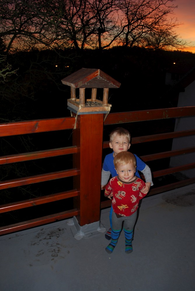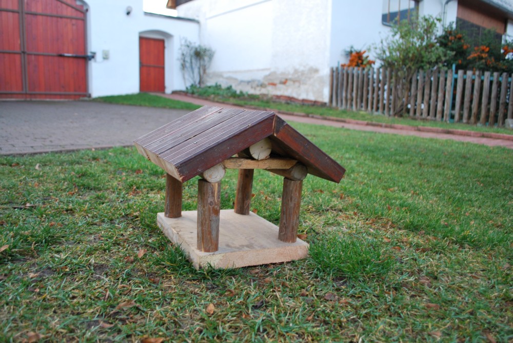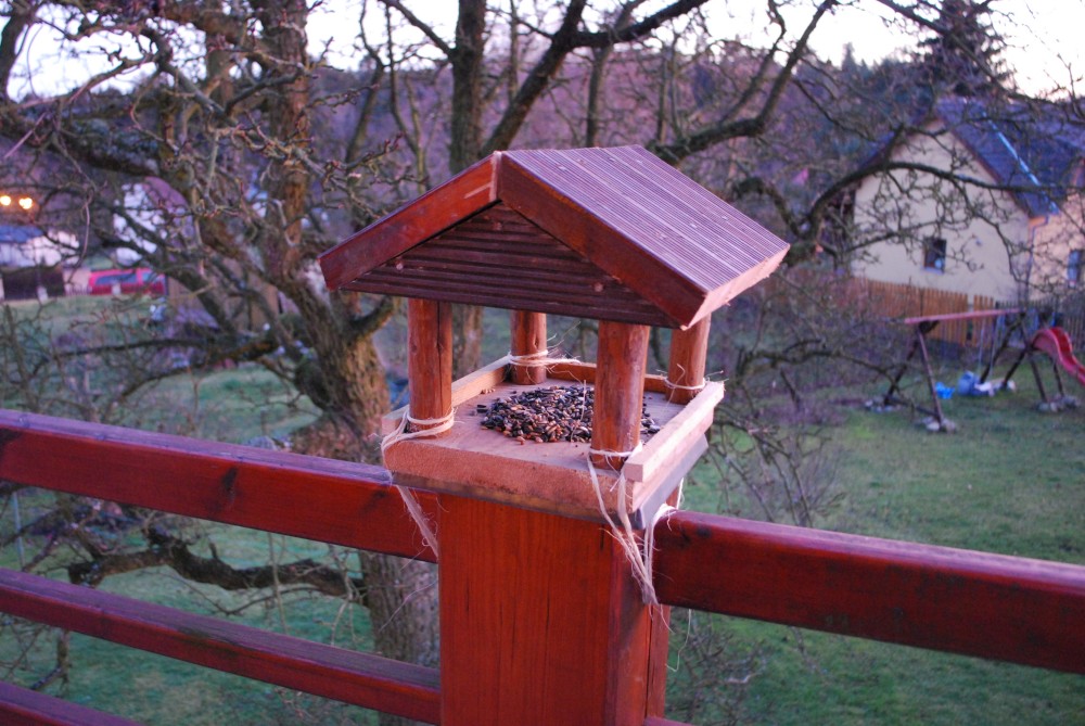 Už si jen vyměříme a uřízneme z prkýnka 2 trojúhelníčky, předvrtáme do nich dírky v místech hřebenového trámku a trámků podélných a přibijeme. Připevníme krmítko (my na zábradlí na terase) a pak už můžeme nasypat ptáčkům zrníčka. Dobrou chuť a hezký advent ptáčkové.