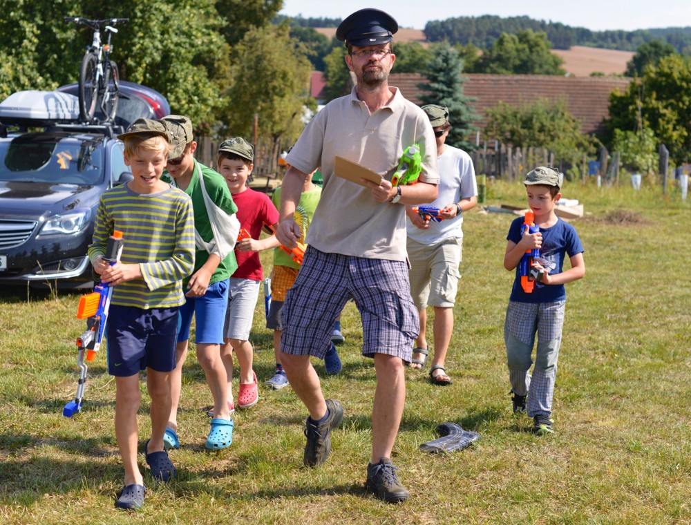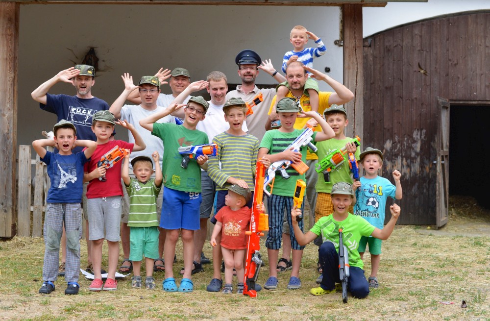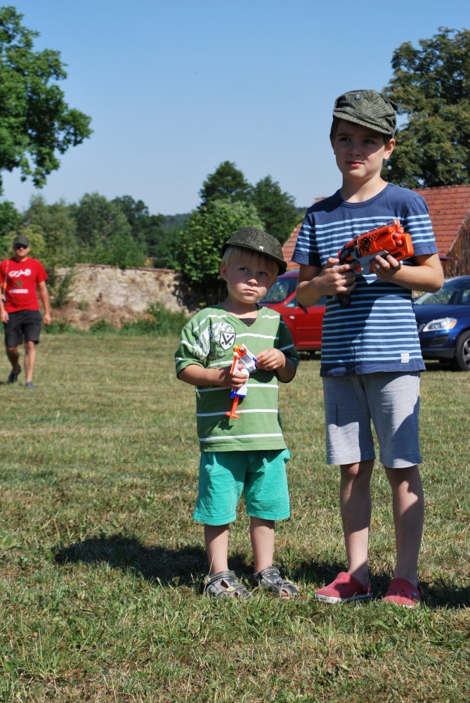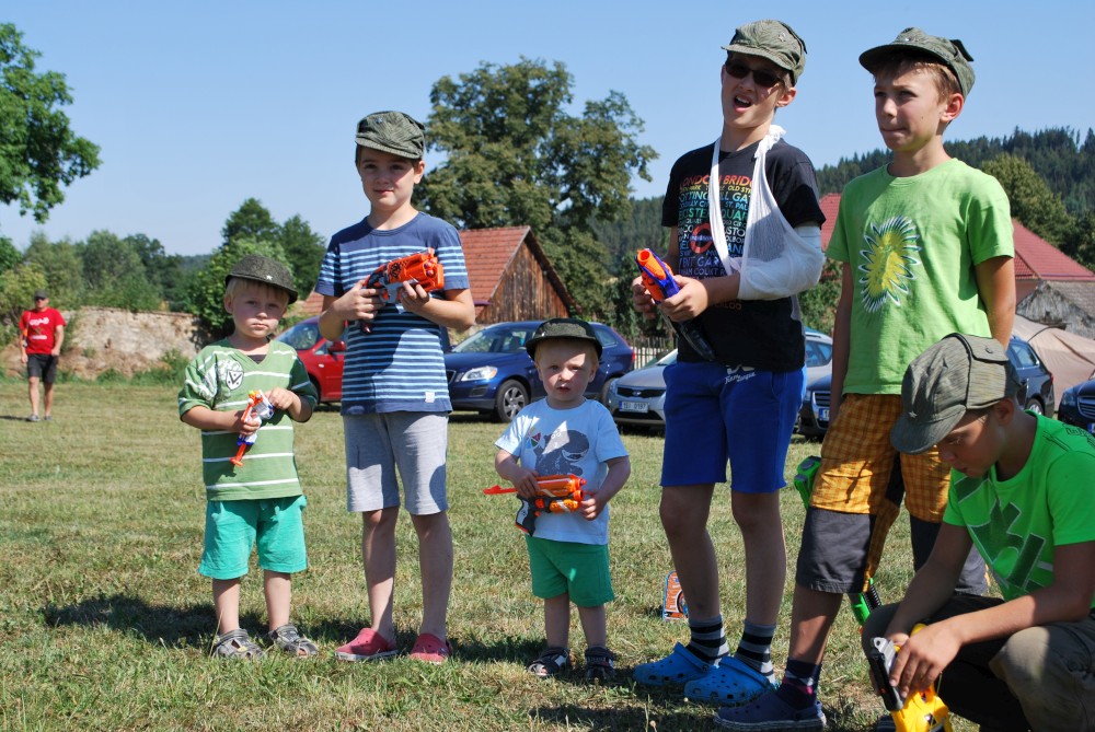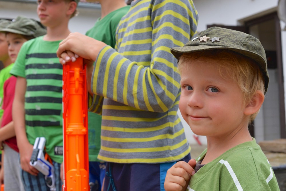 Letos mají kluci na farmě pistolky s molitanovými náboji. Hrají si na vojáky, procházejí výcvikem, plní různé úkoly, dostávají za ně odznáčky na vojenské čepice a také probíhají bitvy tatínků proti synům na louce, kde spíme.