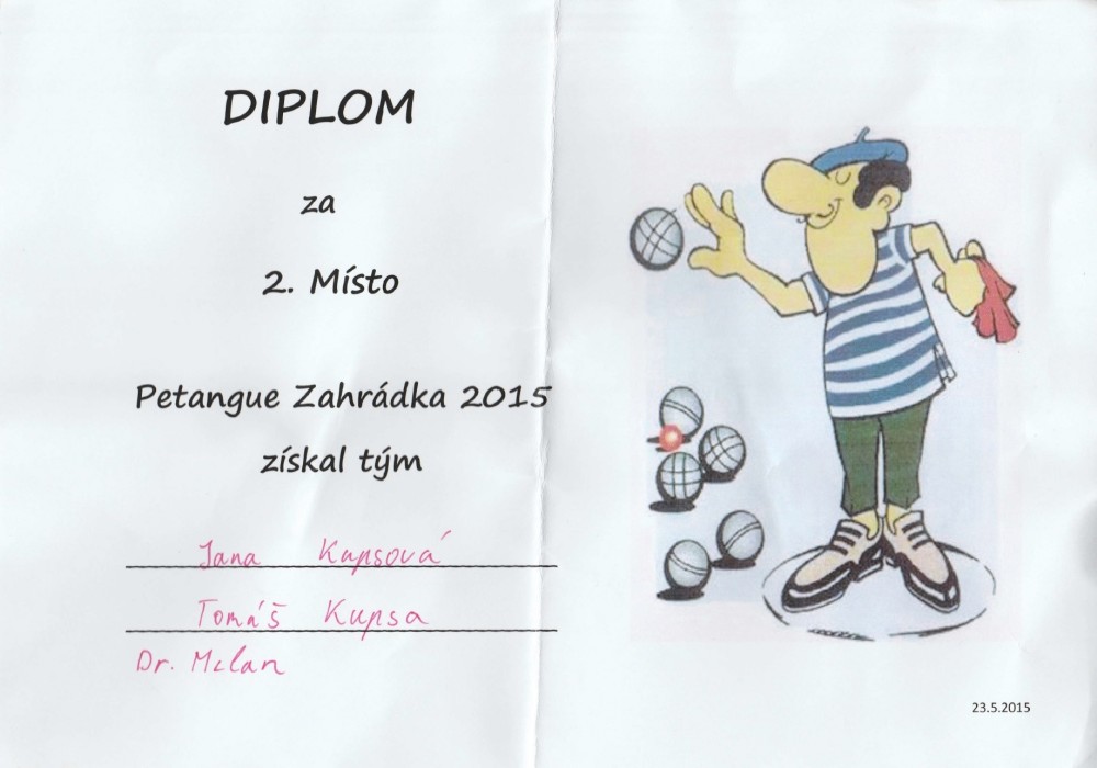 Letos bereme do týmu Mílu a na jednotlivé zápasy se střídáme. Ve hře je 7 týmů. Dolíci a Ticháčci nás poráží, ostatní porážíme my. Stačilo to opět na druhé místo.