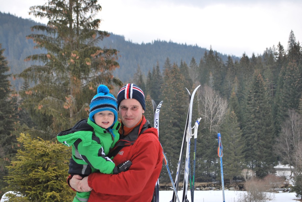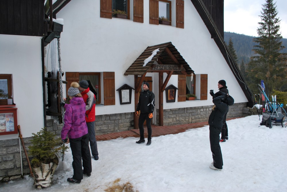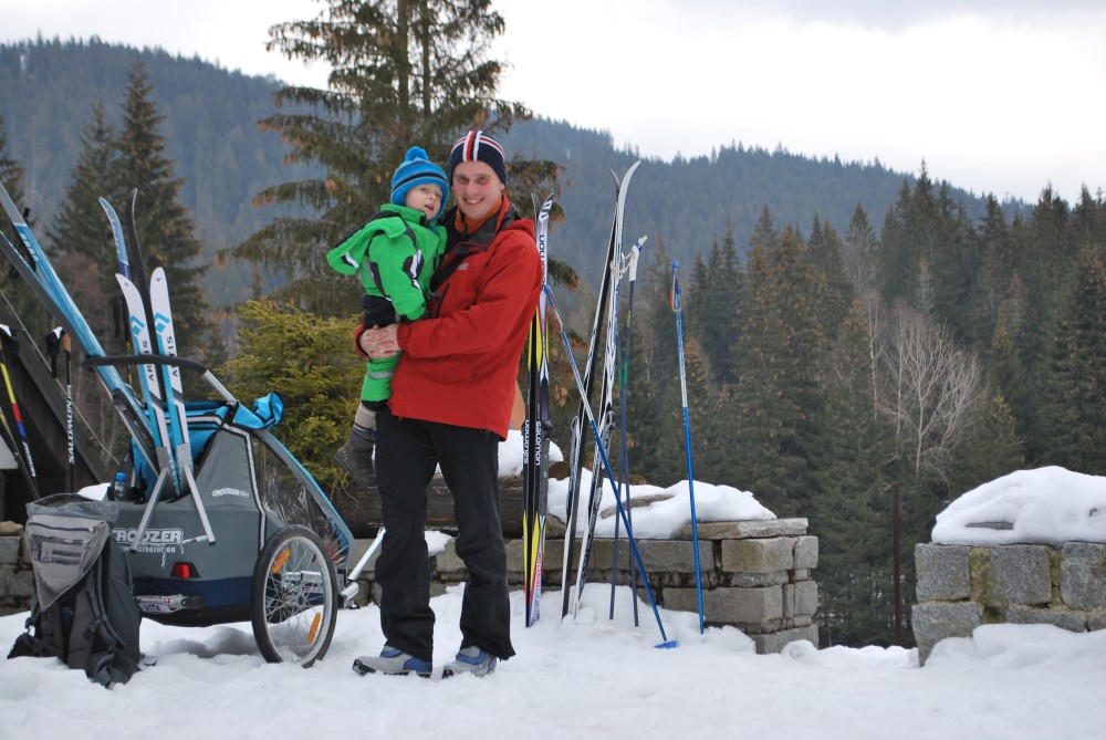 Kolegyně z práce Nikol má pension na Šumavě na Starém Srní. O víkendu tam jedou kolegové z práce a jejich partneři (Monika, Evžen, Katka, Zrnko, Terka, Radek, Dan, Štěpánka, Hanka, Nikol a Marek). Připojím se já s Víťou. Jedeme v pátek navečer. Celou cestu se snažím, aby Víťa neusnul. Povedlo se. Ubytováváme se, dáváme večeři, Víťa jde spát a trávím večer s kolegy. Ráno se připravujeme na běžky. Moc sněhu není, takže radši beru obě varianty vozíku - s běžkami i kolečky.