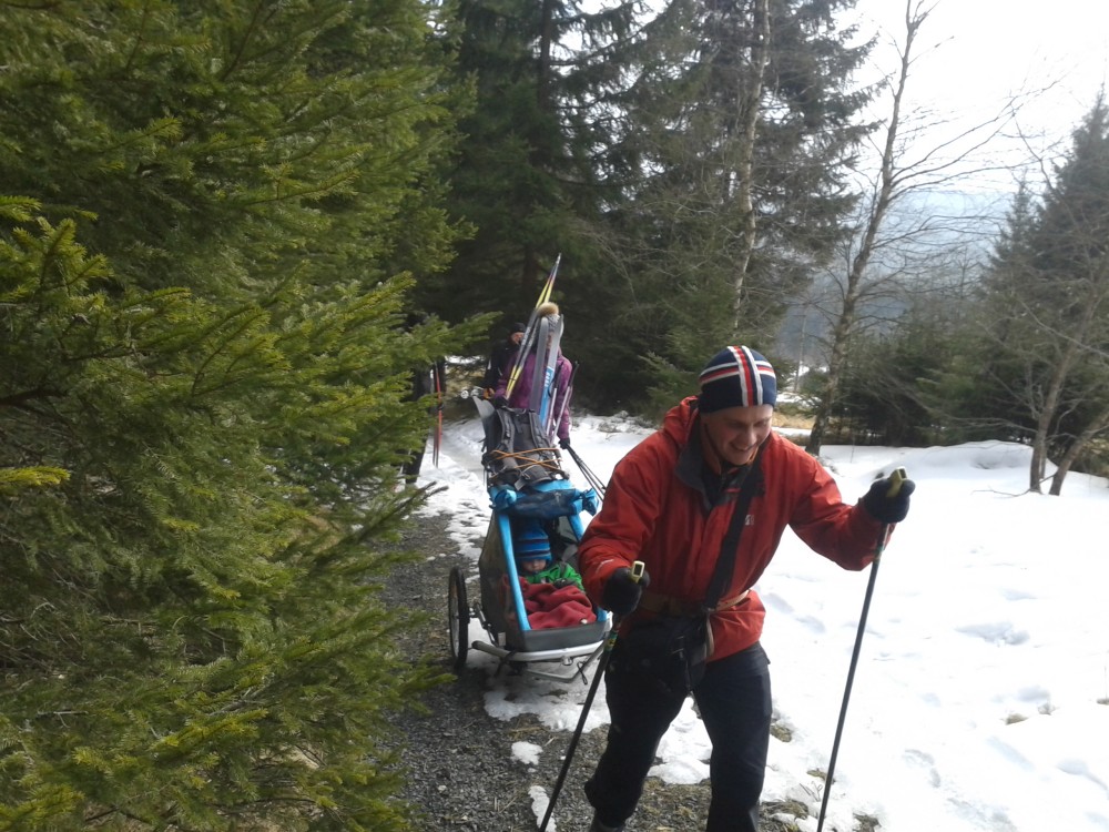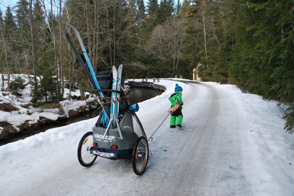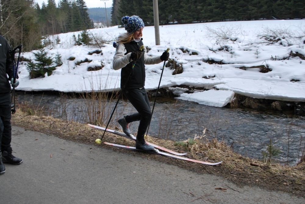 Po obědě pokračujeme z Antýglu do kopce na Horní Hrádky. Tam je cesta hodně dobrodružná. Cesta je jeden velký led. Vydrápat se nahoru s vozíkem byl celkem boj. Ale zvládli jsme to. Chvílemi jede Víťa na kolečkách, chvílemi na běžkách. Kousek za Horními Hrádkami se s Víťou dělíme od ostatních. Ostatní jdou na vyhlídku na viklany. My bychom se tam s vozíčkem nedostali. Pokračujeme tedy zpět do Srní.