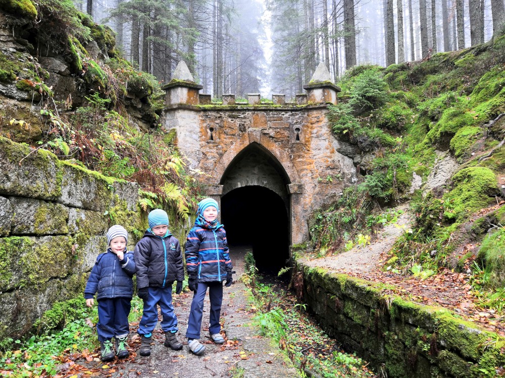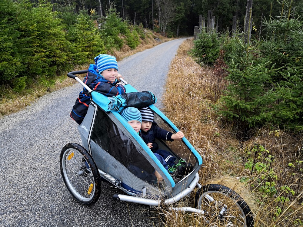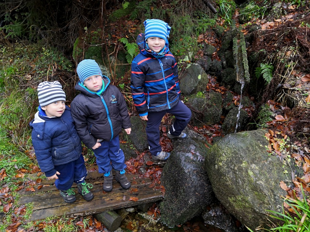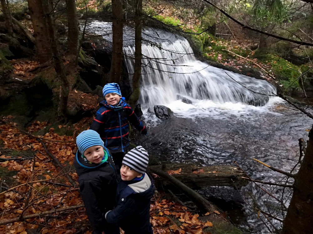 Na Jelení stezce nasedají do vozíku všichni kluci, takže cesta už celkem odsýpá. Dáváme krátkou pauzu u vodopádu a pak ještě u Rosenauerovy kaple. Pak už znovu podél kanálu zakončujeme okruh v Jeleních vrších. Sedáme do auta a jedeme domu. Super výlet. Bylo to asi 14 km. Kluci ušli sami tak půlku.