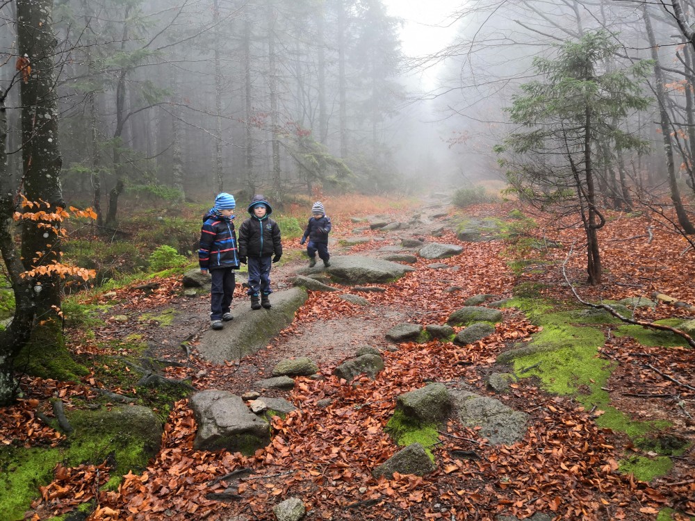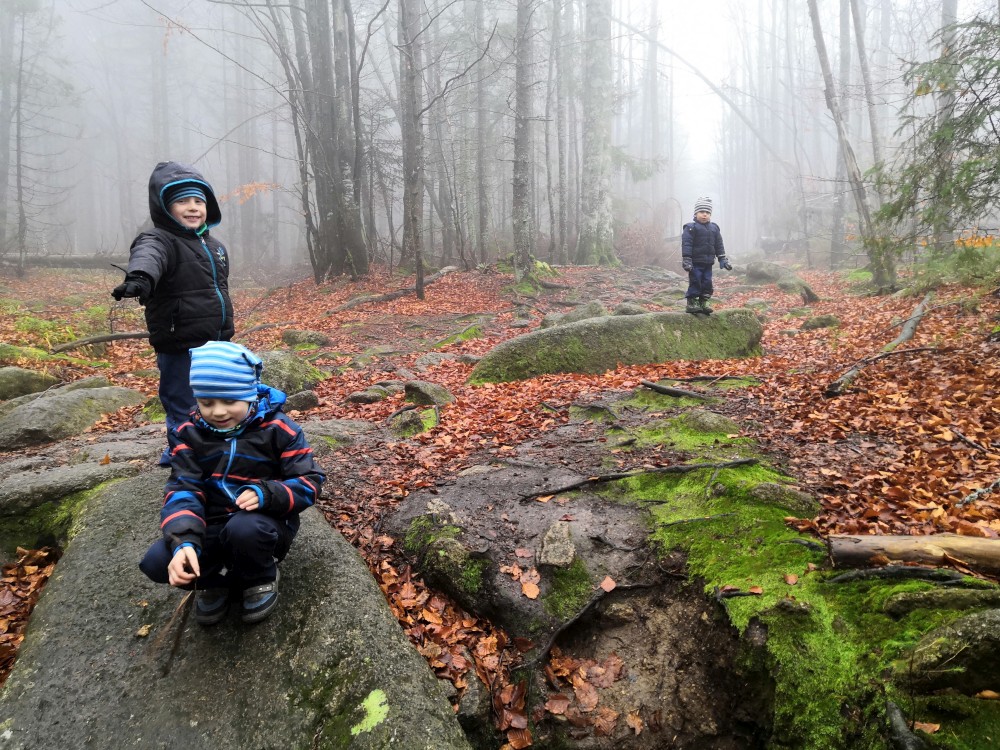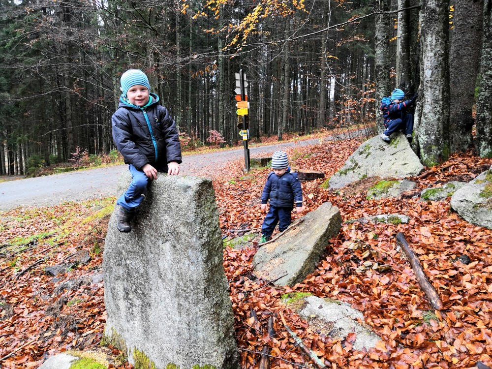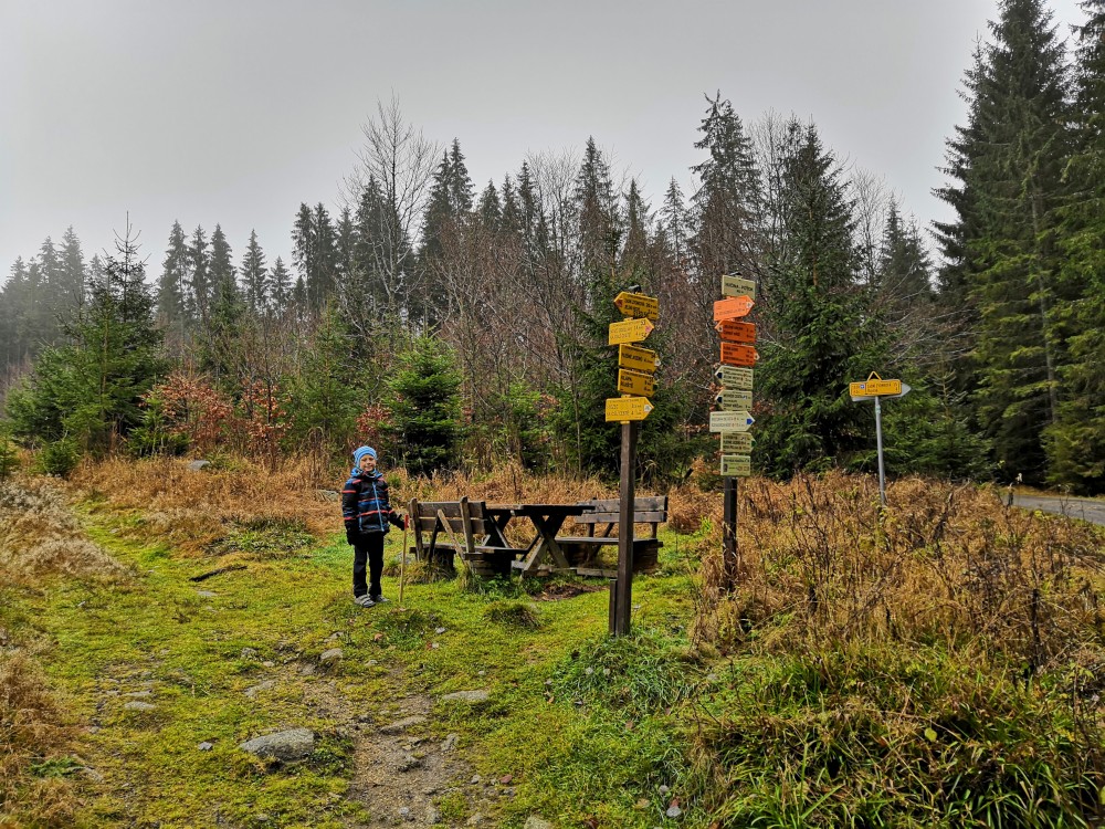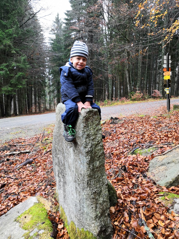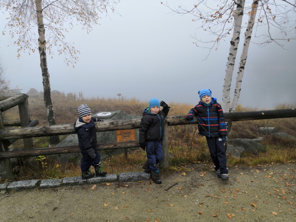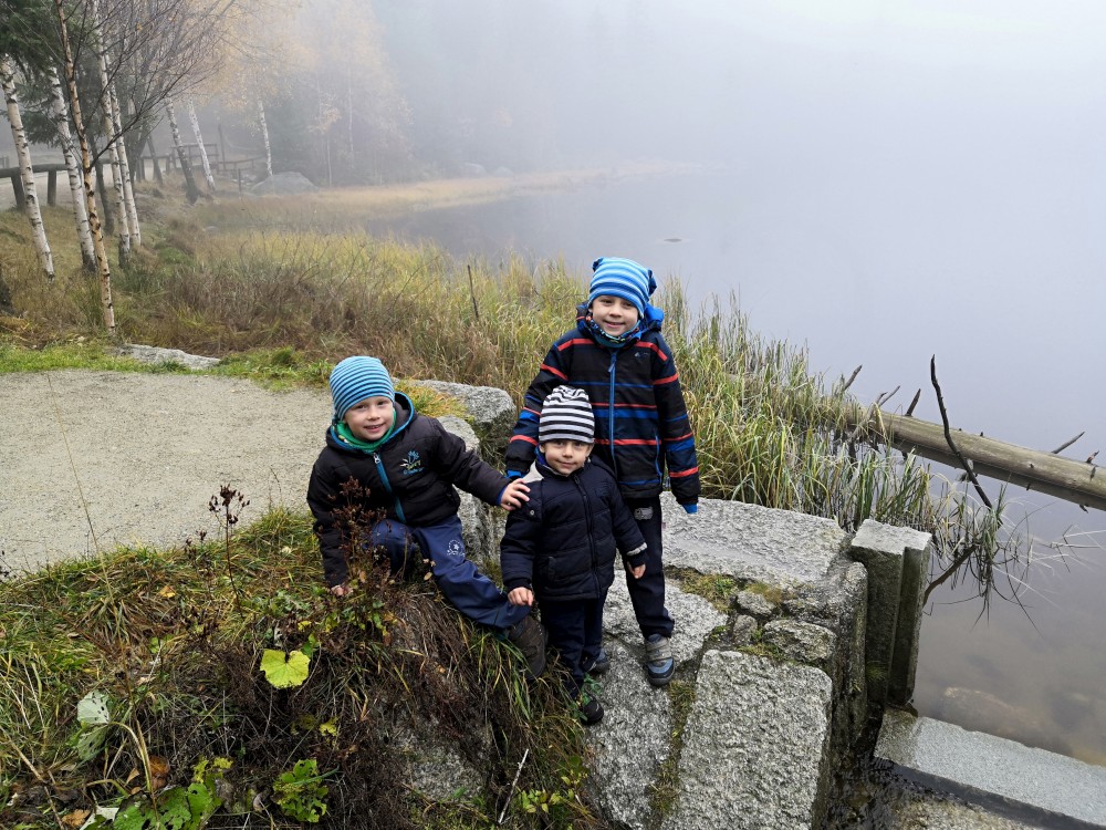 Jana jede na víkend s holkama do Prahy. My vyrážíme s klukama na Šumavu na jednodenní výlet. Parkujeme v obci Jelení Vrchy. Nejdříve si dáváme zelňačku na posilněnou ve stejnojmenném občerstvení. Pak už vyrážíme na Plešné jezero.