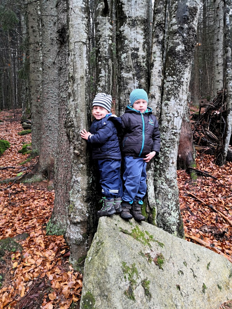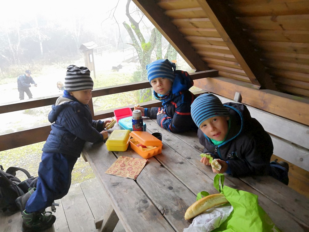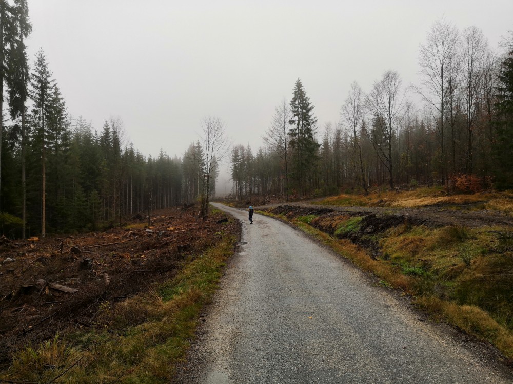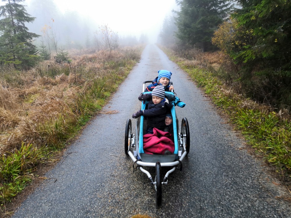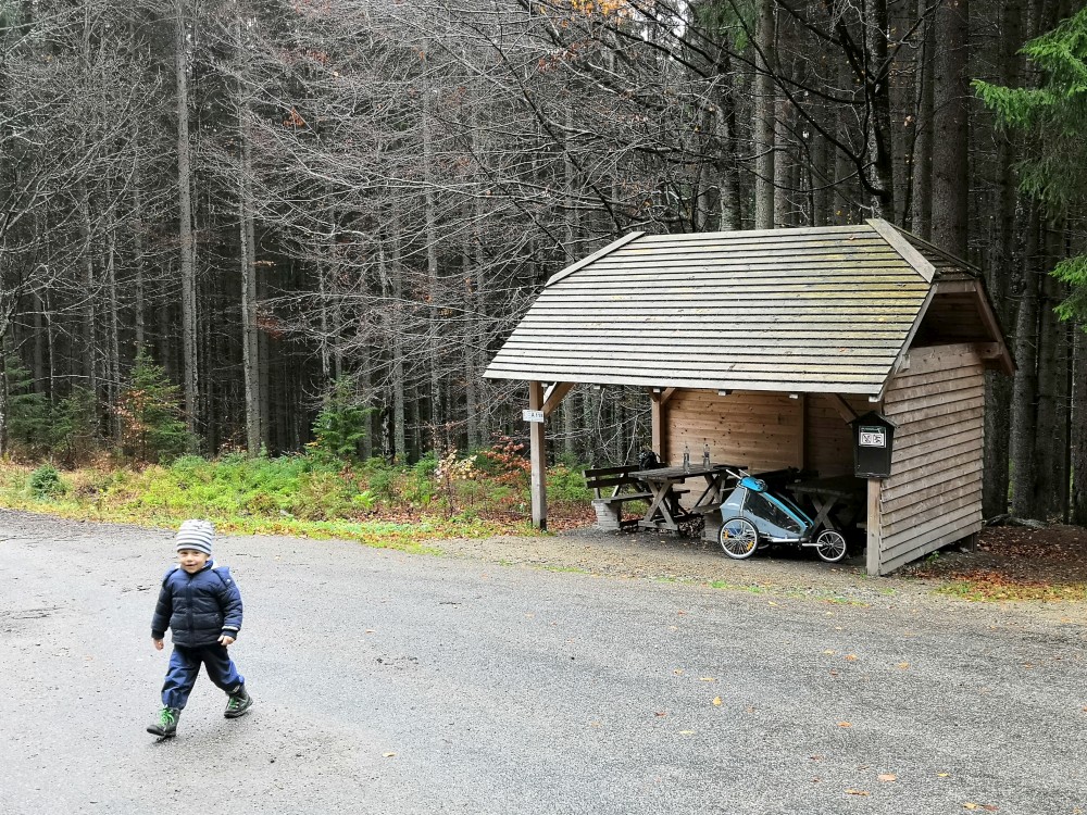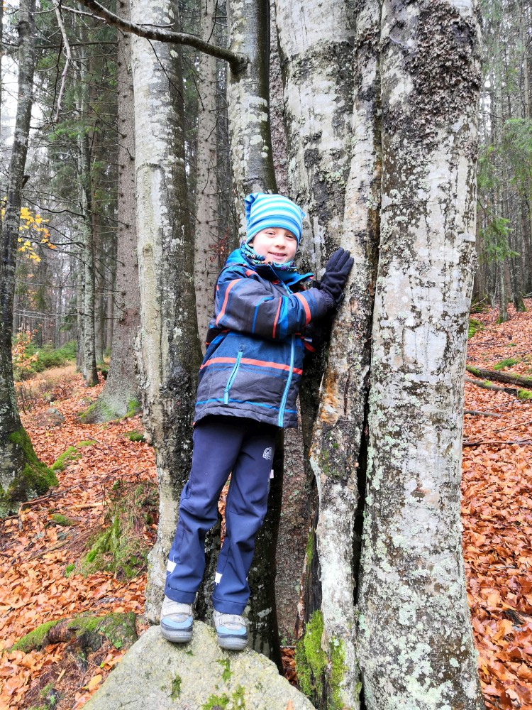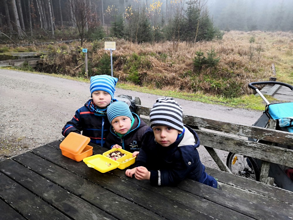 Jana jede na víkend s holkama do Prahy. My vyrážíme s klukama na Šumavu na jednodenní výlet. Parkujeme v obci Jelení Vrchy. Nejdříve si dáváme zelňačku na posilněnou ve stejnojmenném občerstvení. Pak už vyrážíme na Plešné jezero.