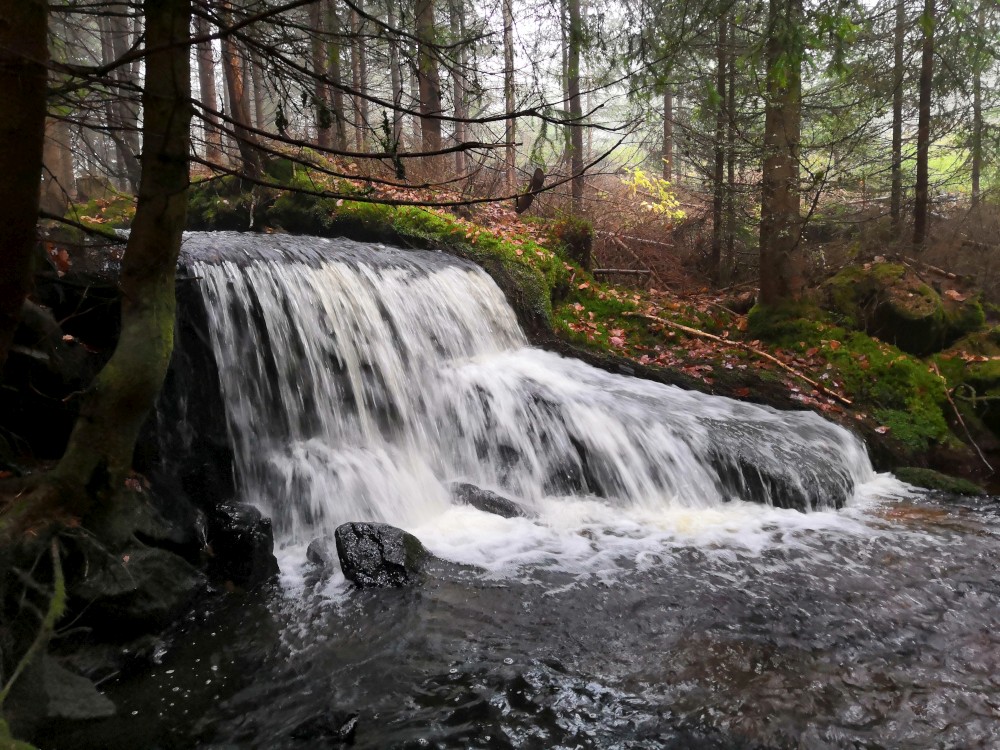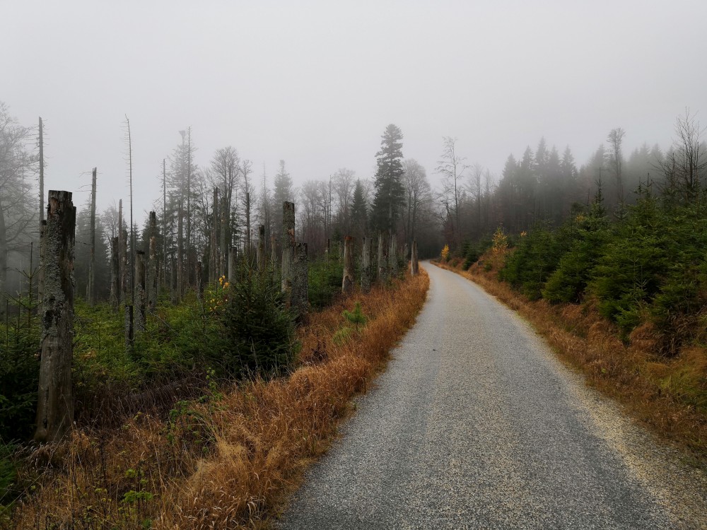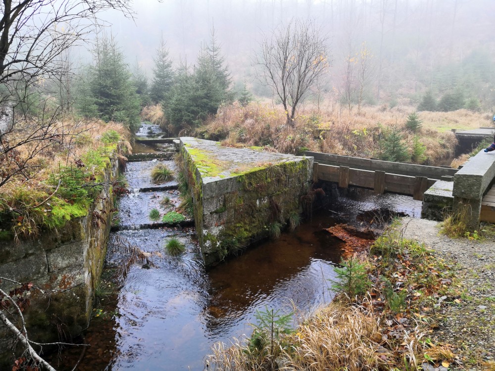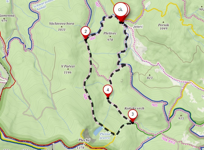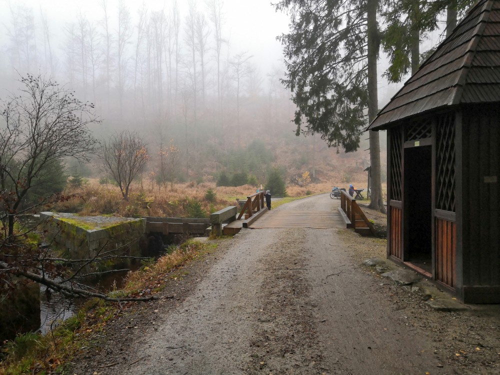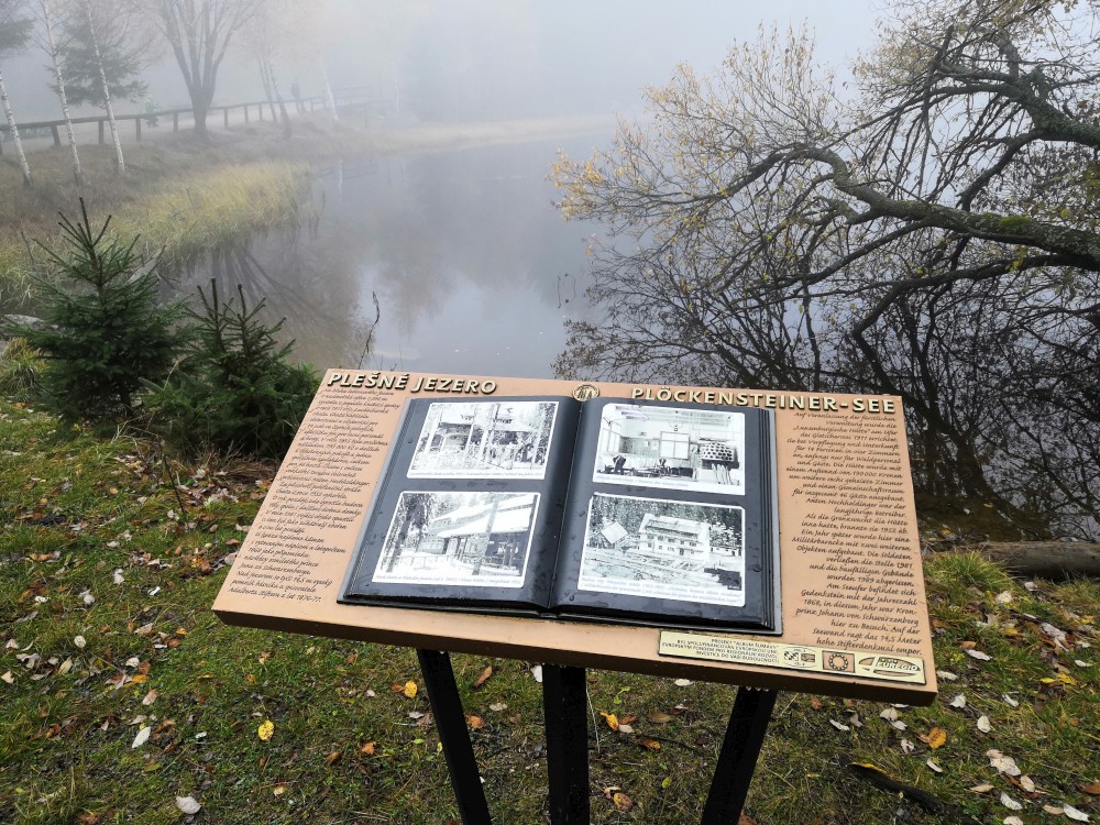 Jdeme kolem Schwarzenberského kanálu. Nejdříve kolem dolního, pak kolem horního portálu tunelu. Pokračujeme po modré turistické značce, od rozcestníku Hučina - potok po zelené. Dáváme si svačinku u odpočívadla U stříšky. Pak jdeme do kopce až k Plešnému jezeru. Všude kolem nás barevný šumavský podzim.