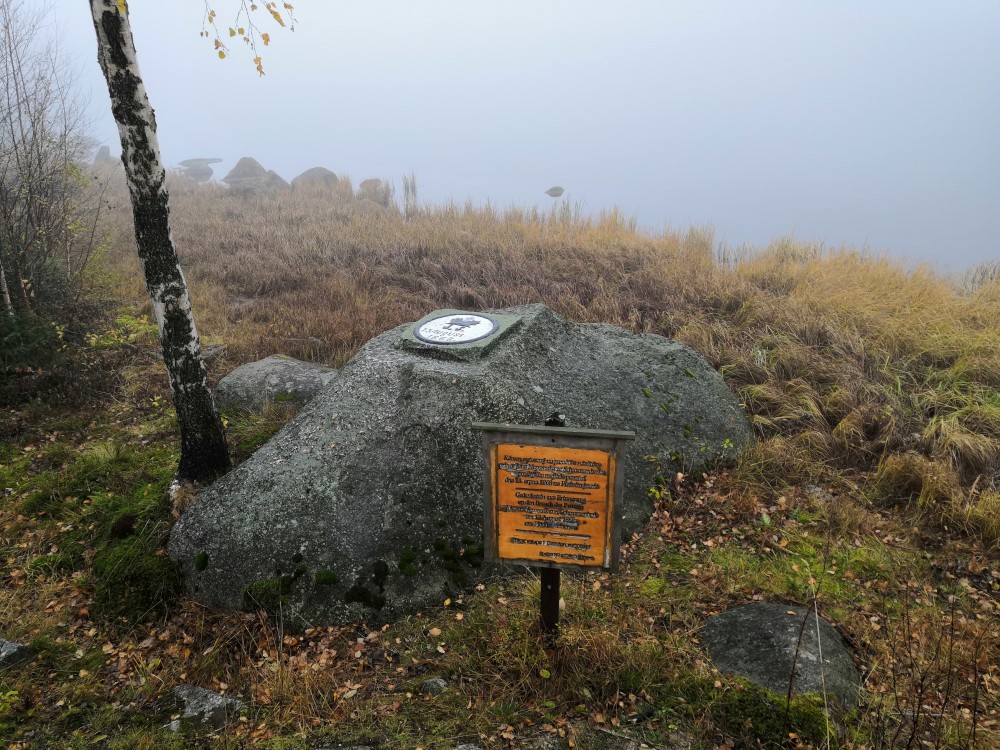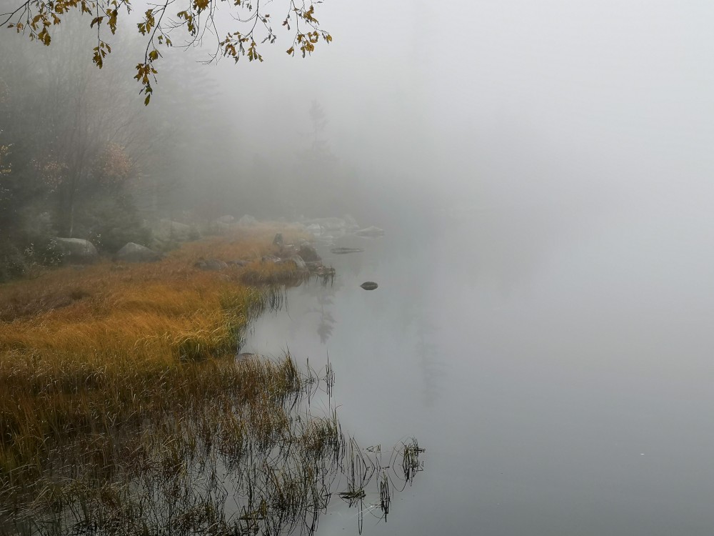 Plešné jezero je v mlze. Vidíme jen pár metrů od břehu. Víťa celou cestu nahoru oportunisticky tvrdil, že to není žádné jezero, ale tůňka. Těšil jsem se, jak mu ukážu poměrně velké jezero, ale mlha to překazila. Víťa tedy mohl prohlásit "Vidíš, je to jen tůňka" :-).