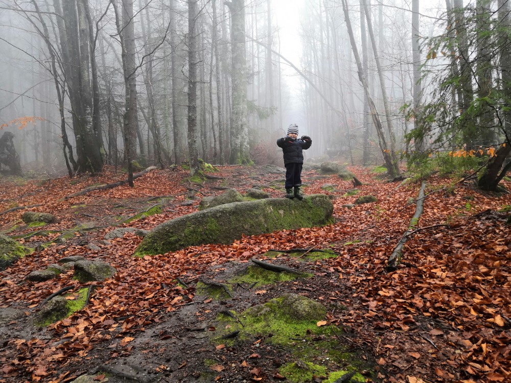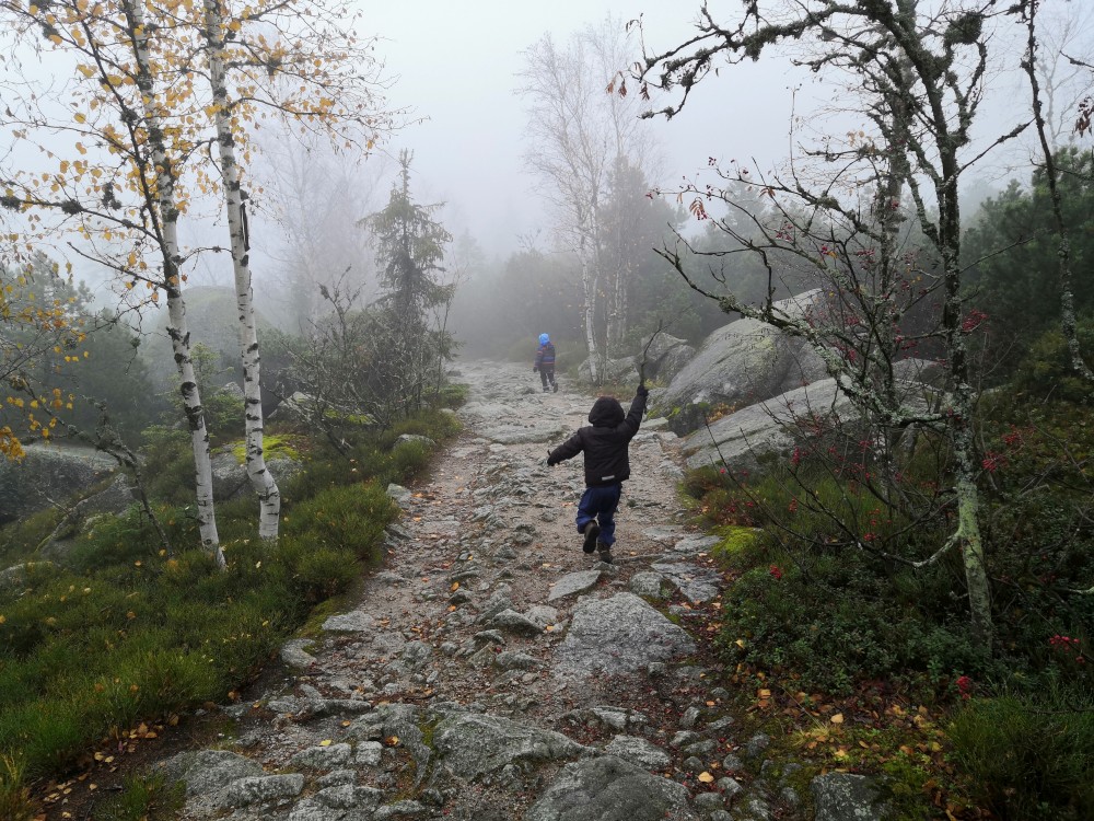 Po další svačince jdeme po žluté přes kamenné moře. S vozíkem je to celkem zábava. Pak klesáme po zelené až na rozcestí Jezerní stezka. Martínek usíná ve vozíku a cesta s vozíkem přes velké kameny je dost náročná.