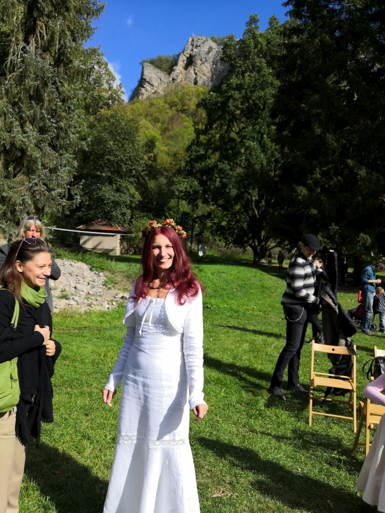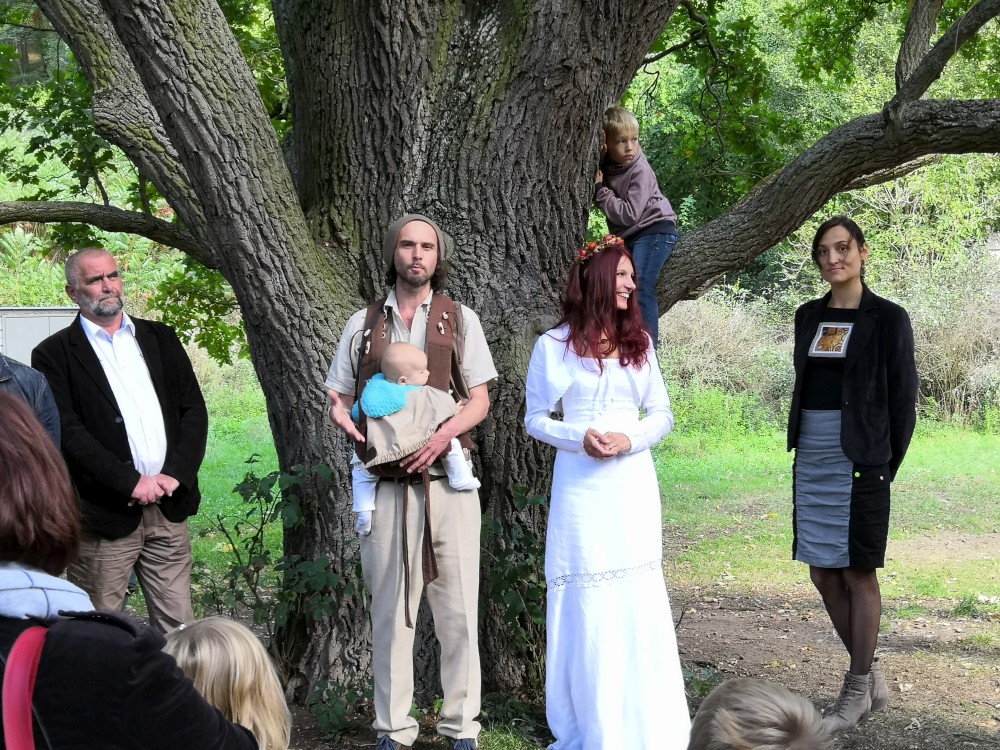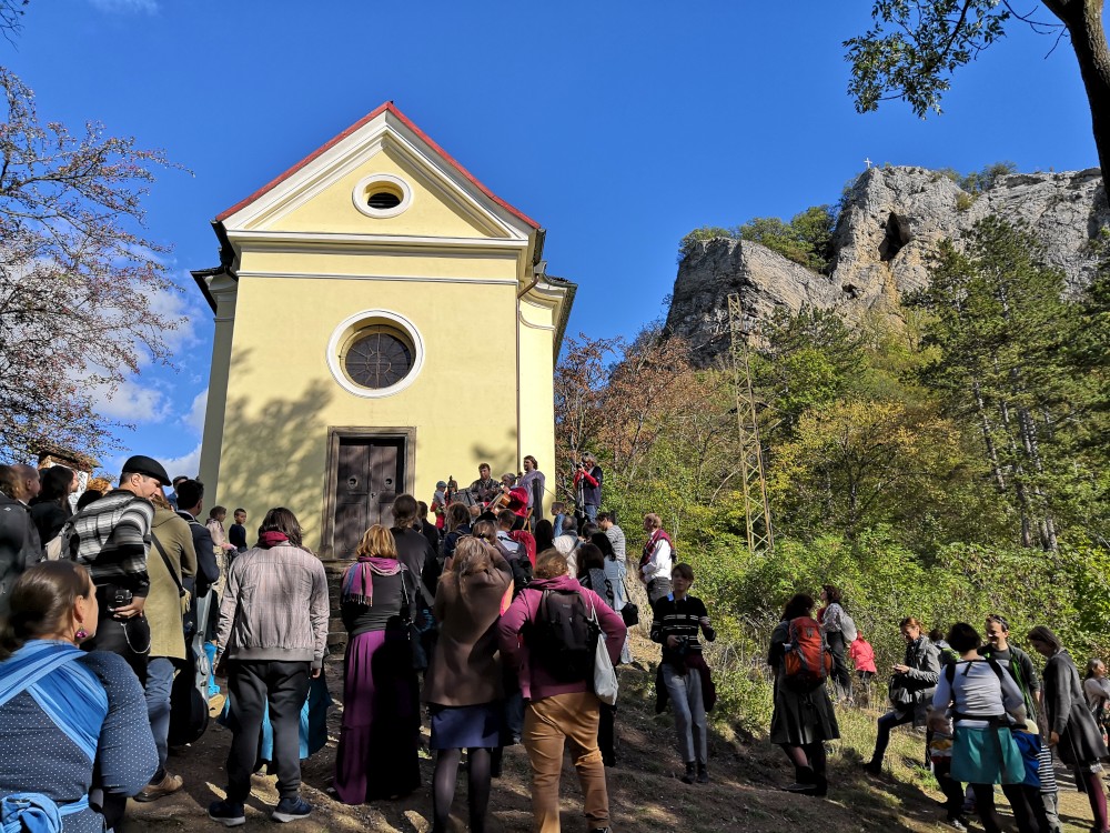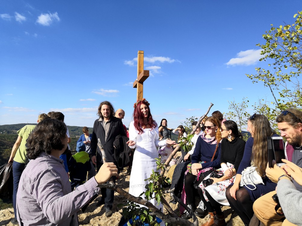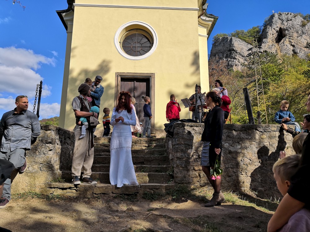 Pavla je ve svatebních šatech. Čeká nás několik duchovních a hudebních zastavení. Nejprve v zahradě pod dubem, pak v kostele Narození sv. Jana Křtitele. Pak pokračuje svatební družina do kopce ke kapličce, kde si Pavla s Jarynem mění prstýnky. Pak už stoupáme na vrchol. Kocháme se krásnými výhledy.