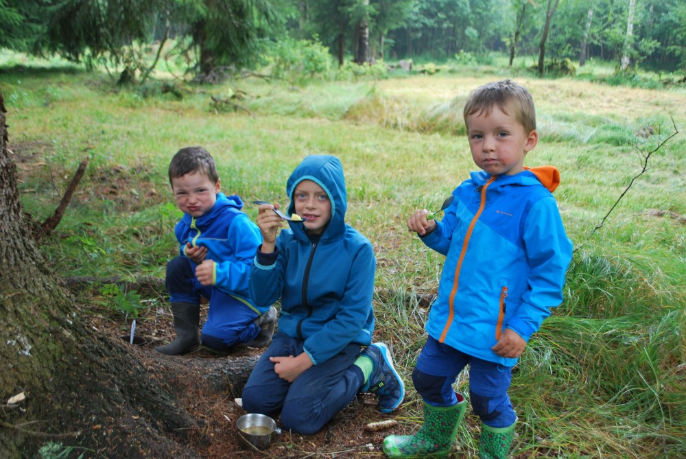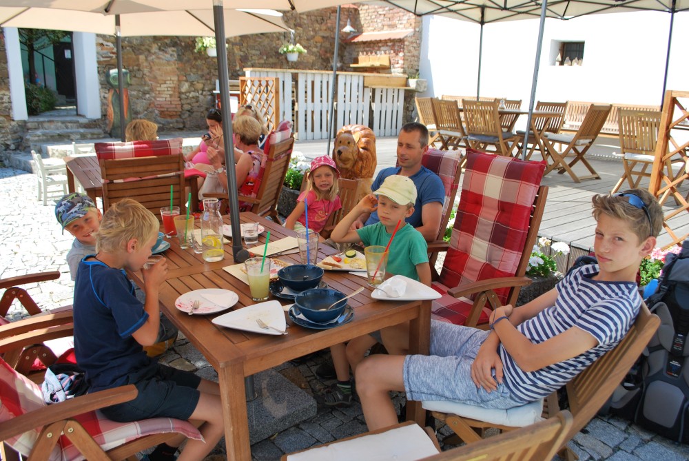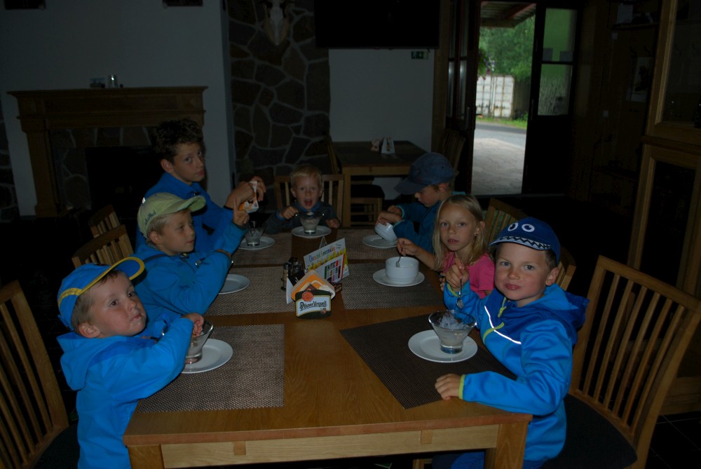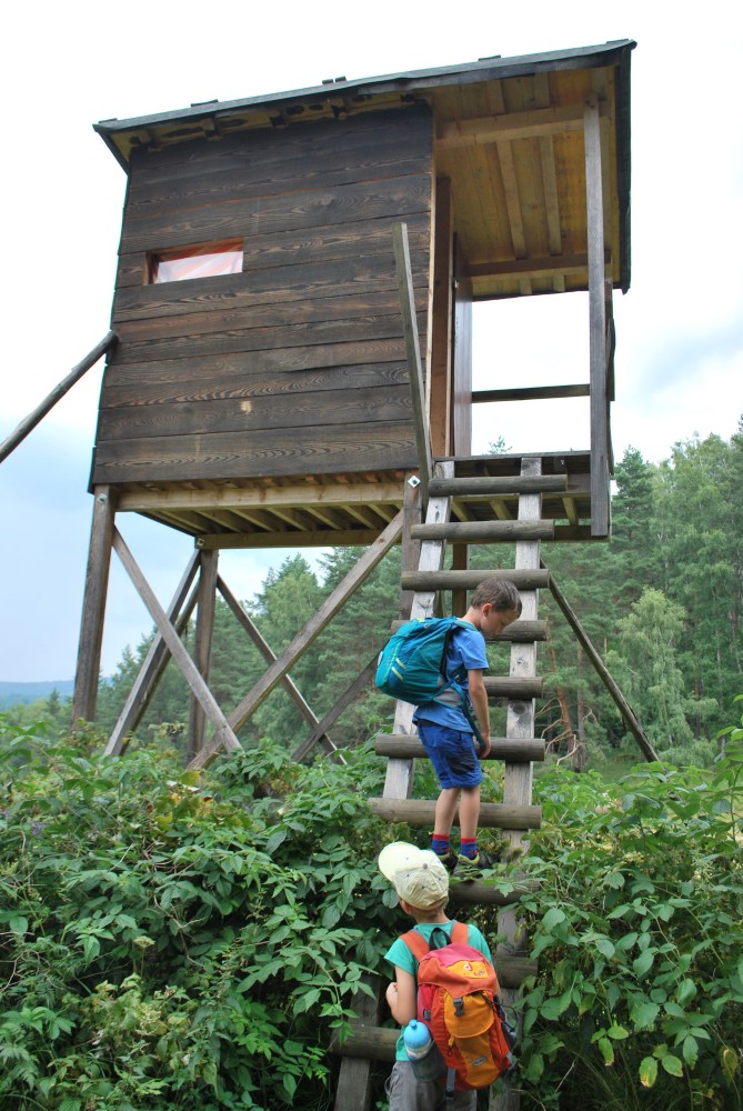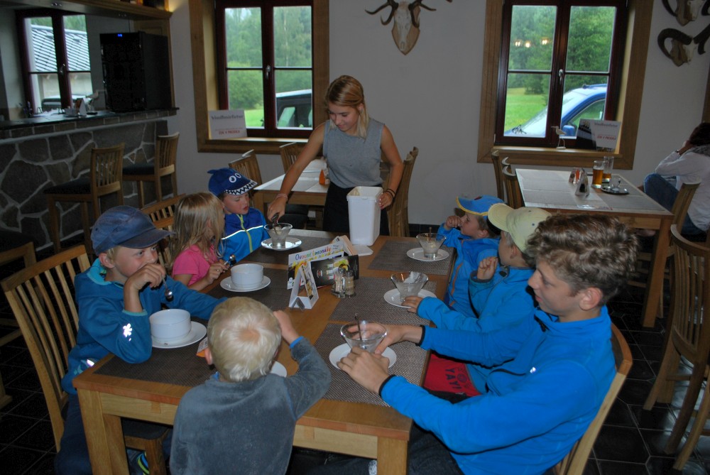 Děti se zase brodí Malší. Déšť je mírnější, ale úplně neustává. Balíme ale věci a vydáváme se pokračovat v cestě. Máme plán dorazit k restauraci Jelení vyhlídka. To se nám daří. Restaurace je otevřená, takže si zasloužíme odměnu. Dáváme něco k pití, jídlu, děti odměňujeme také zmrzlinou.
