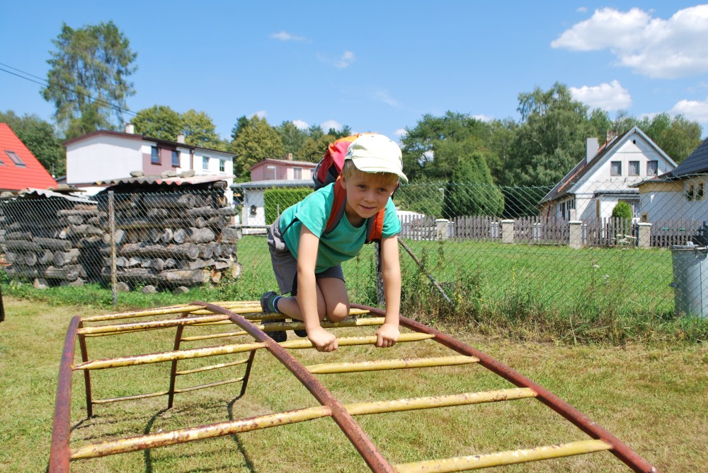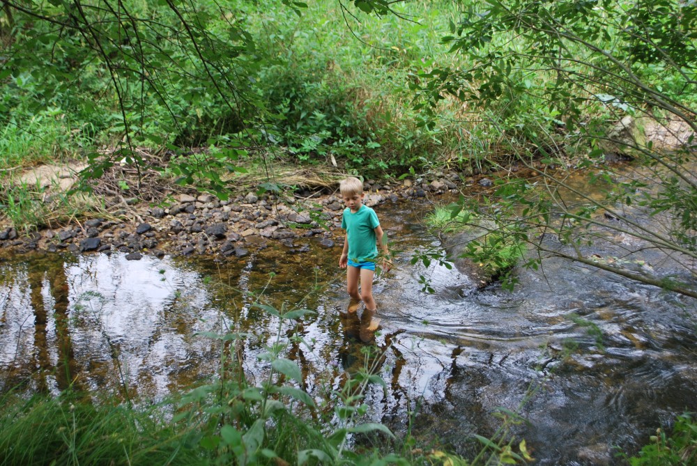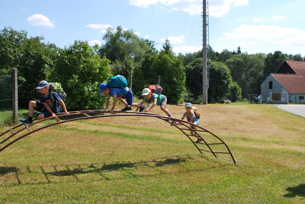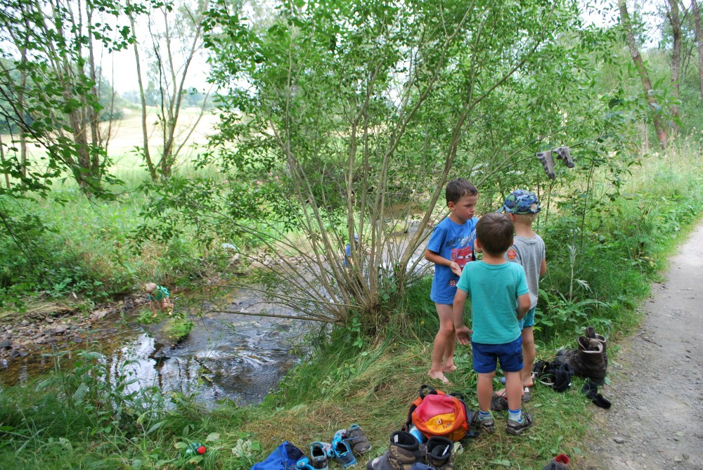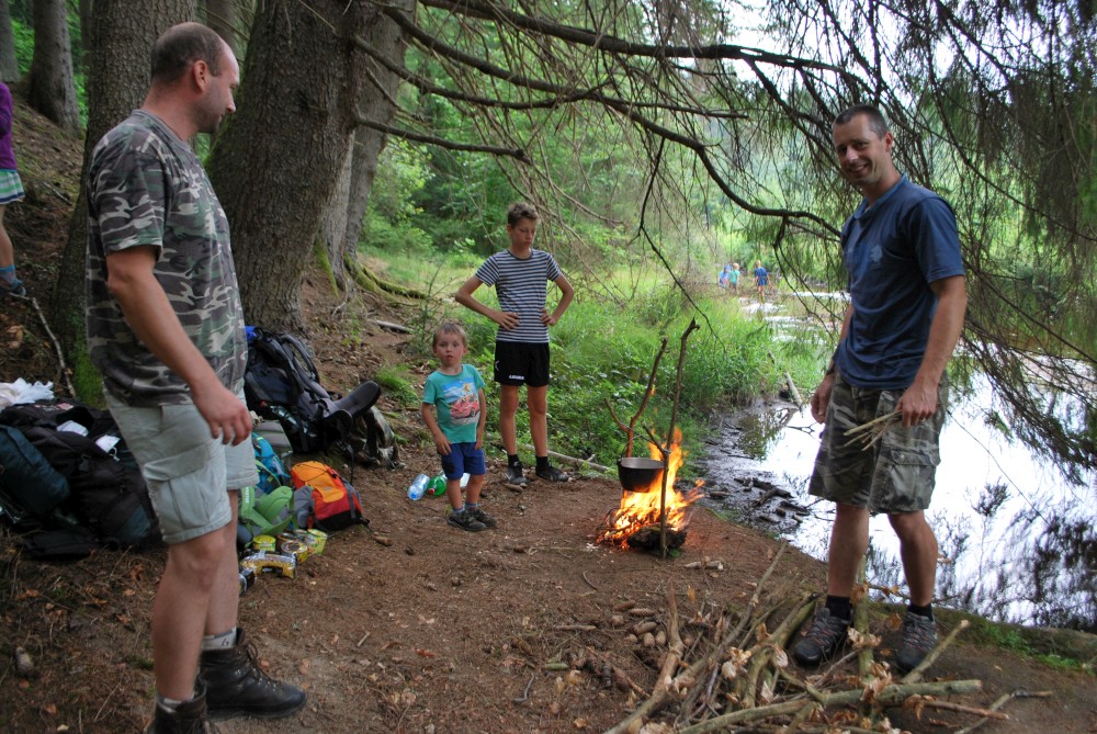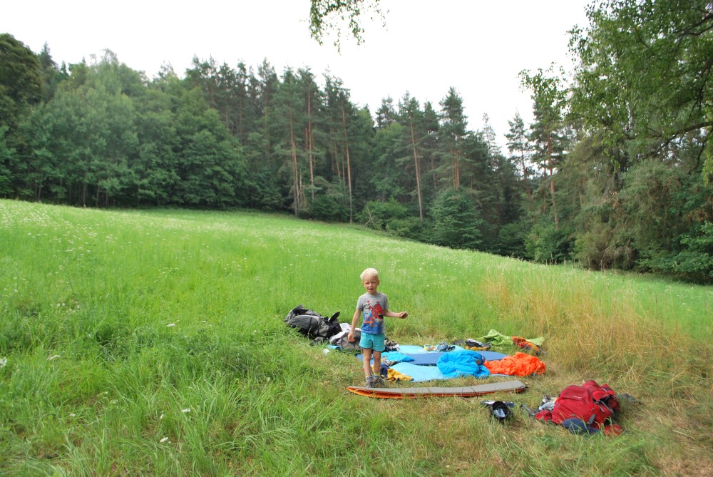 Vystupujeme v Tiché, je dost velké horko. Děti si chvíli pohrají na místních prolejzačkách a můžeme vyrazit směr Cetviny. Cesta jde celkem pomalu, ale nakonec se dostáváme ke kostelu v Cetvinách. Odtud vyrážíme po žluté a zelené k Malši. Dáváme se koupačku v potoce a začínáme hledat místo na spaní. Pepa a Jirkou jdou hledat, já hlídám děti. Kluci se dlouho nevrací, tak jdeme hledat s dětma místo také.