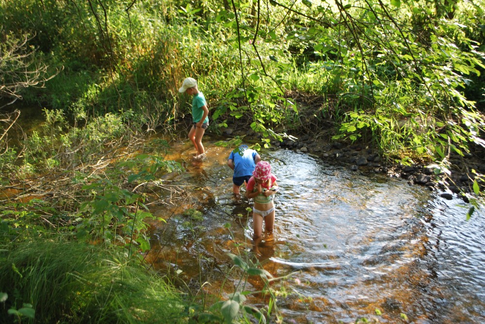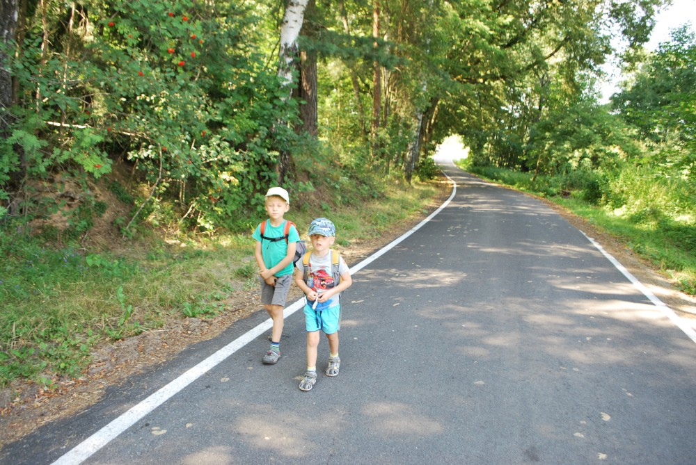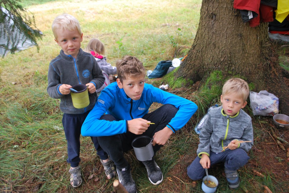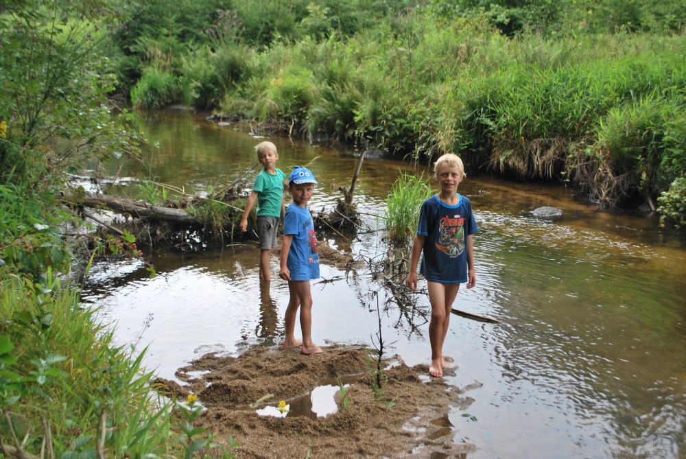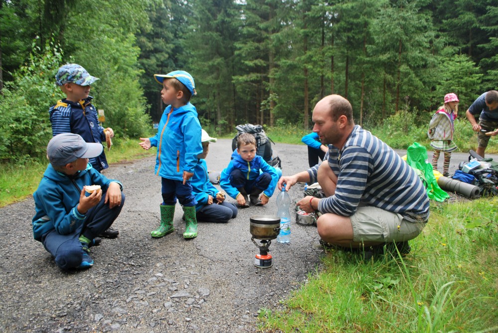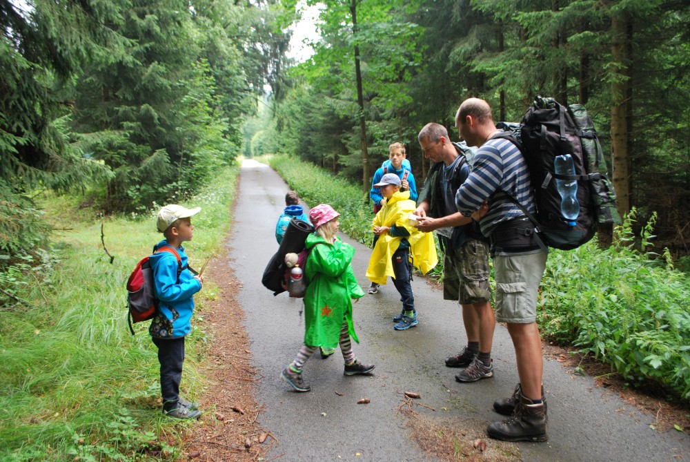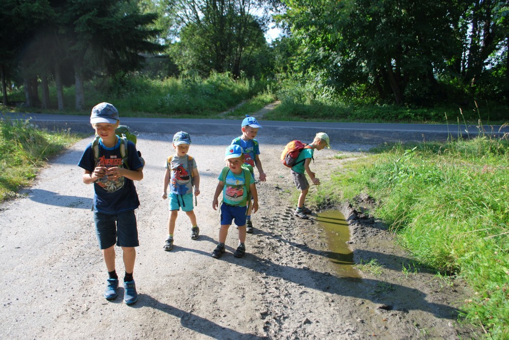 Vystupujeme v Tiché, je dost velké horko. Děti si chvíli pohrají na místních prolejzačkách a můžeme vyrazit směr Cetviny. Cesta jde celkem pomalu, ale nakonec se dostáváme ke kostelu v Cetvinách. Odtud vyrážíme po žluté a zelené k Malši. Dáváme se koupačku v potoce a začínáme hledat místo na spaní. Pepa a Jirkou jdou hledat, já hlídám děti. Kluci se dlouho nevrací, tak jdeme hledat s dětma místo také.
