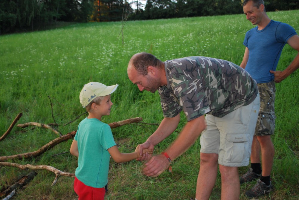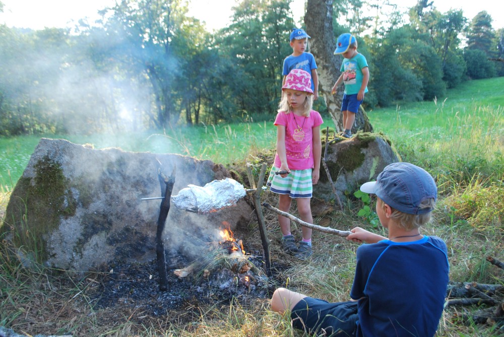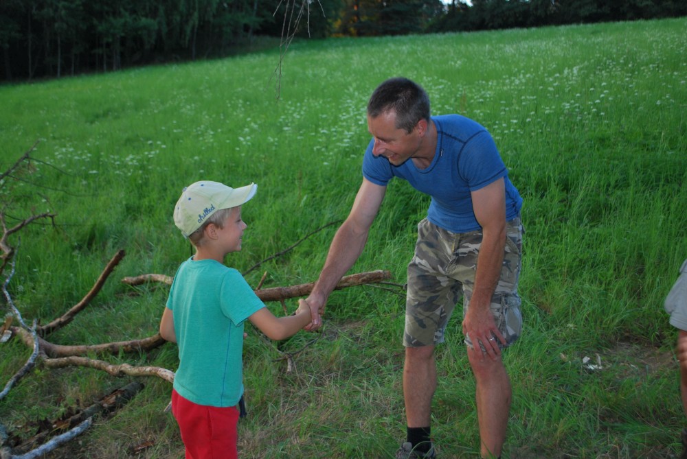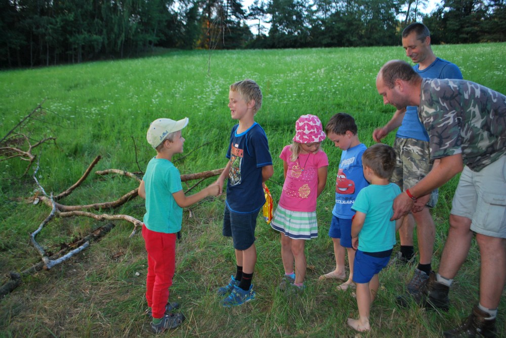 Vybalujeme, připravujeme ohniště, zapalujeme oheň a začínáme péct. Víťa má dnes narozeniny, dostává přání a dárečky. Kuřata jsou hotová až kolem jedenácté večer. Dost pozdě na večeři. Ale děti vydržely a na kuřátku si moc pochutnaly.