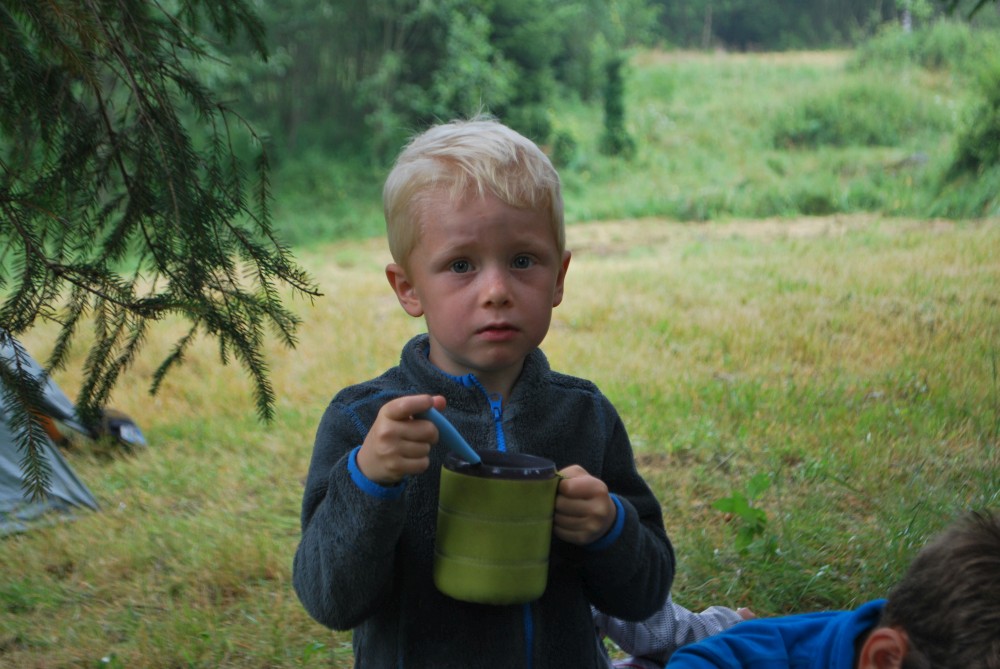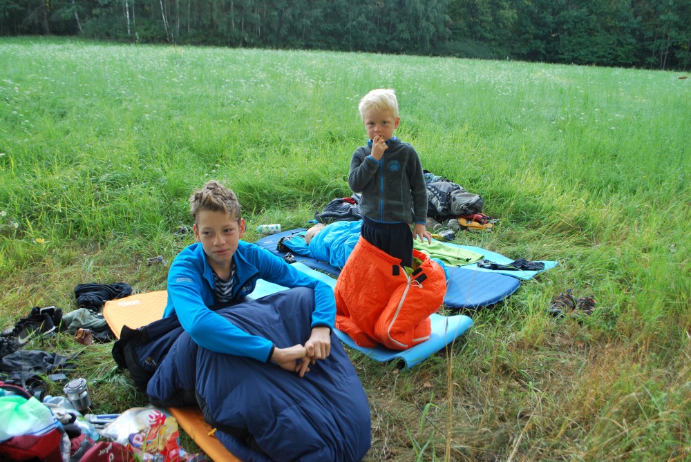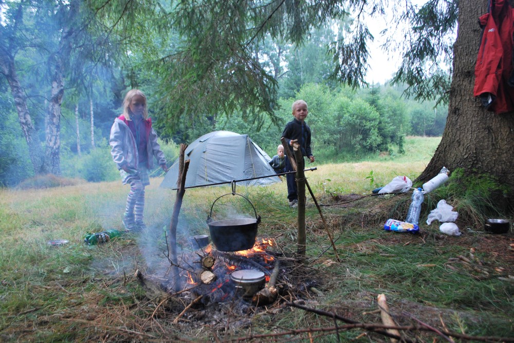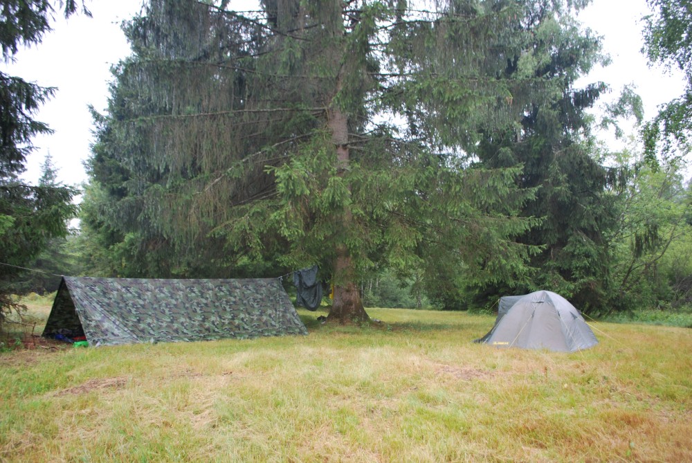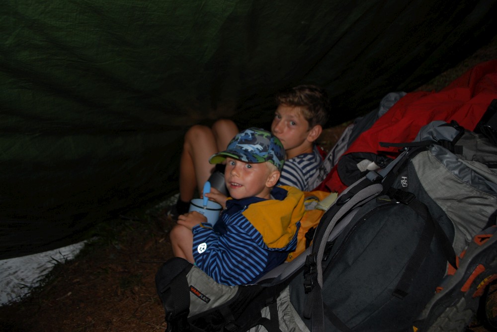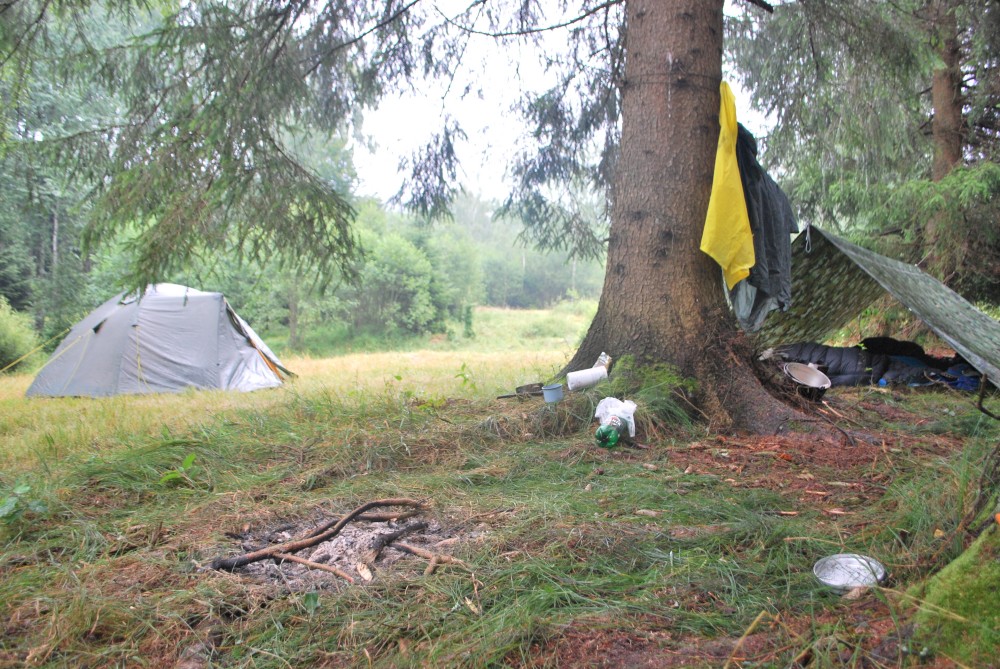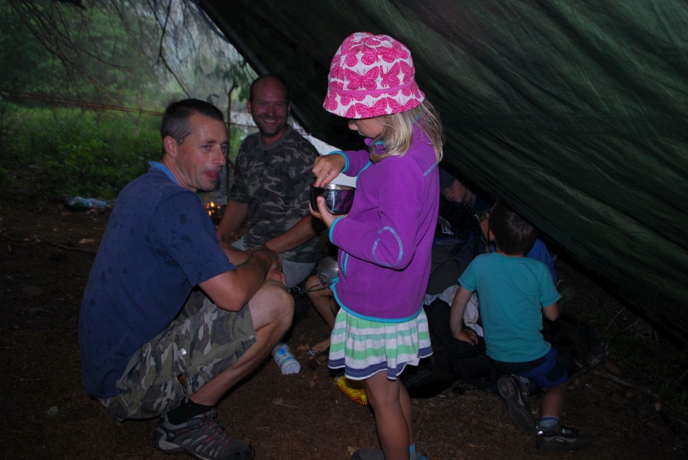 Stavíme plachtu, na dnešní noc i stan, uspáváme děti. Hledáme nějaké suché dřevo na oheň. To se moc nedaří, ale nakonec se nám ohýnek rozdělat podařilo. Pořád ale trochu prší, takže je z toho jen takové malé večerní posezení u stále čoudícího a umírajícího ohně.