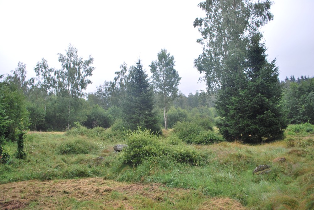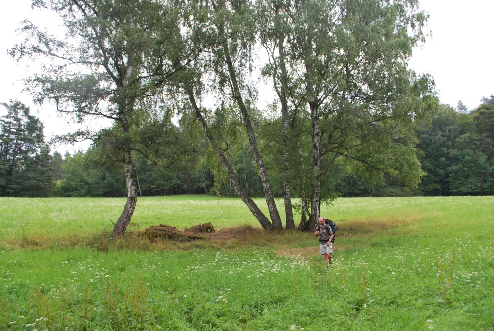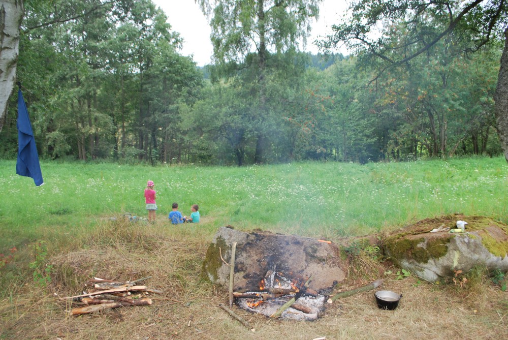 Terén není ideální, je tu hodně kopřiv. Nakonec ale nacházíme moc pěkné místo - louka uzavřená mezi lesy, kde se dá u velkého kamene udělat oheň na kuřata, která vezeme s sebou a chceme si je upéct. Po chvíli dorážejí kluci, místo našli, ale toto je prý lepší :-).