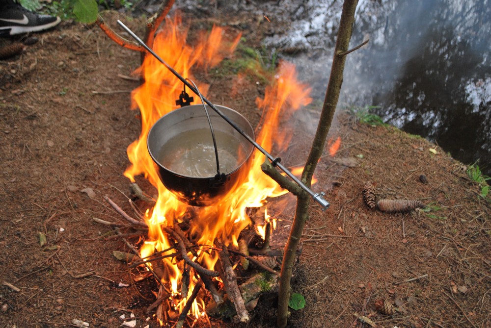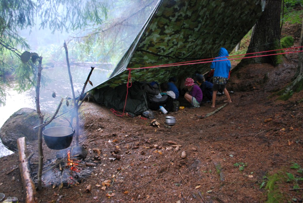 Dáváme tedy zastávku pod stromy u Malše, natahujeme plachtu mezi stromy. Právě včas protože pršet začíná opravdu vydatně. Schováváme se pod plachtou, vedle děláme ohýnek a za deště vaříme oběd.