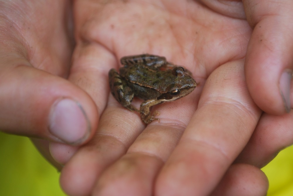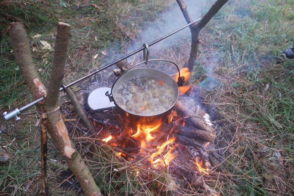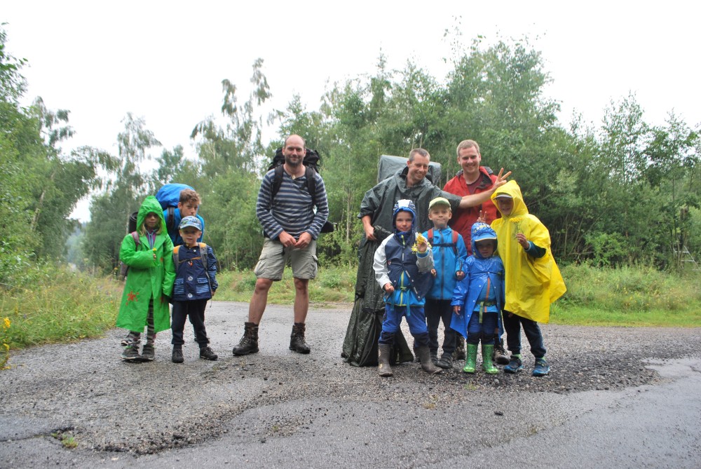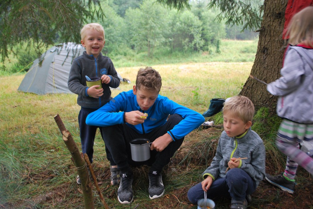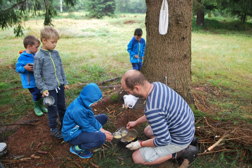 V neděli ráno rozděláváme oheň a vaříme na včerejšek plánovanou bramboračku. Je moc dobrá. Zase začíná pršet. Balíme, bereme pláštěnky a vyrážíme na cestu. Jdeme přes Dolní Příbrání až do Leopoldova. Cestu nám zpestřují různé hry, děti také chytají žáby.