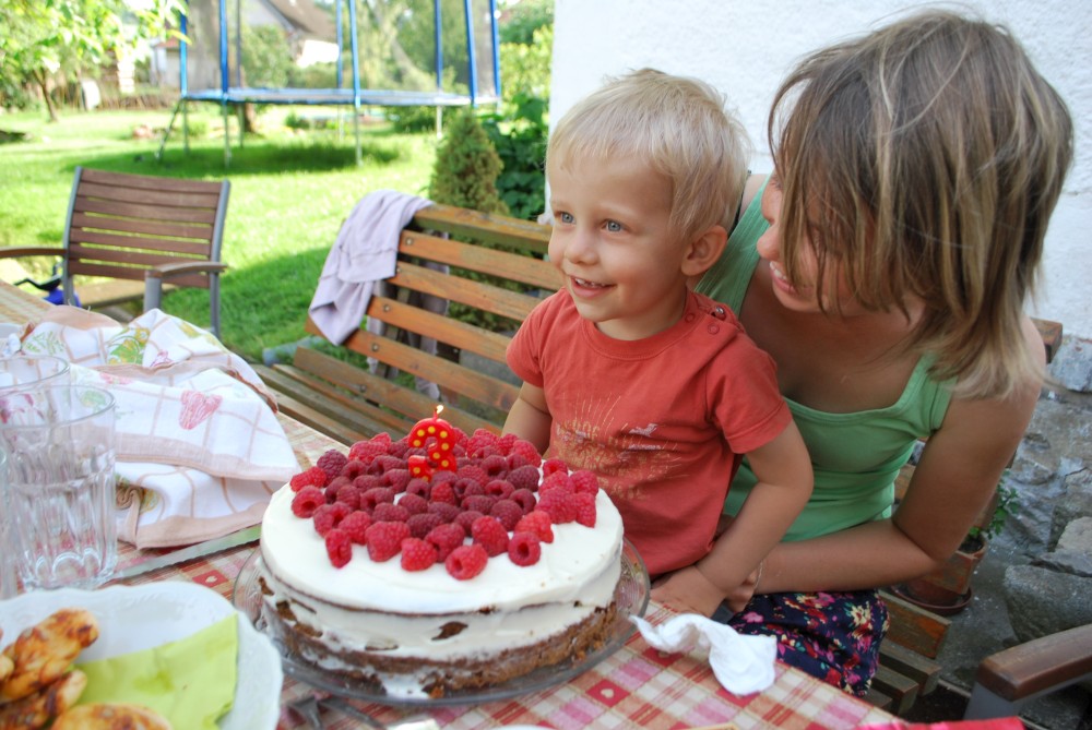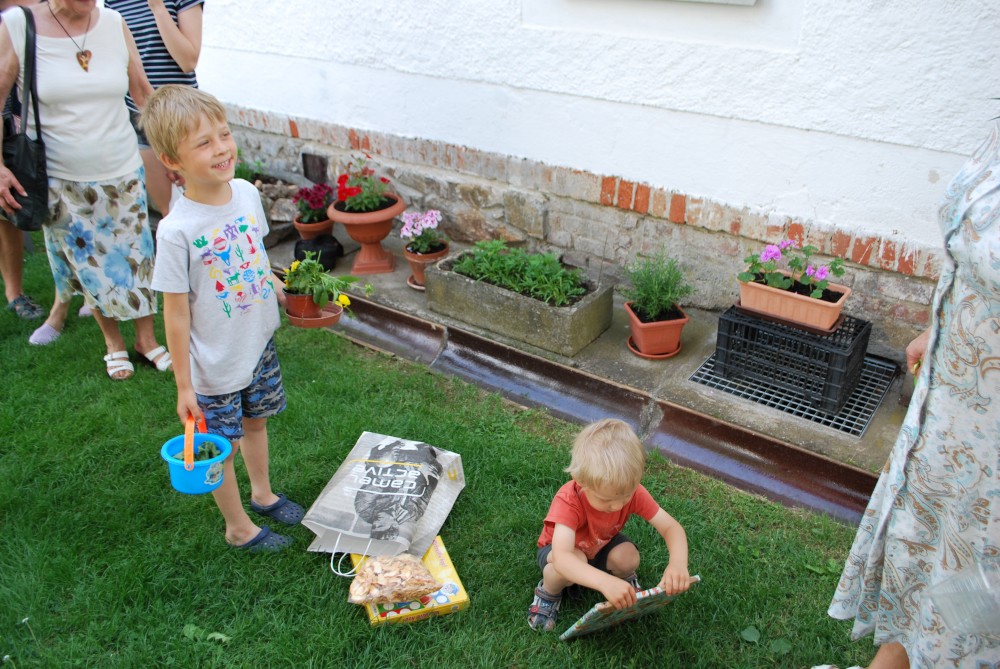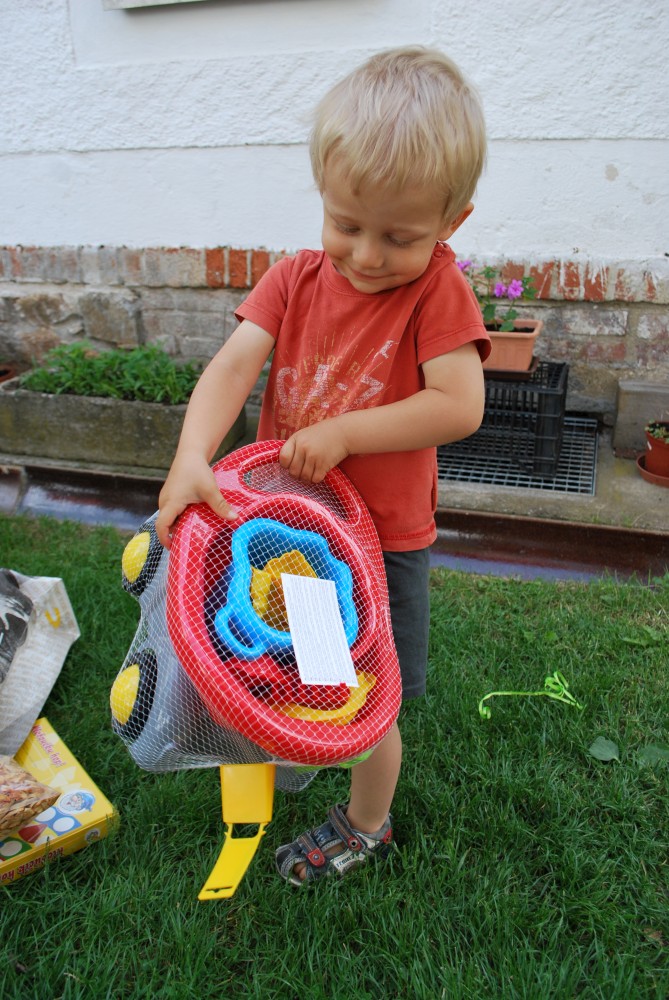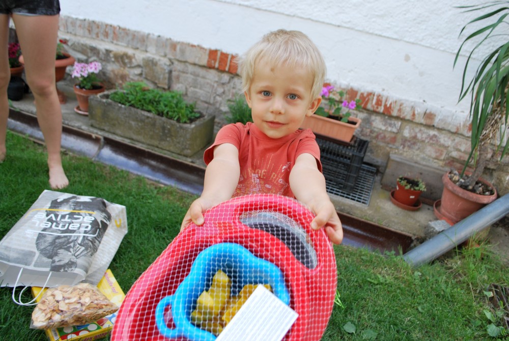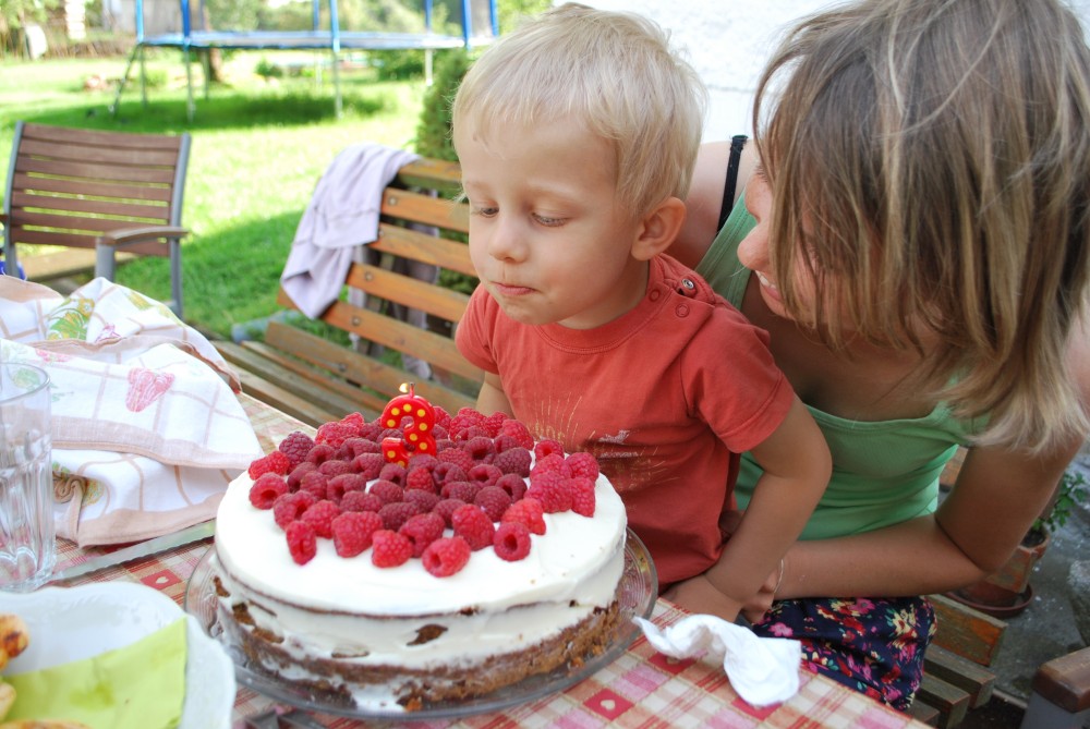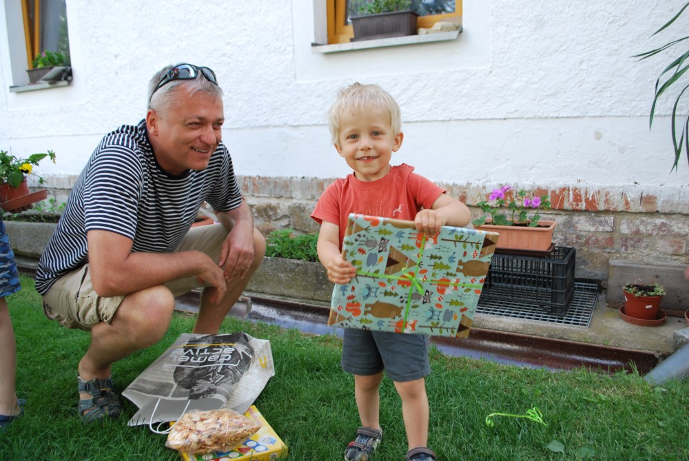 Dnes máme oslavu třetích narozenin Martínka. Je krásně, sedíme na zahradě. Martínek dostal dort a spoustu dárečků.
