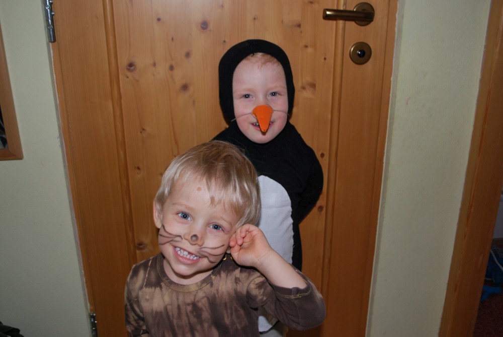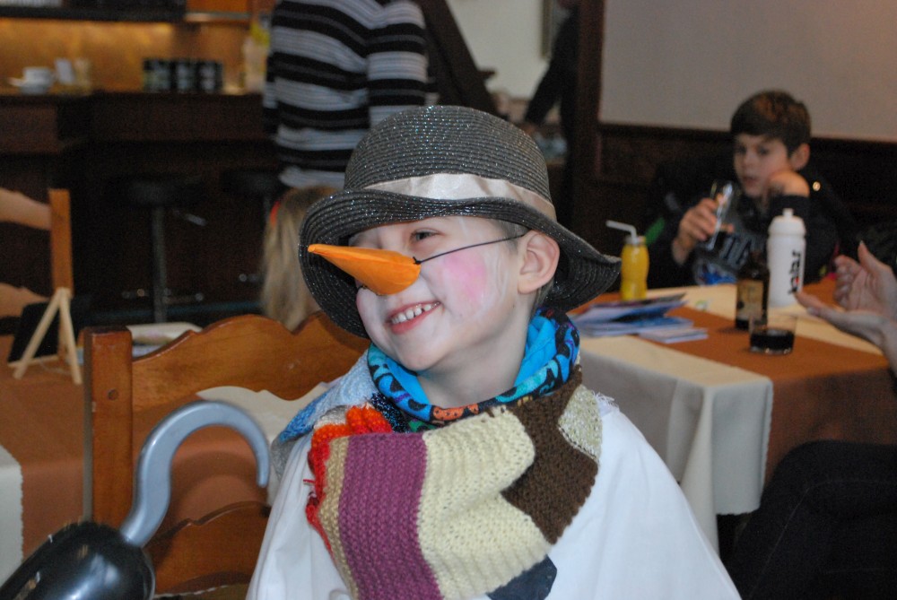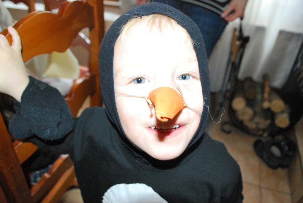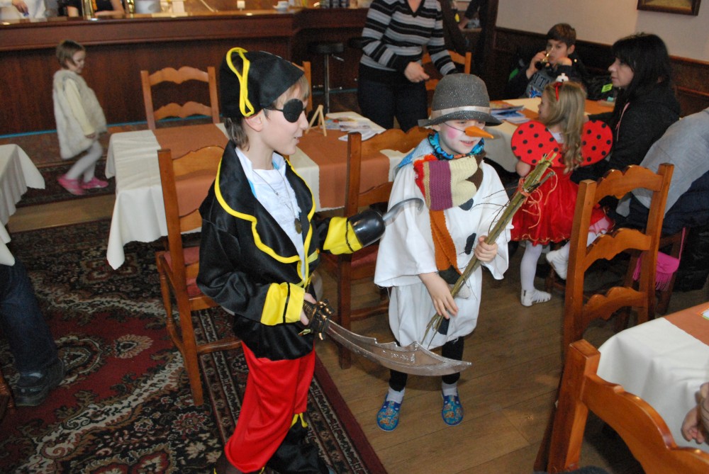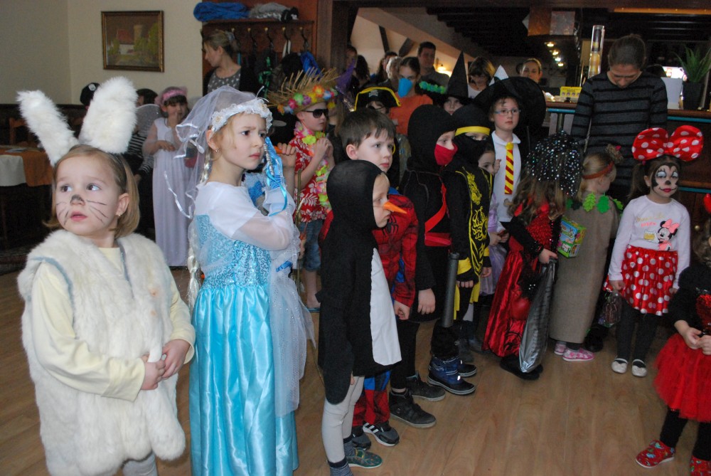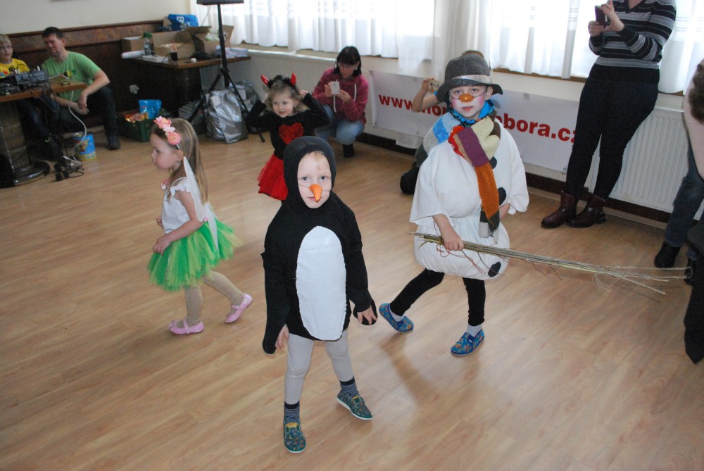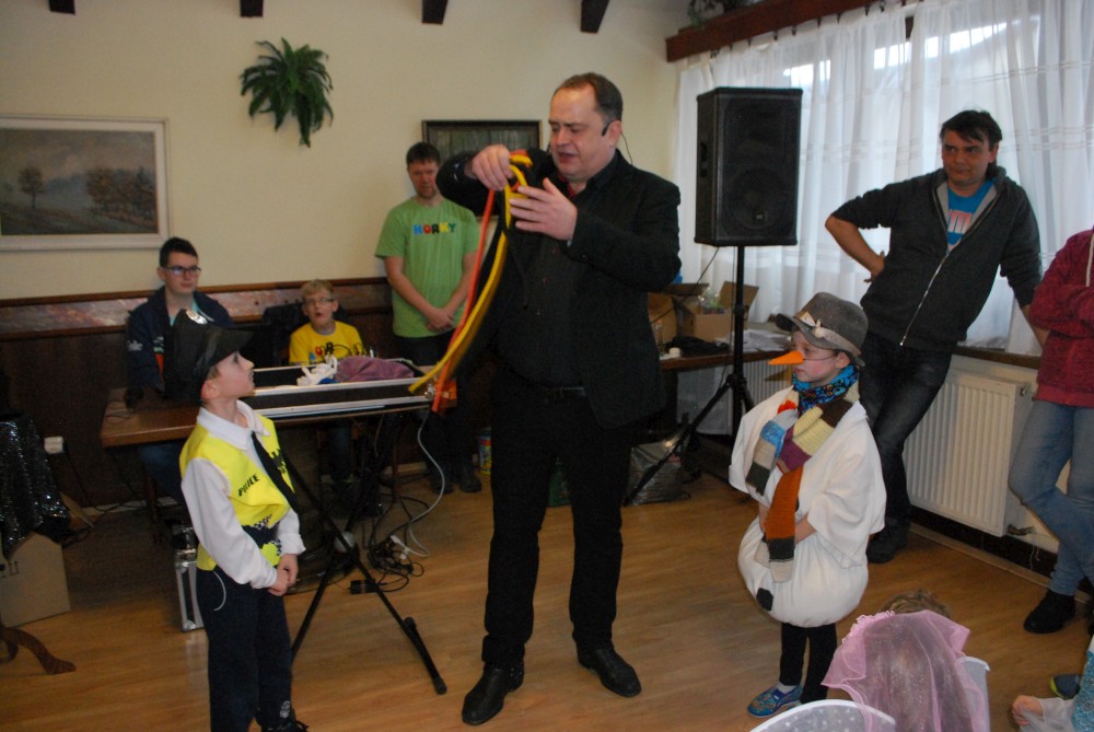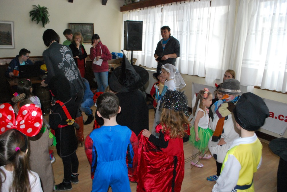 Jdeme na karneval na Pintovku. Víťa jde za sněhuláka, Jiřík za tučnáčka a Martínek za kocourka. Jde s námi ještě Terka s princeznou Toničkou. Máme zamluvený stůl. Je to dobré, není tu tam moc lidí. Už na začátku se vyhlašují nejlepší masky, nejprve předškoláci, pak školáci. Naši kluci se neumísťují :-).