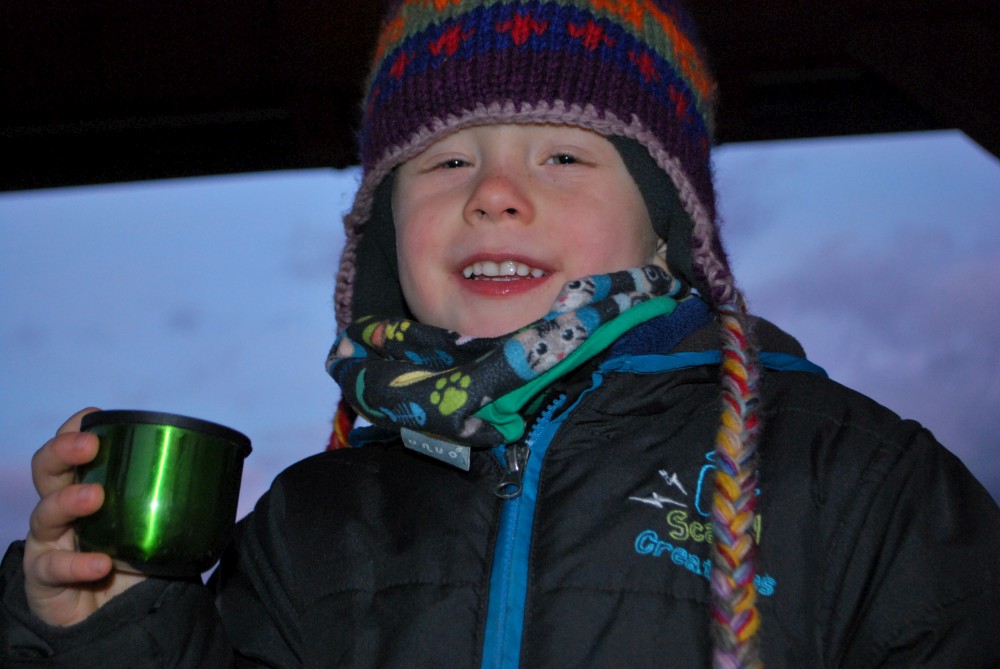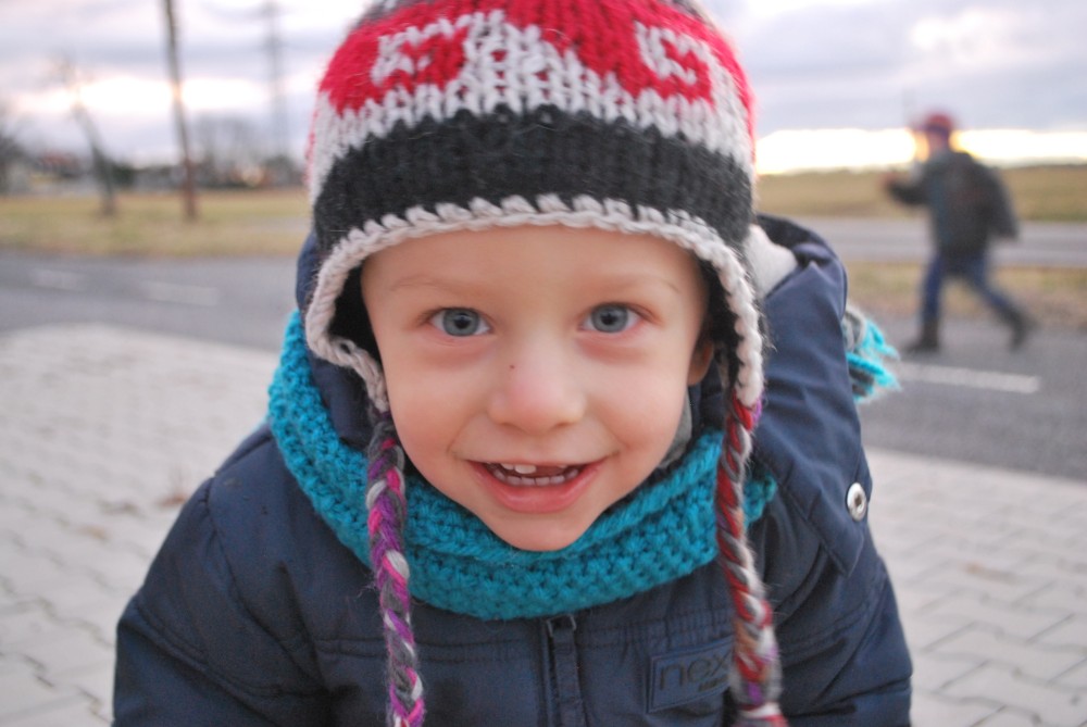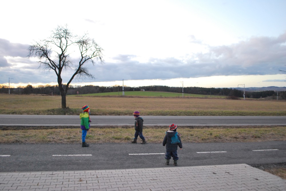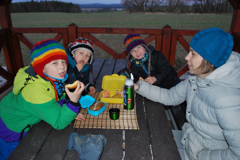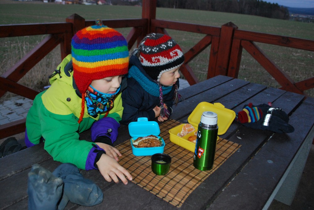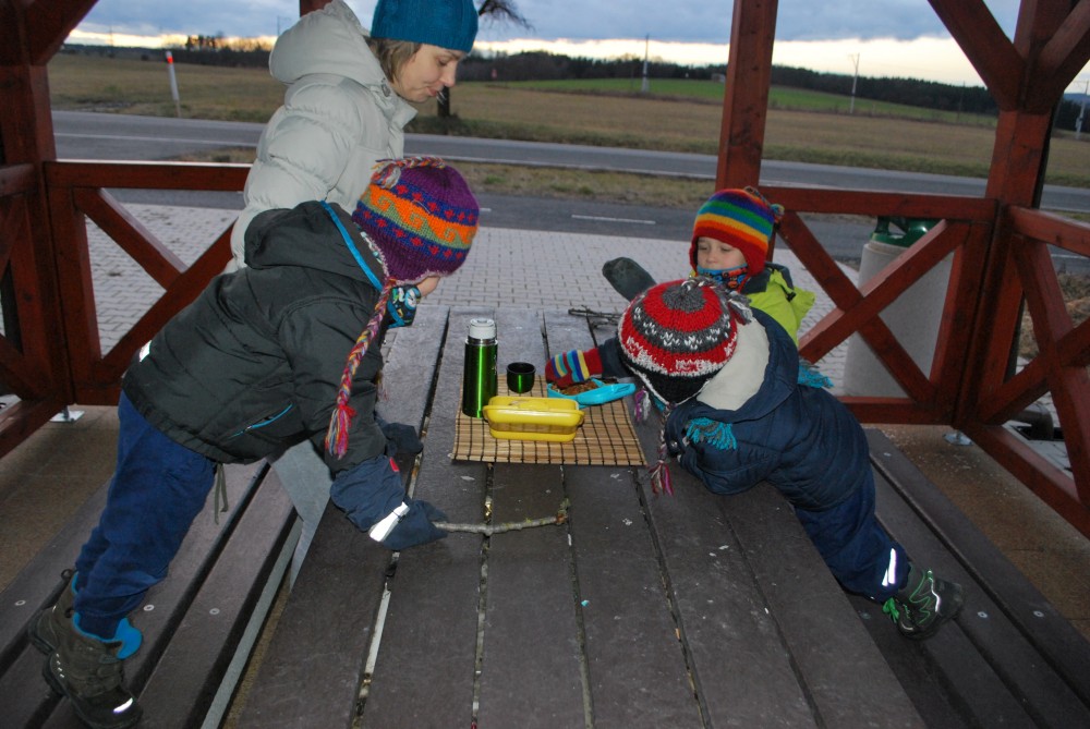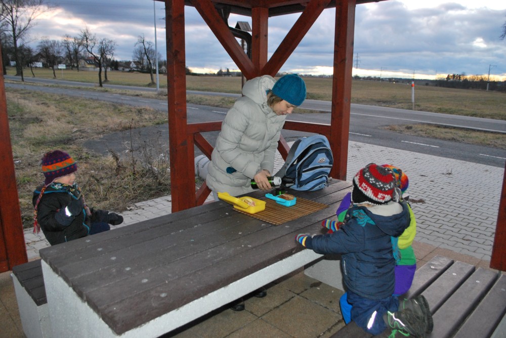 Jdeme na novoroční procházku. Jdeme jen k altánku na cyklostezce, kde si děláme malý piknik.