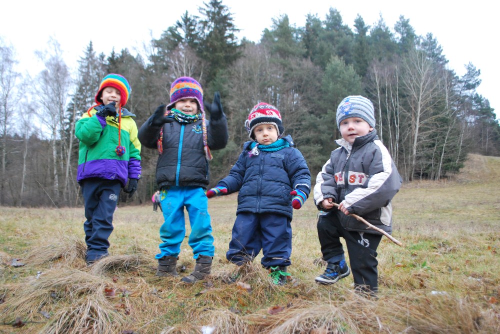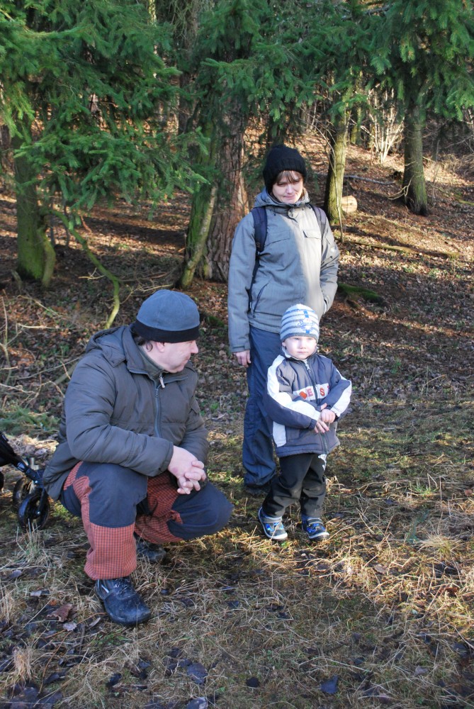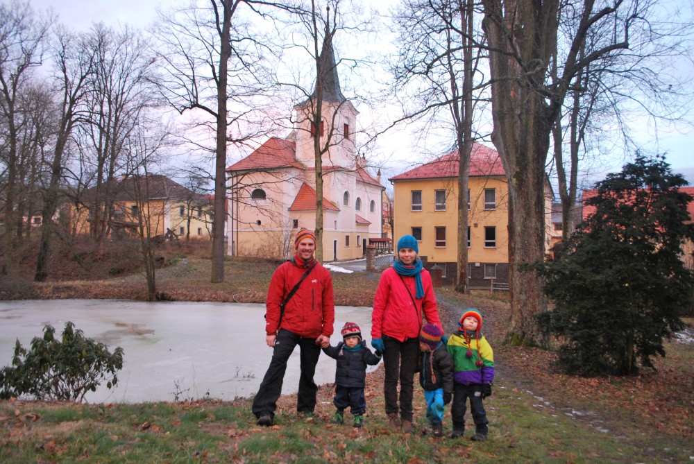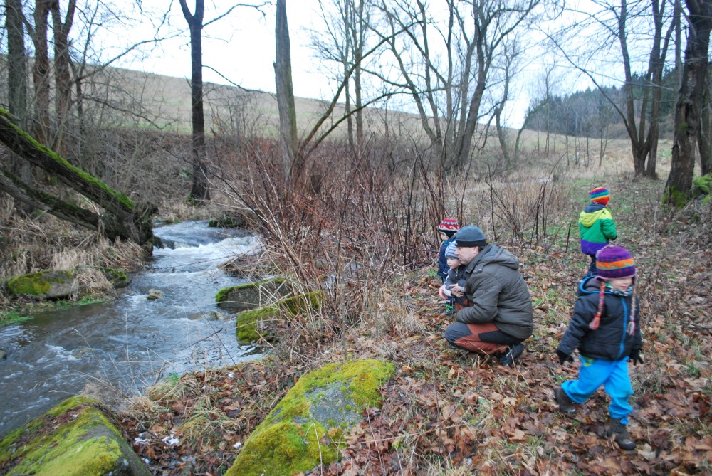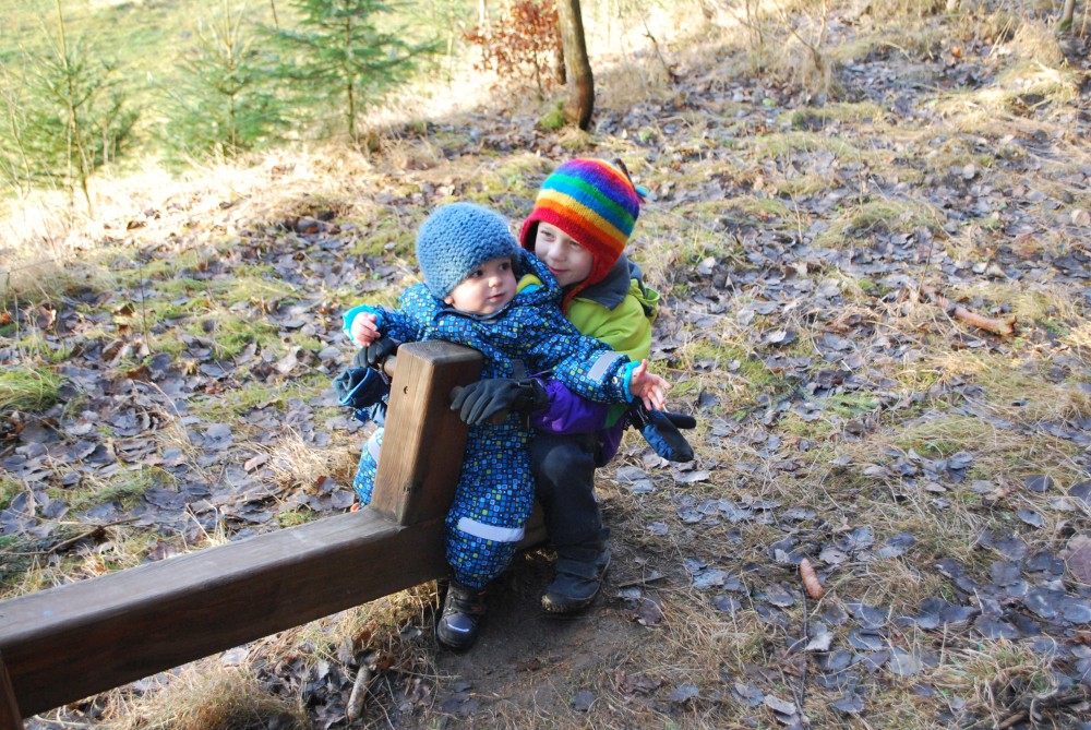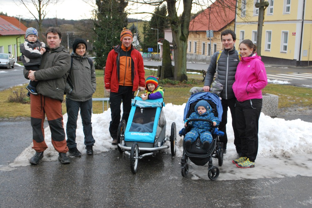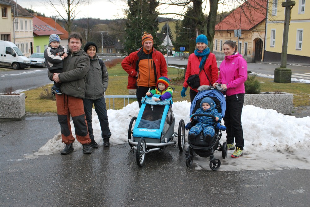Odpoledne jdeme na silvestrovskou procházku na rodinnou naučnou stezku v Nadějkově. Jedeme s Láďou, Ivkou, Radimem a Blankou, Petrem, Vašíkem. Jsou to asi jen 2 kilometry, ale na dvě hodinky to vystačí. Největší atrakcí je voda. Do zamrzlého rybníčka se hází kamínky, šišky a větve, do divokého potoka klacíky. Na cestě nás také čeká lesní dětská houpačka a hrazda.