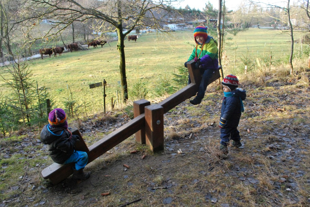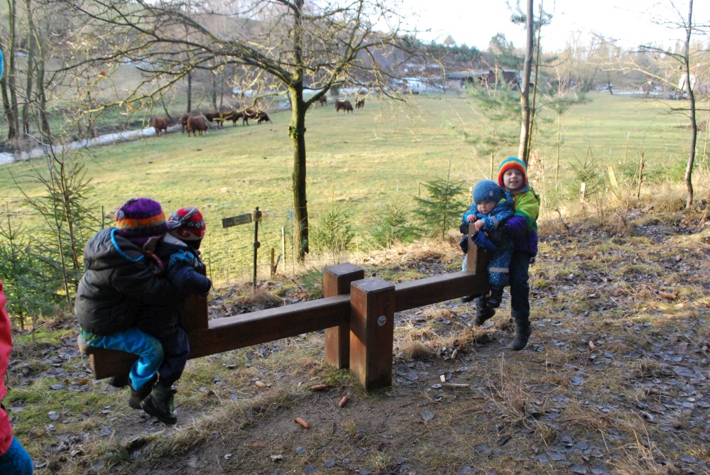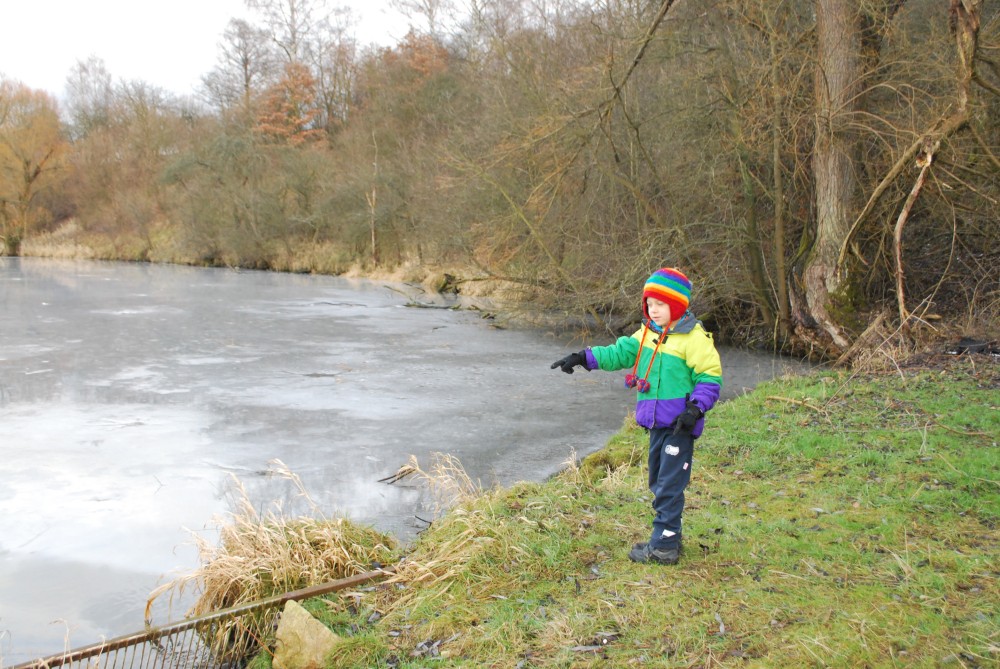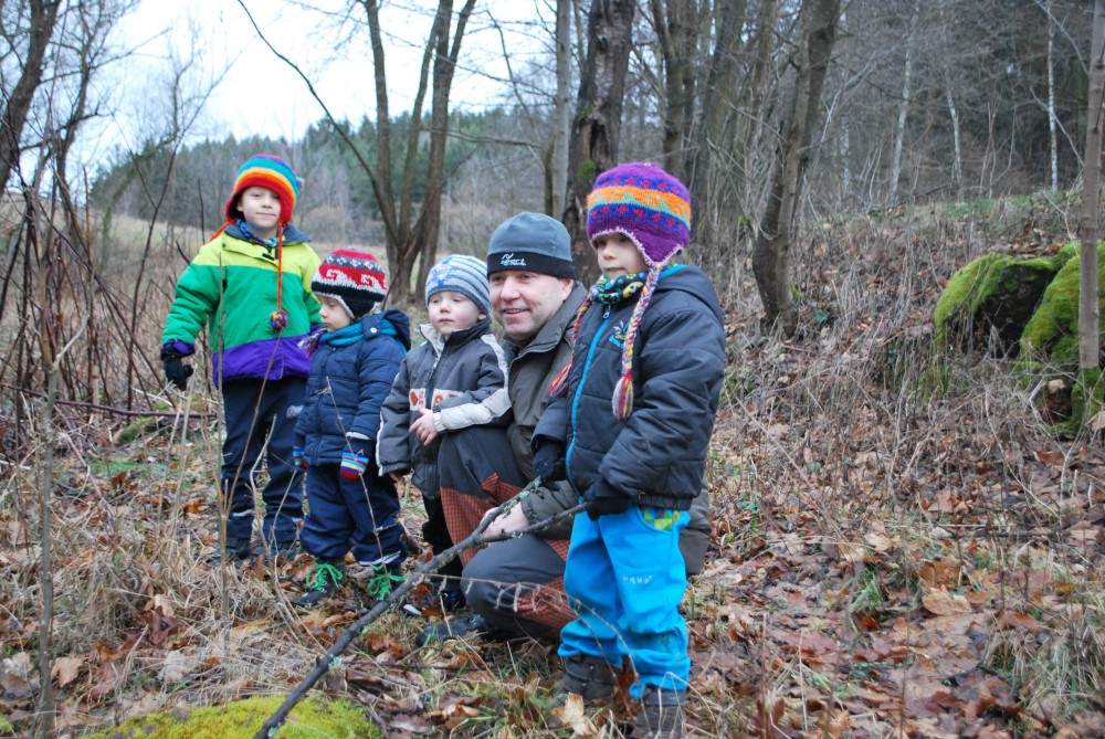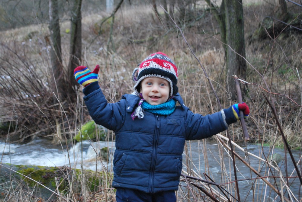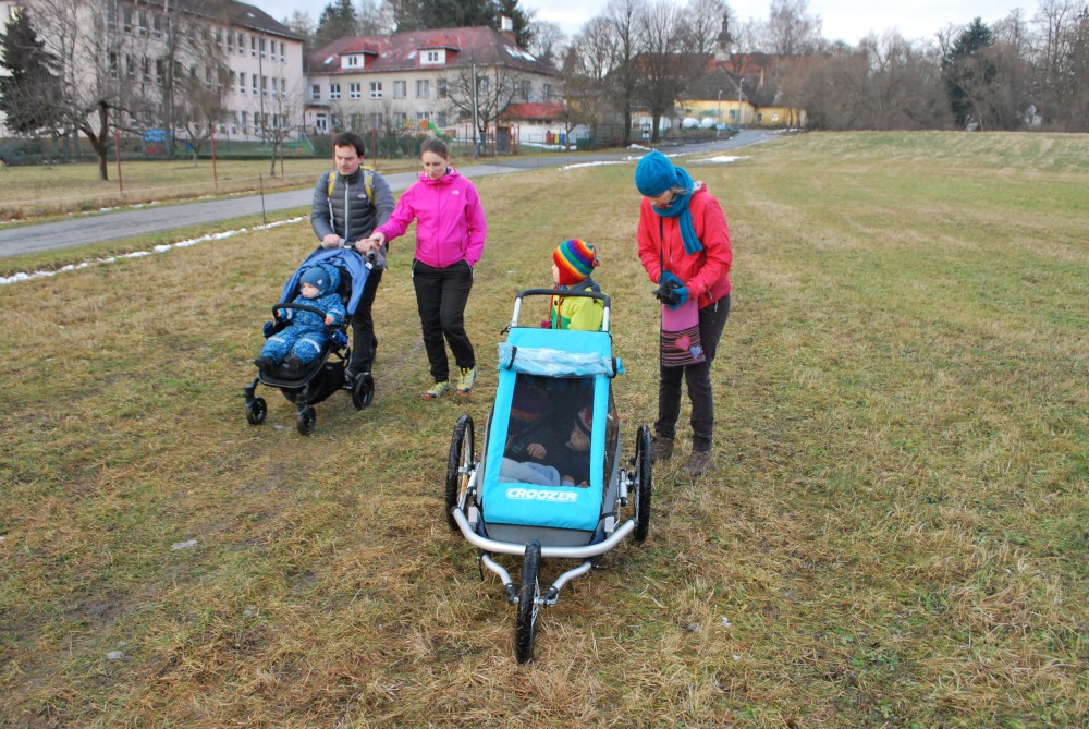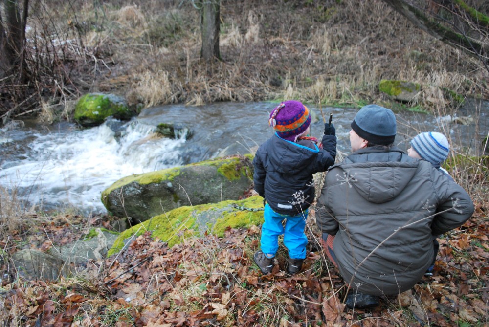Odpoledne jdeme na silvestrovskou procházku na rodinnou naučnou stezku v Nadějkově. Jedeme s Láďou, Ivkou, Radimem a Blankou, Petrem, Vašíkem. Jsou to asi jen 2 kilometry, ale na dvě hodinky to vystačí. Největší atrakcí je voda. Do zamrzlého rybníčka se hází kamínky, šišky a větve, do divokého potoka klacíky. Na cestě nás také čeká lesní dětská houpačka a hrazda.