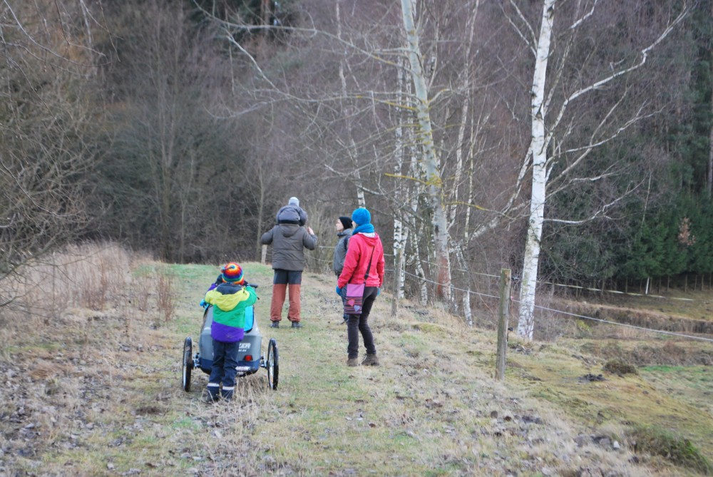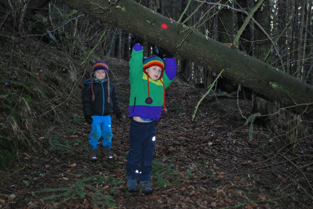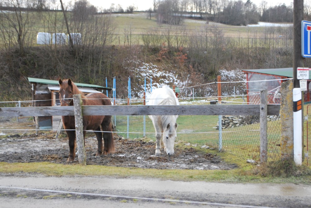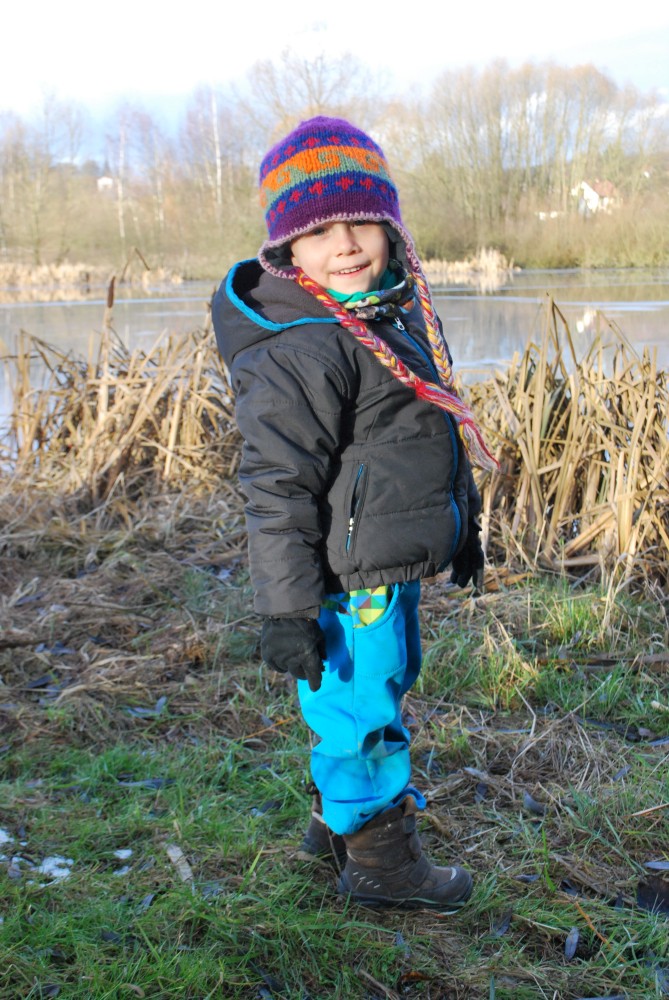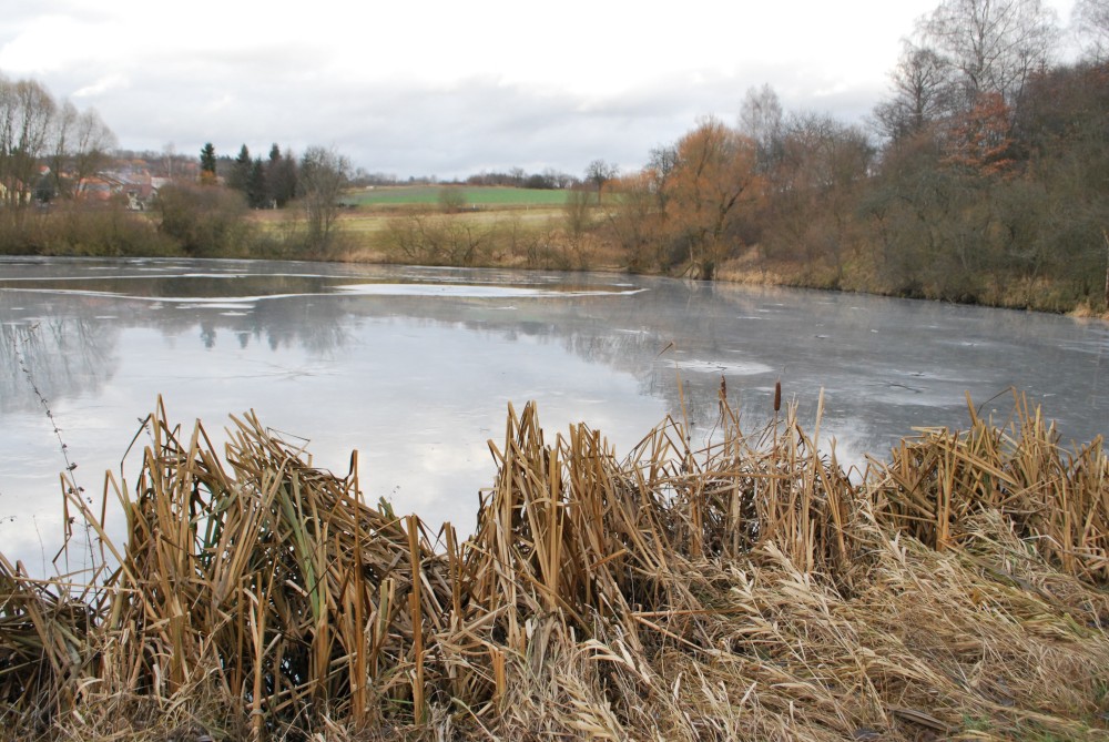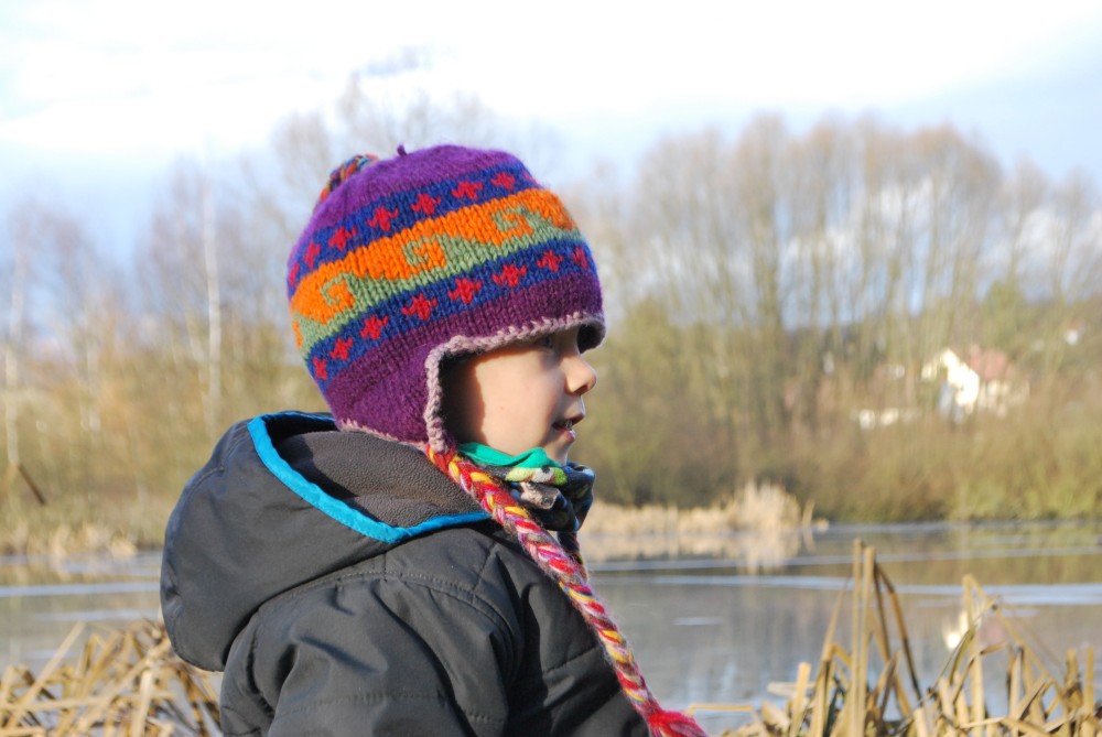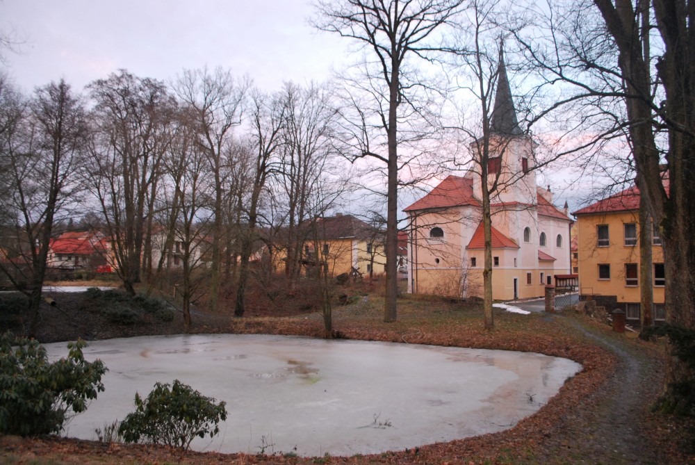 Odpoledne jdeme na silvestrovskou procházku na rodinnou naučnou stezku v Nadějkově. Jedeme s Láďou, Ivkou, Radimem a Blankou, Petrem, Vašíkem. Jsou to asi jen 2 kilometry, ale na dvě hodinky to vystačí. Největší atrakcí je voda. Do zamrzlého rybníčka se hází kamínky, šišky a větve, do divokého potoka klacíky. Na cestě nás také čeká lesní dětská houpačka a hrazda.