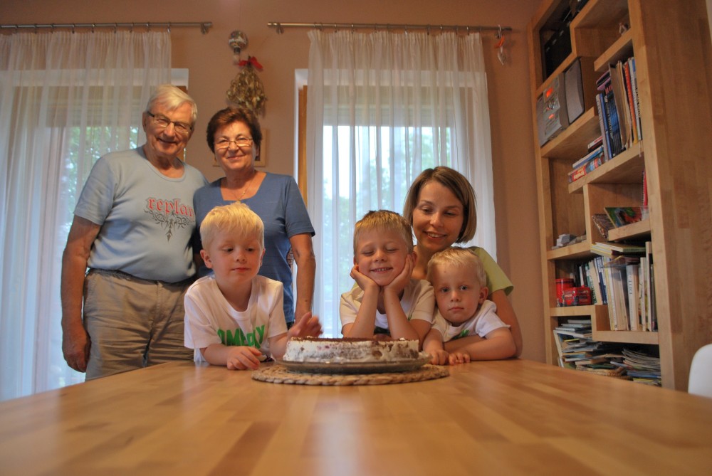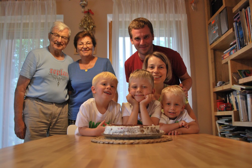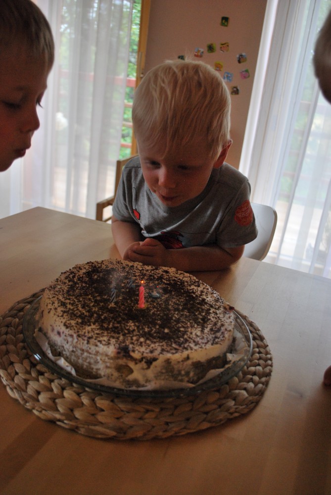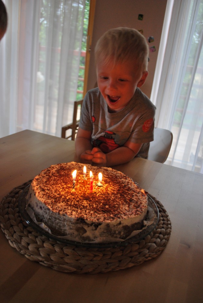 Po návratu z Kozí farmy a výletu z na rozhlednu Libín nás čeká doma další akce. Jiřík měl předevčírem čtvrté narozeniny, slavíme to v malém rodinném kruhu. Jiřík dostává dort.