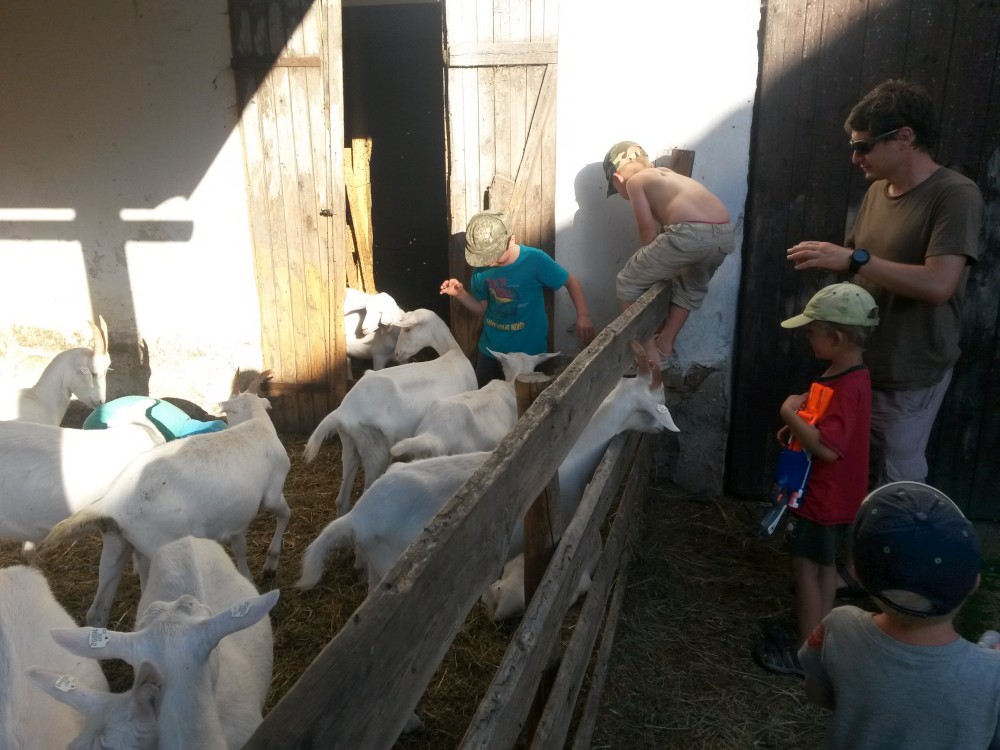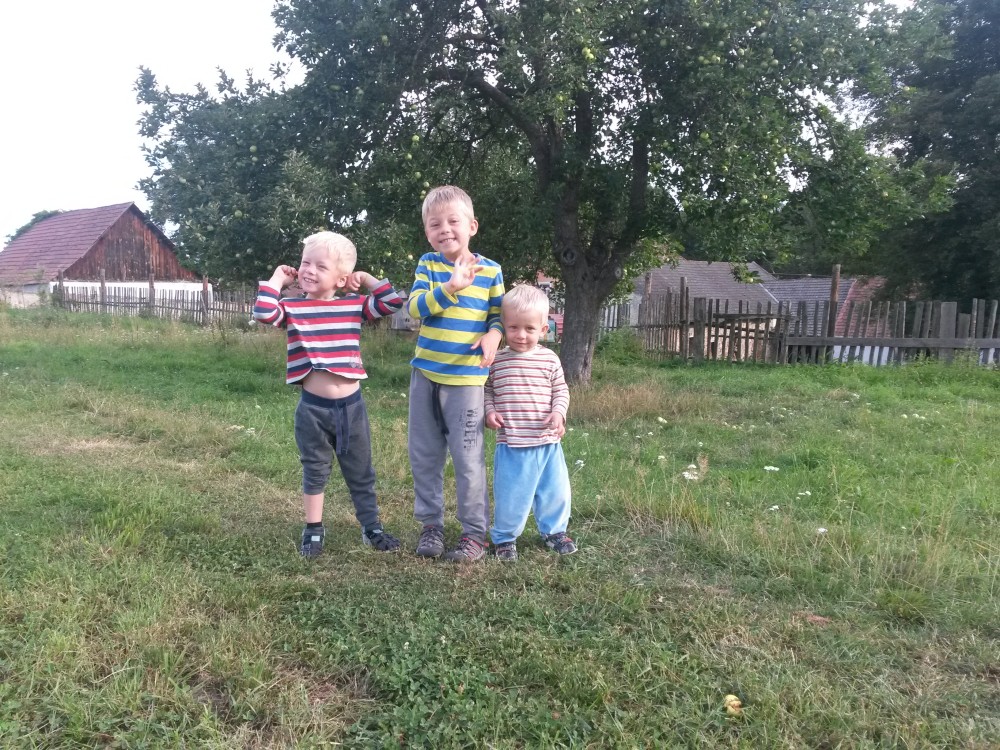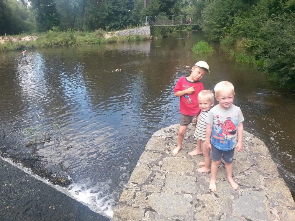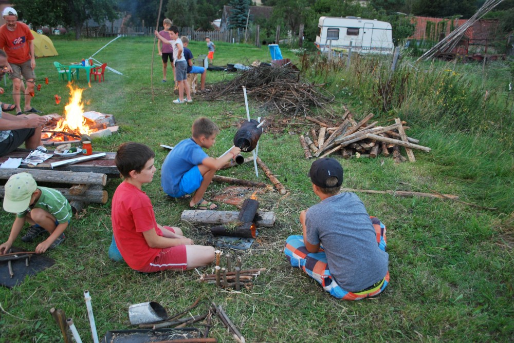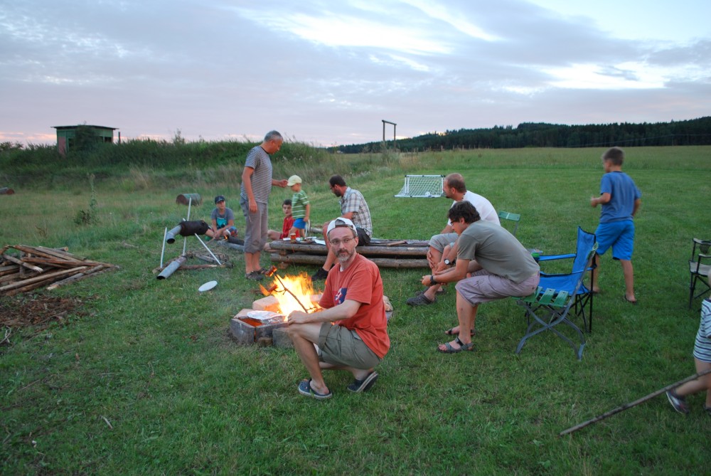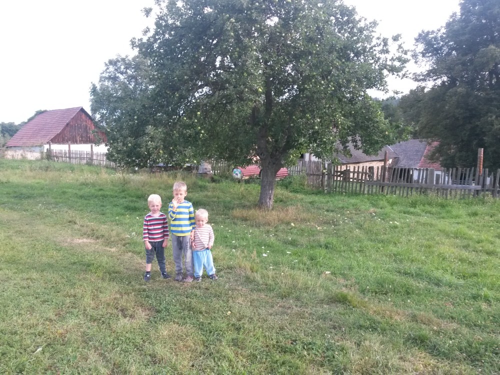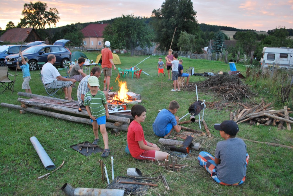 Opět jedeme na kozí farmu do Bílska. Poprvé beru s sebou všechny tři kluky. Koupili jsme si nový velký stan. Do malého už bychom se nevešli. Jedeme v pátek ráno, stejně jako Pavel a Kryštůfek, který čekal na konec fotbalového soustředění. Stavíme stan a připravujeme pro všechny dovezený oběd. Máme bramborový guláš. Je celkem horko, takže relaxujeme ve stínu, občas dáváme nějakou střílečku s nerfkama, zkoušíme autíčka na dálková ovládání, děti si hrají u koz, jdeme na nanuka, navečer máme tradičně oheň a buřty. Sledujeme červánky.