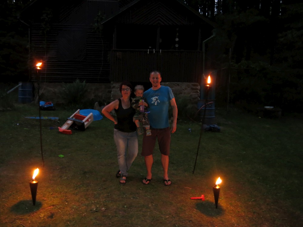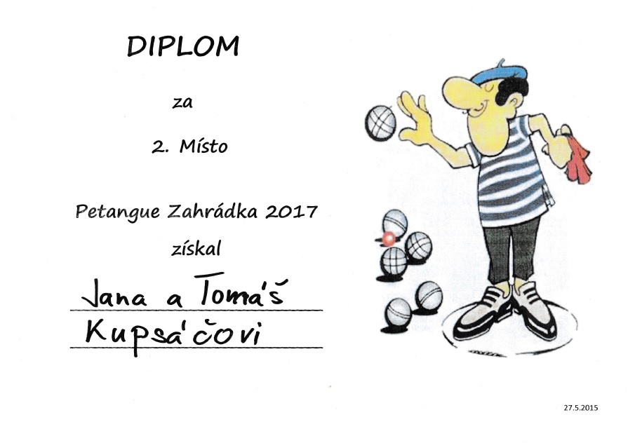 Dnes se koná již tradiční turnaj v petangu u Pavly a Radka na zahrádce u Kvěchova mlýna u Lužnice. Jedeme s Víťou z Horek na kole, Jana jede s Jirkou a Martínkem autem. Jedeme trochu později, protože jsme se chtěli na chvilku stavit na dětském dnu na Horkách. Turnaje se účastní asi šest dvojic. Umísťujeme se na druhém místě. Vítězí Michal s Terkou, třetí jsou Ticháčci. S Víťou se vracíme znovu na kole, vracíme se skoro za tmy. Fotky jsou od Radka.