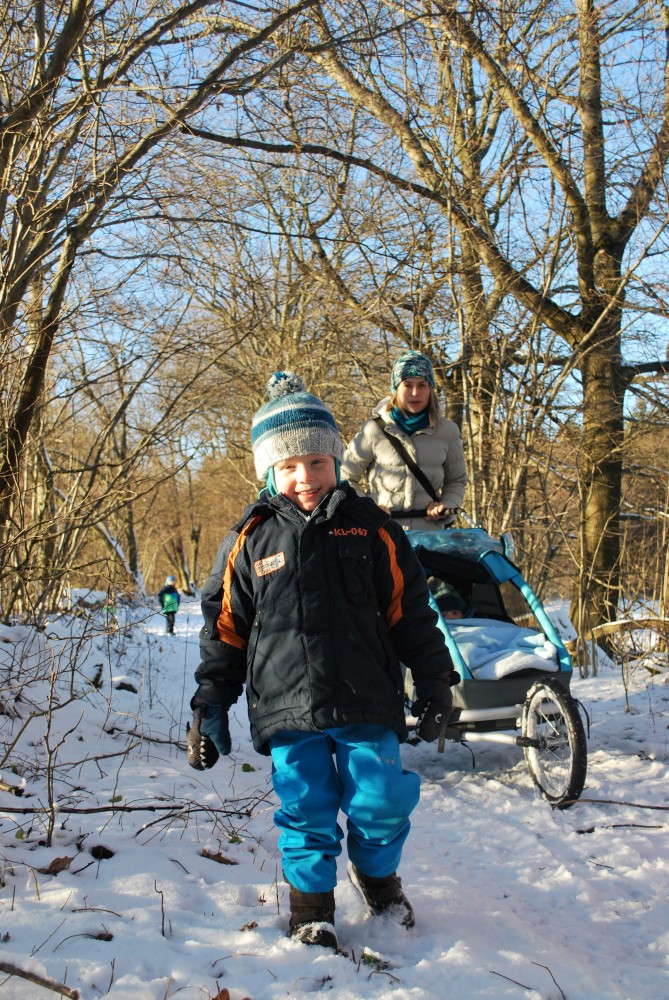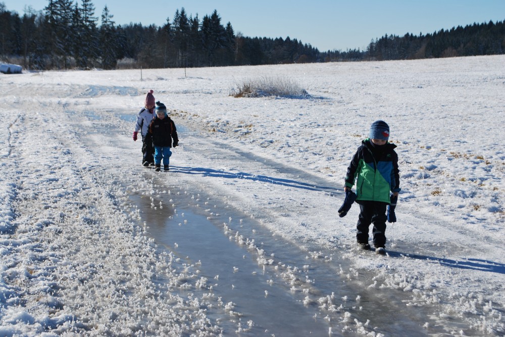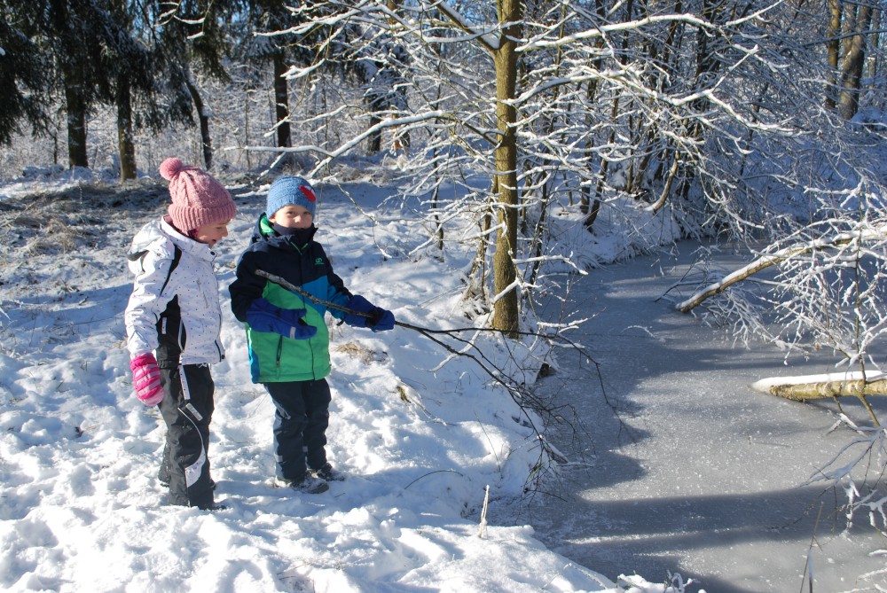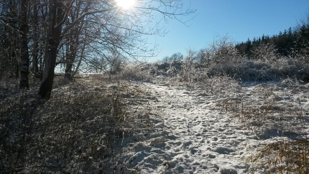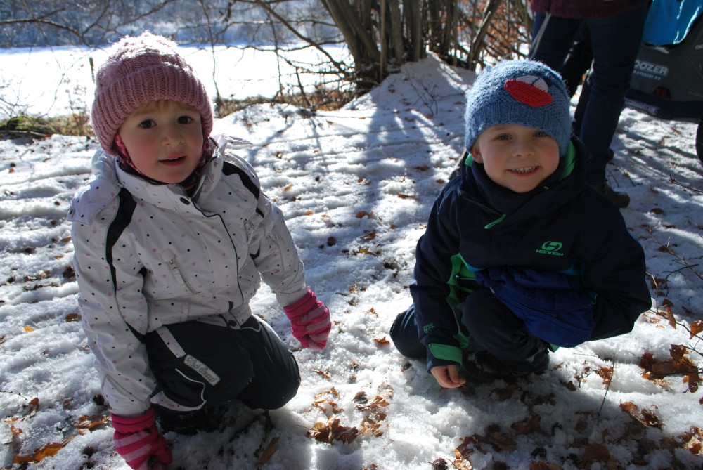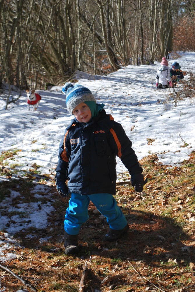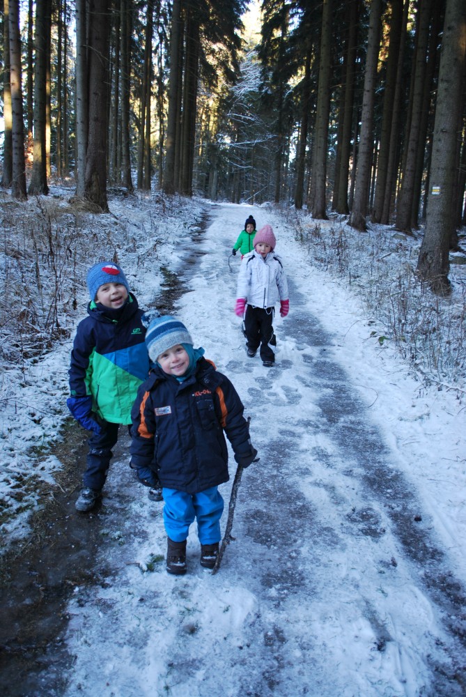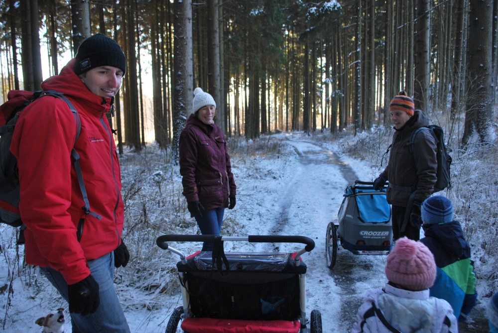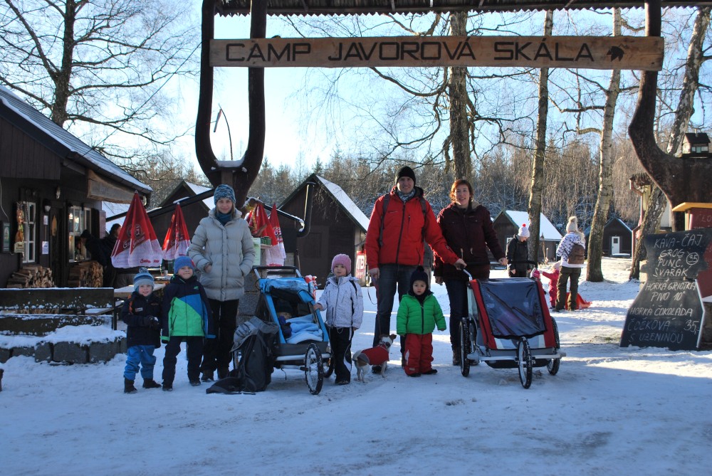 Jdeme na silvestrovskou vycházku s Radkem, Terkou, Toničkou a Fanouškem. Auto necháváme na Ounuzu. Jdeme po žluté na Busíny a pak kolem rybníka a skrz les na Javorovou skálu. V poštovně dáváme polévku a klobásku. Parádní počasí. Svítí sluníčko, stromy jsou ojíněné mrazem.