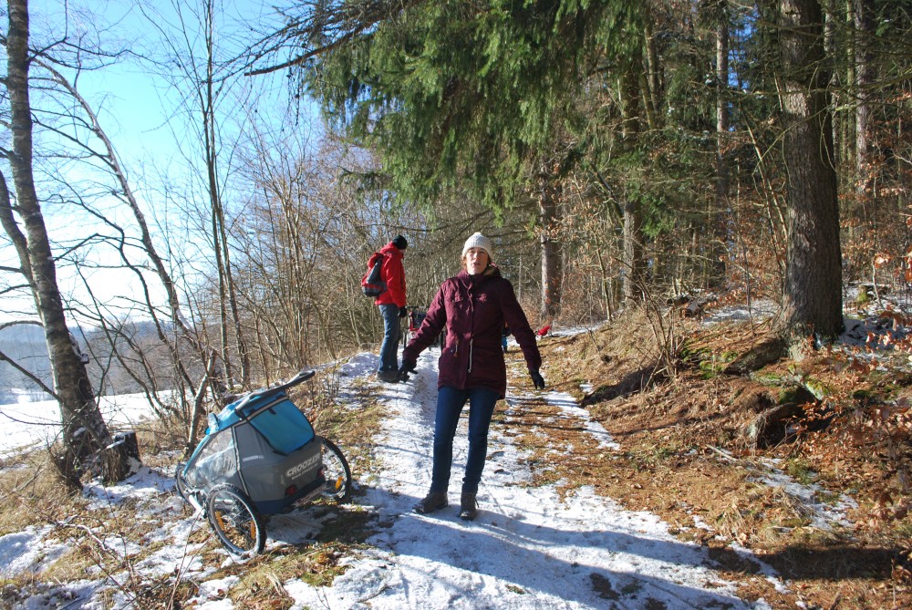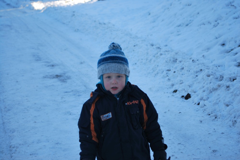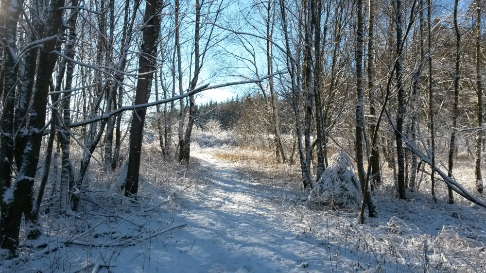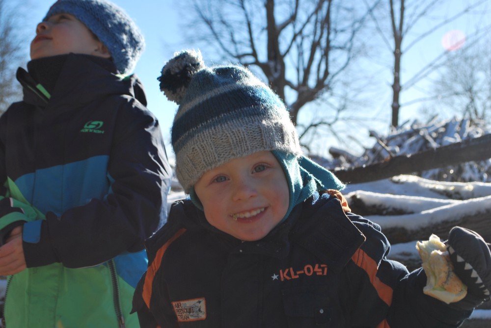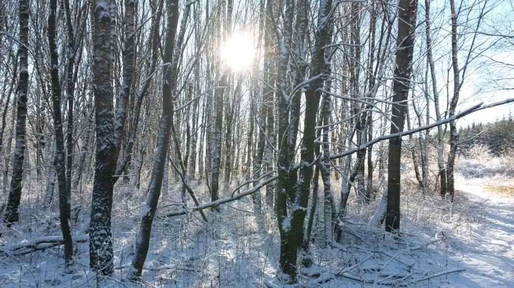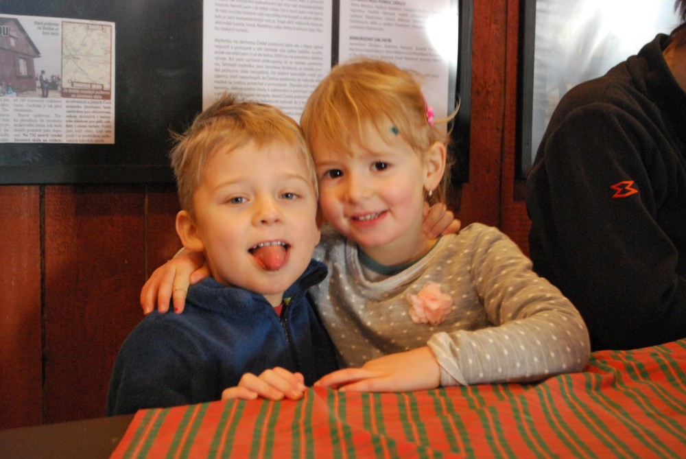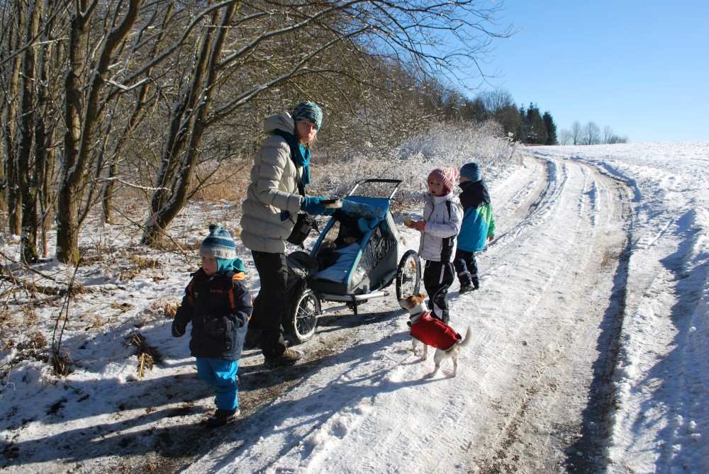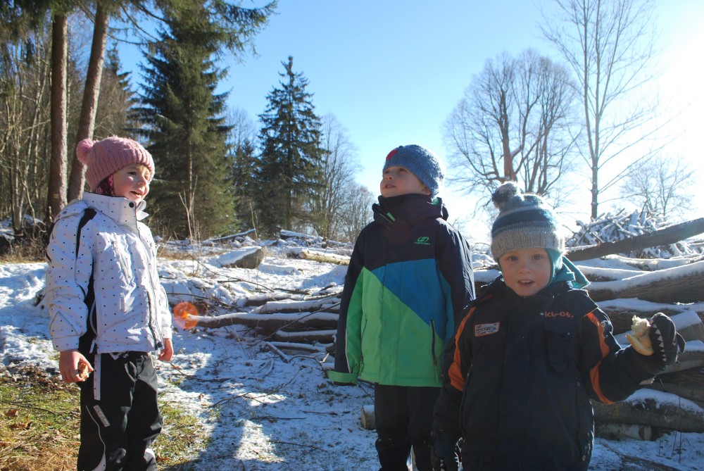Jdeme na silvestrovskou vycházku s Radkem, Terkou, Toničkou a Fanouškem. Auto necháváme na Ounuzu. Jdeme po žluté na Busíny a pak kolem rybníka a skrz les na Javorovou skálu. V poštovně dáváme polévku a klobásku. Parádní počasí. Svítí sluníčko, stromy jsou ojíněné mrazem.