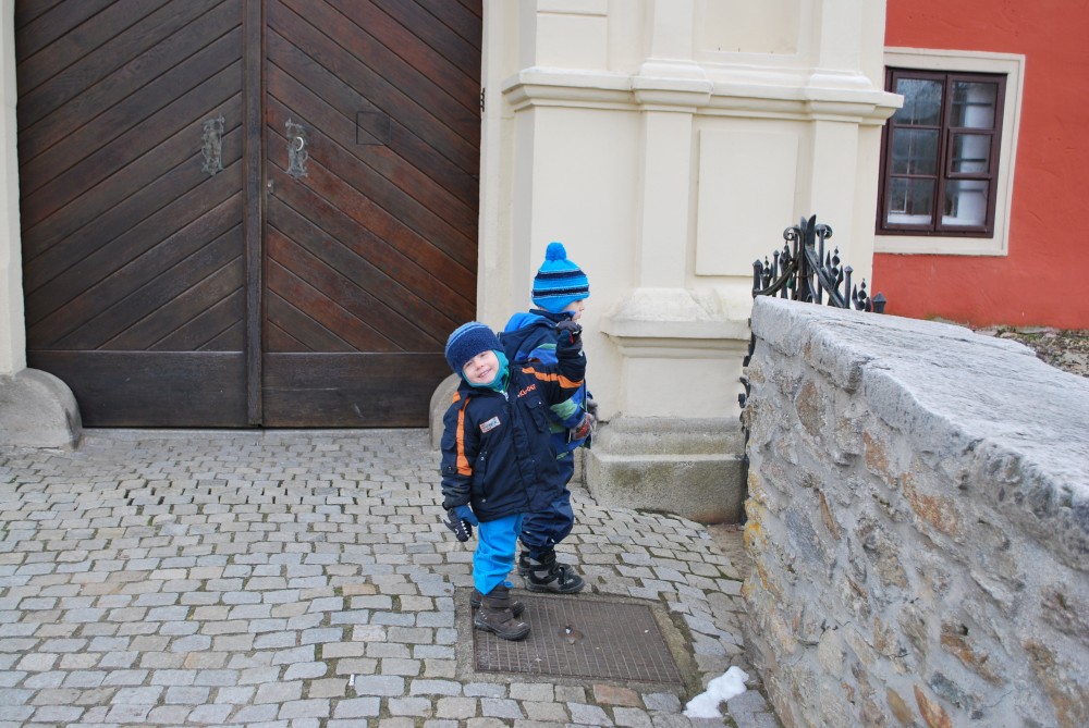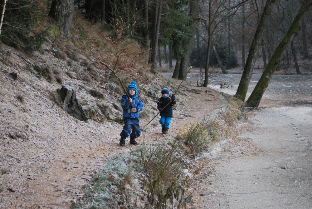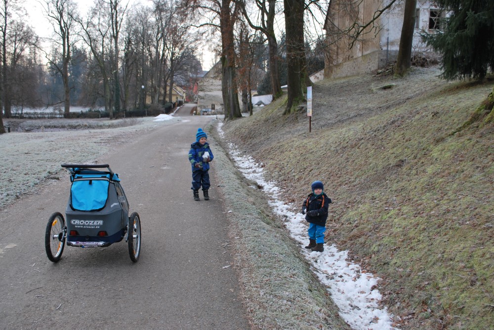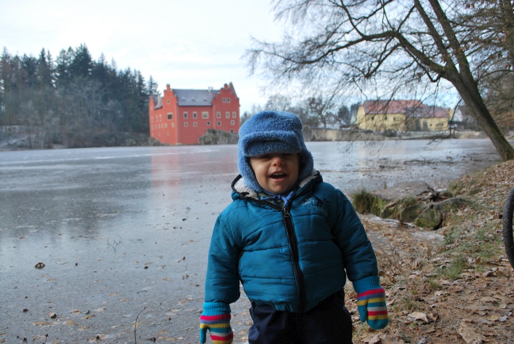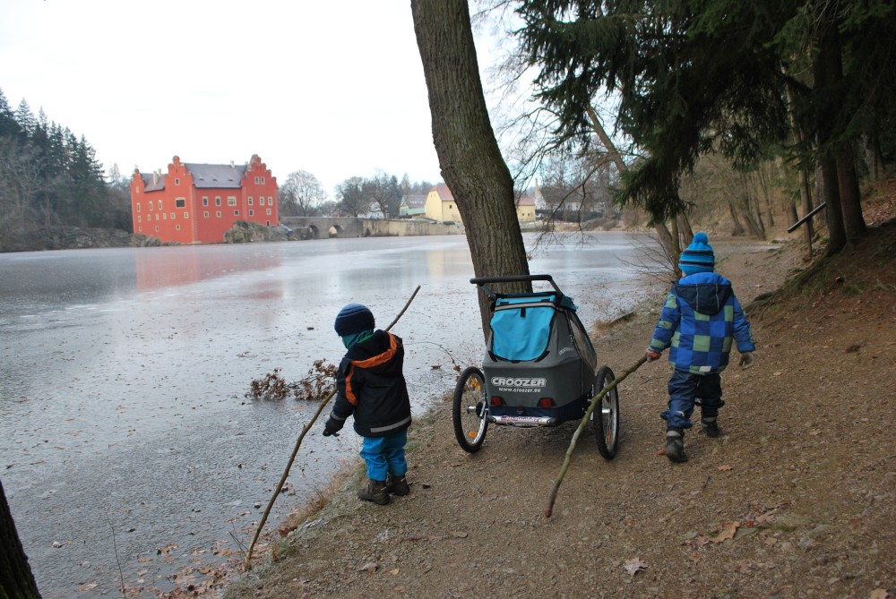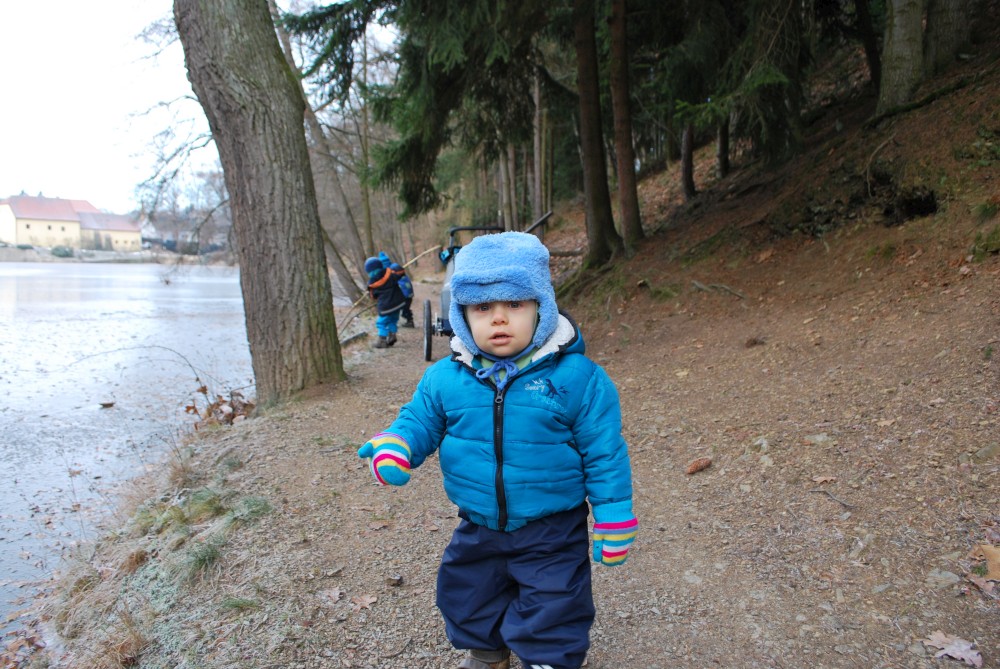 Jana je s holkama v Praze. Kluci ráno vstávají brzy, vyrazíme tedy na dopolední výlet na Červenou Lhotu. Dáváme tam kolečko kolem rybníka. Cesta je v pohodě, malý exponovaný úsek přes skálu zvládáme. Kluci rozbíjí klackama led. Martínek se po jednom zaškobrtnutí trochu namočil, takže spěcháme k autu a jedeme domů. Oběd dáváme už v Táboře na Pintovce a jedeme pro mamku na nádraží.
