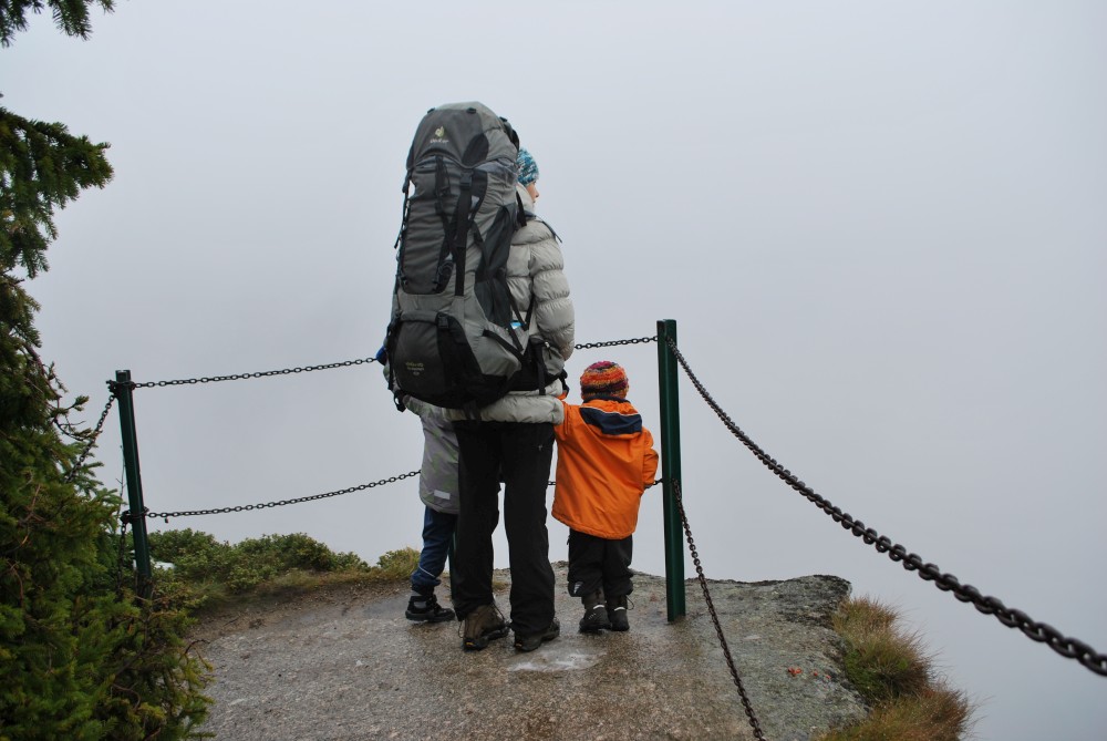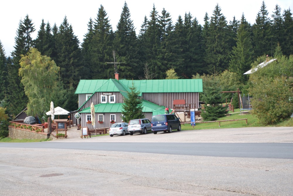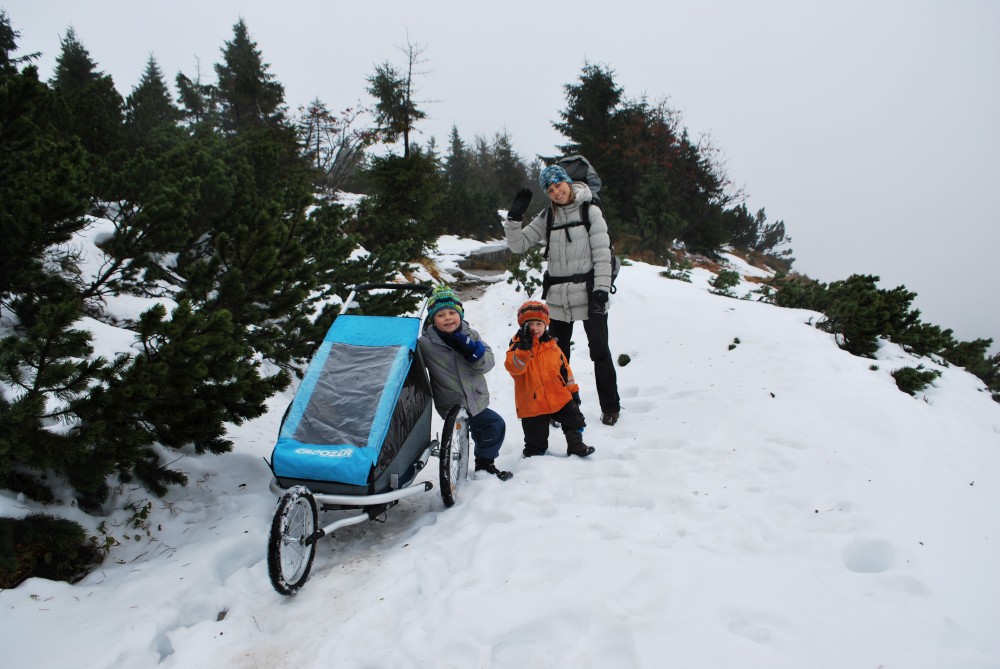 Kluci chvilku jdou po svých, ale moc to neodsýpá, takže je všechny nakládám do vozíku a tlačím. Kluci naštěstí usínají, Martin a Jirka ve vozíku, Víťa v kufru vozíku. Je to makačka, ale asi za hoďku a půl jsme na Zlatém návrší. Odtud už to jde celkem dobře. Na Labské jsme za další cca hodinku. Ubytováváme se, uspáváme kluky a jdeme si chvilku sednout do restaurace.