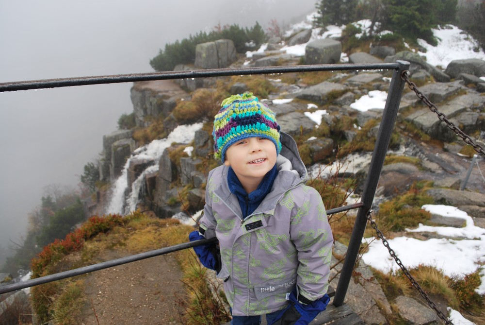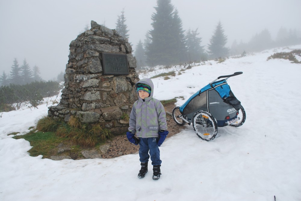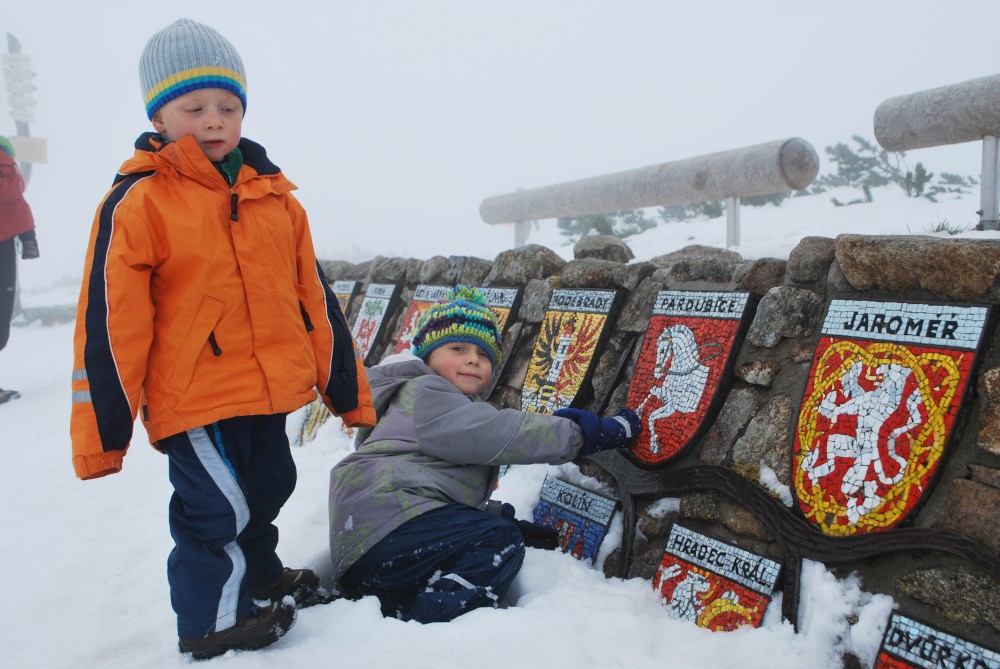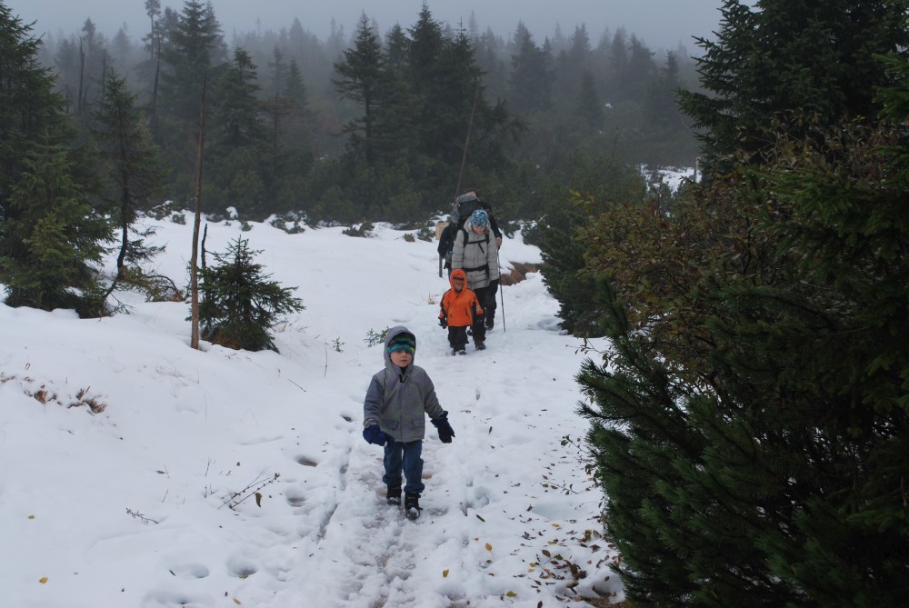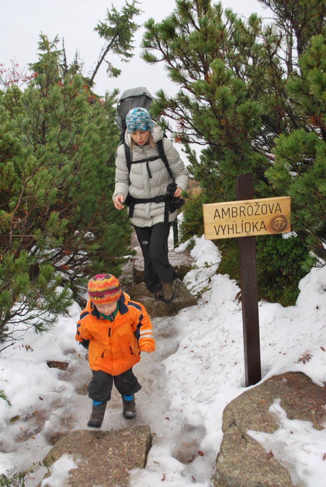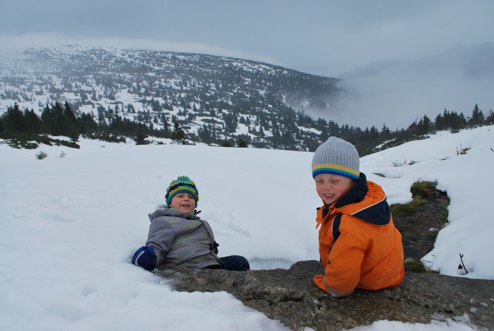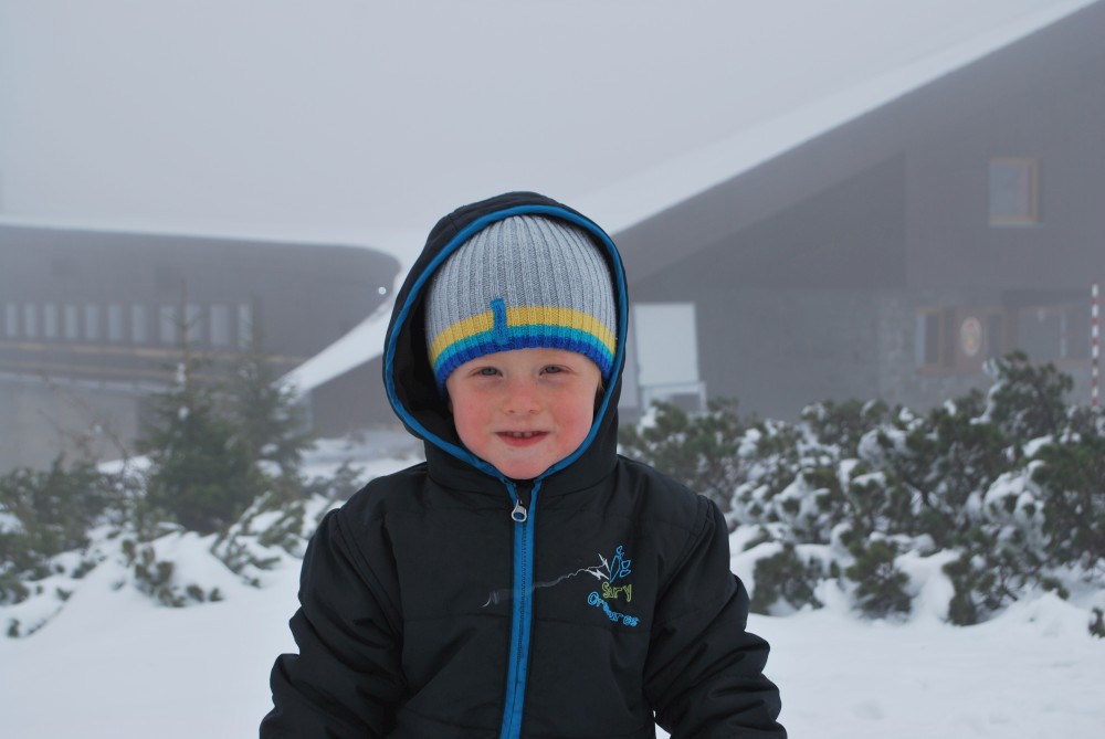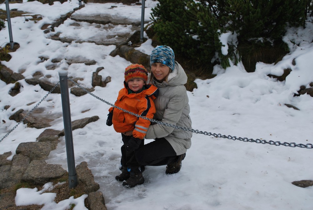 V pátek máme firemní poradu na Labské boudě. Je to akce i s rodinkama. Vyrážíme už ve čtvrtek. Ráno vyrážíme z Tábora do Míseček. Dáváme oběd v chatě Mísečky. Necháváme si bohužel ujet poslední autobus na Zlaté návrší. Ten další, na který jdeme už totiž nepojede kvůli špatným povětrnostním podmínkám a náledí nahoře na návrší. Nezbývá než vyrazit pěšky. Janě se to vůbec nelíbí. Přeci jen je to minimálně 400 m převýšení, 6 km na Zlaté návrší a pak ještě 4 km na Labskou boudu, a to jdeme natěžko.