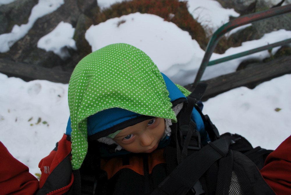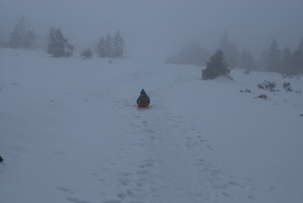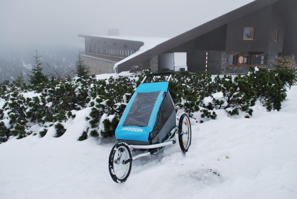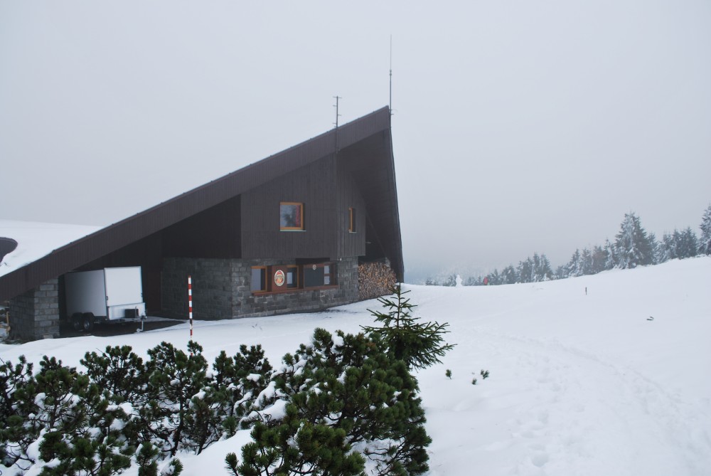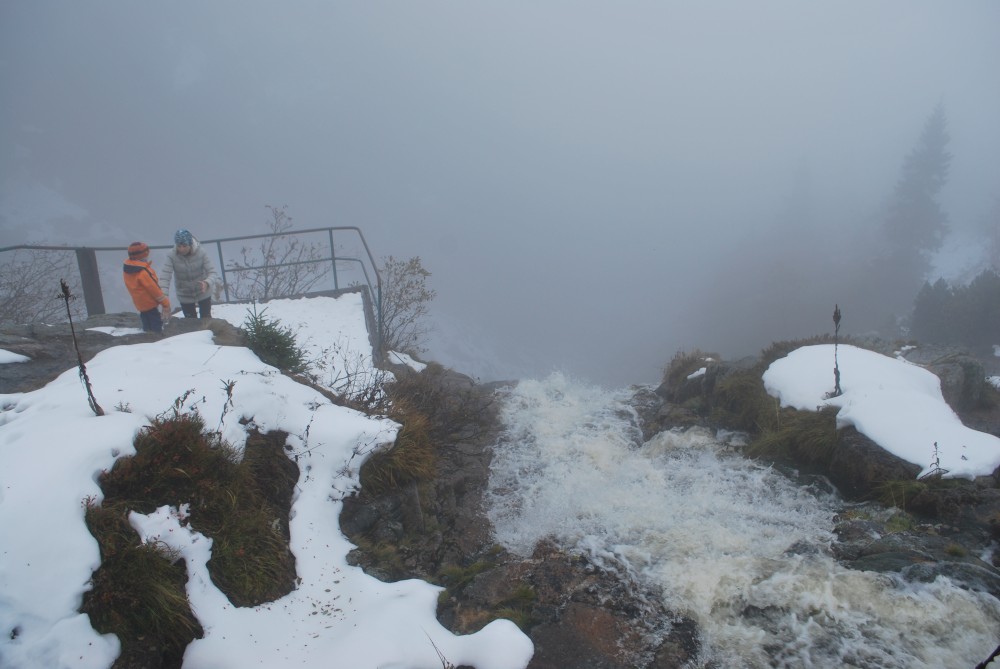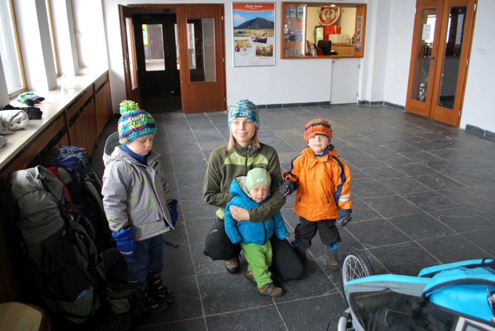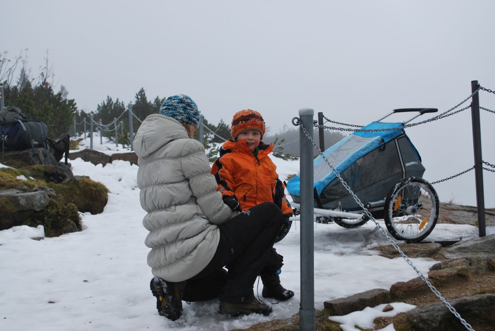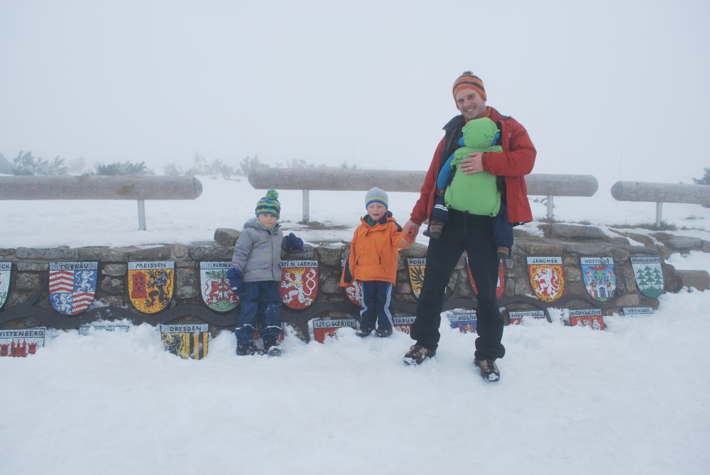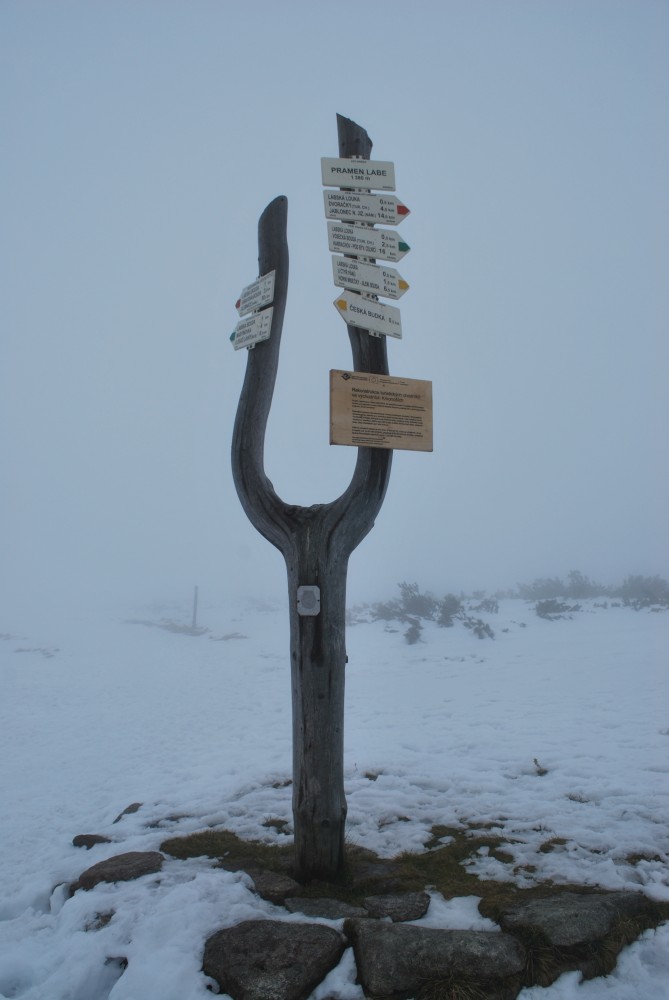 V pátek máme firemní poradu na Labské boudě. Je to akce i s rodinkama. Vyrážíme už ve čtvrtek. Ráno vyrážíme z Tábora do Míseček. Dáváme oběd v chatě Mísečky. Necháváme si bohužel ujet poslední autobus na Zlaté návrší. Ten další, na který jdeme už totiž nepojede kvůli špatným povětrnostním podmínkám a náledí nahoře na návrší. Nezbývá než vyrazit pěšky. Janě se to vůbec nelíbí. Přeci jen je to minimálně 400 m převýšení, 6 km na Zlaté návrší a pak ještě 4 km na Labskou boudu, a to jdeme natěžko.