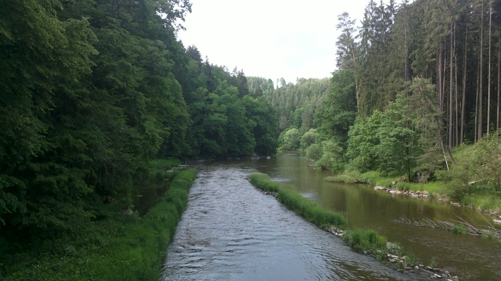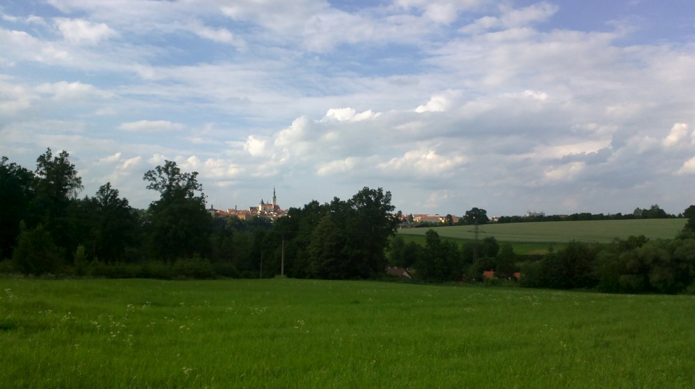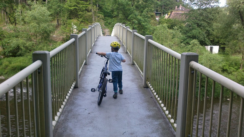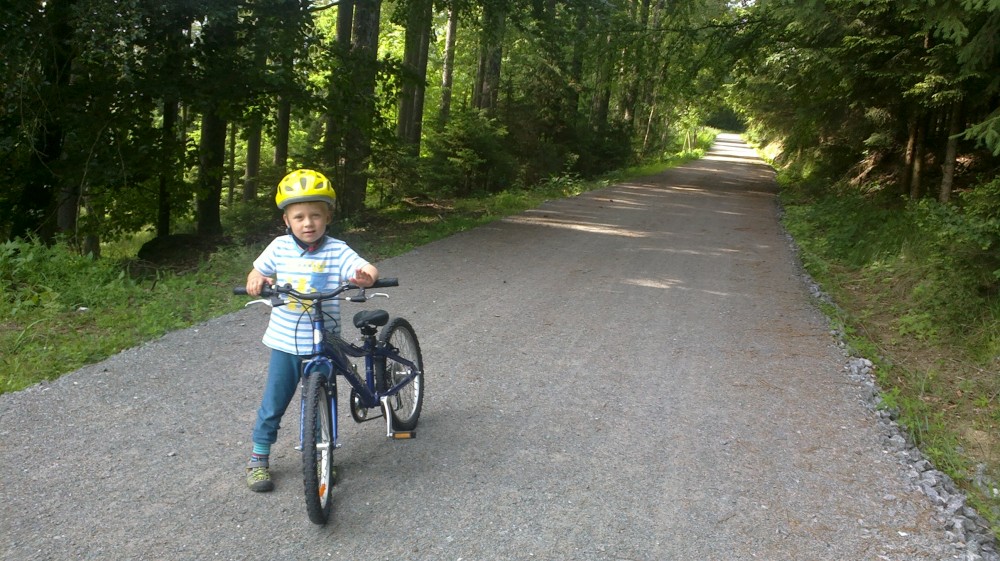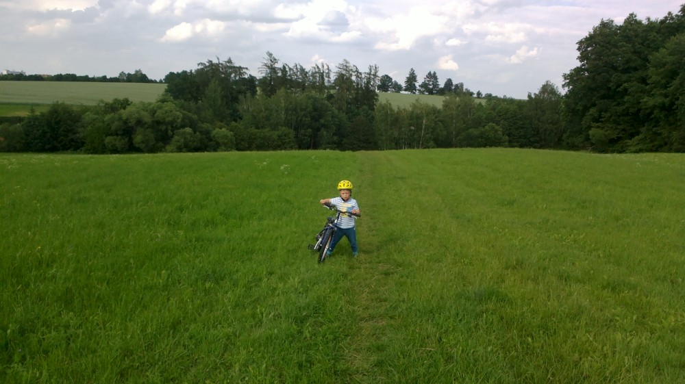 Jedeme s Víťou na kolech na Harrachovku. Víťa jede poprvé na svém velkém kole. Tam jedeme Vlčím dolem, zpět kolem řeky až do Čekanic (Bechyňský most se opravuje), k lázním, k rybníčku a na Horky kolem hřbitova. Víťa je šikula, většinu toho vyjel.