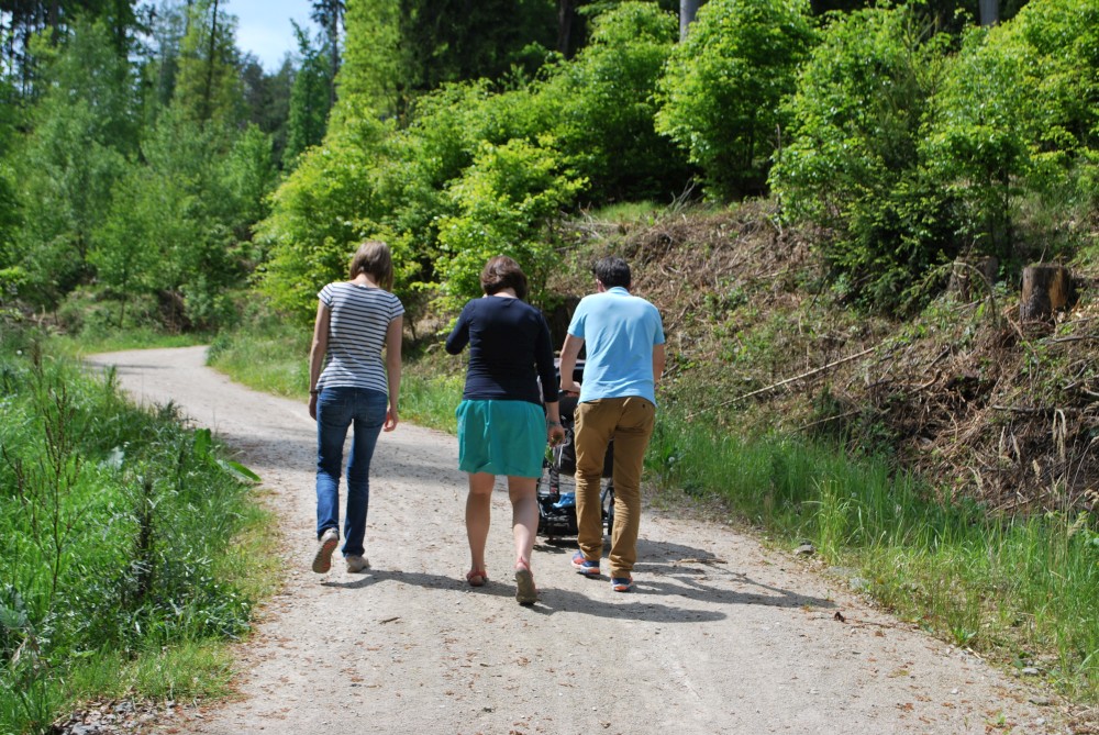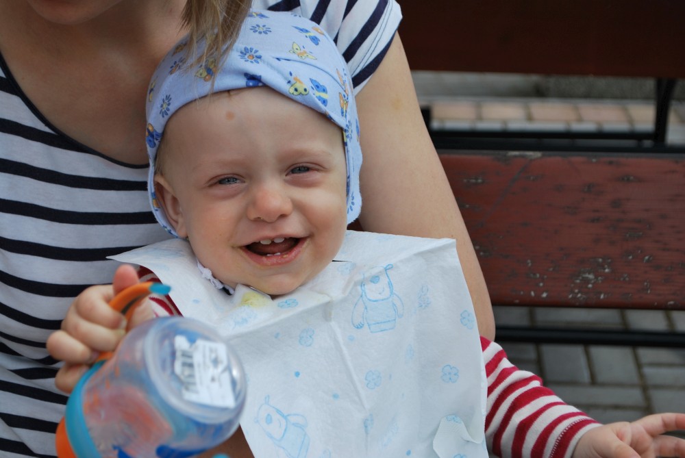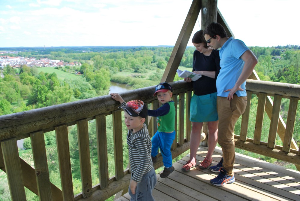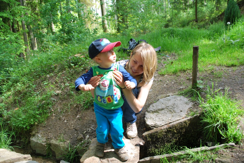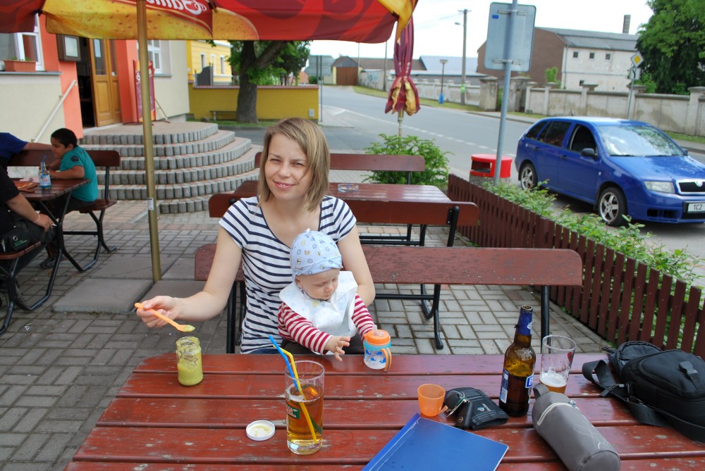 Jedeme na oběd do Želče. Pak jedeme do Soběslavi, kde necháváme auto za řekou u cesty do kempu a potkáváme se s Inžou a Ivkou. Jdeme na nedalekou rozhlednu Svákov. Zastavujeme u "zázračné" studánky u kostela se strašidlem Doudlem. Zpět jdeme pro kočárek výživnou zkratkou přes altán.