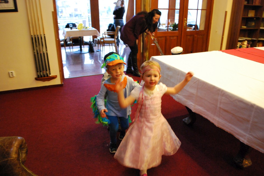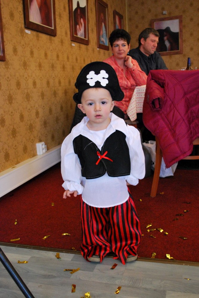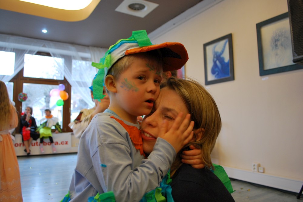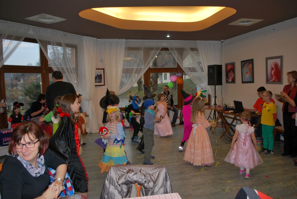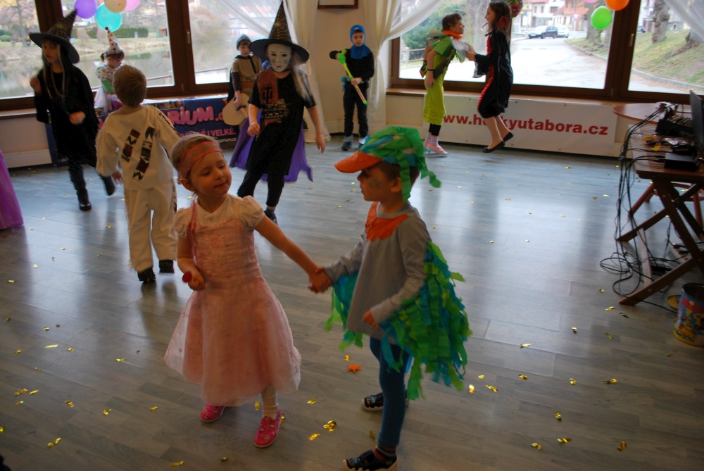 Odpoledne jdeme na horecký maškarní do lázní v Čelkovicích. Víťa jde za lednáčka, Jirka za kocourka. Potkáváme tam Terku s Radkem, Tončou a Fanouškem. Tonča je princezna a Fanouš pirát. Fanoušek si dokonce odnáší jednu z cen za nejlepší masku.
