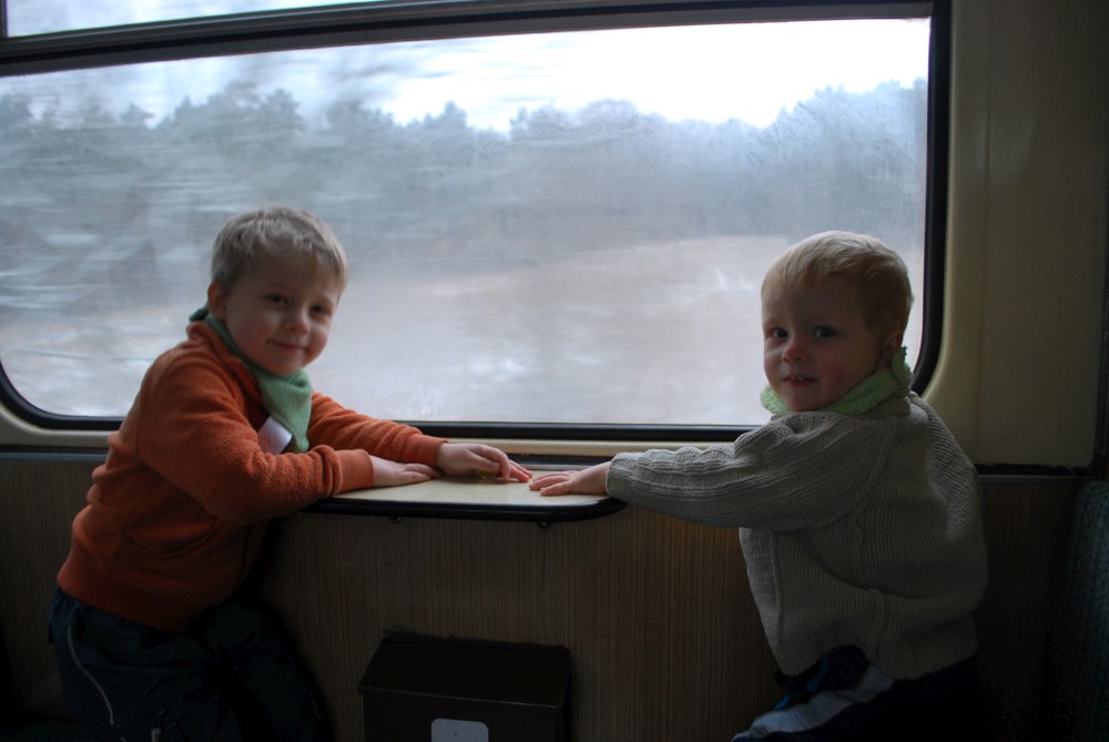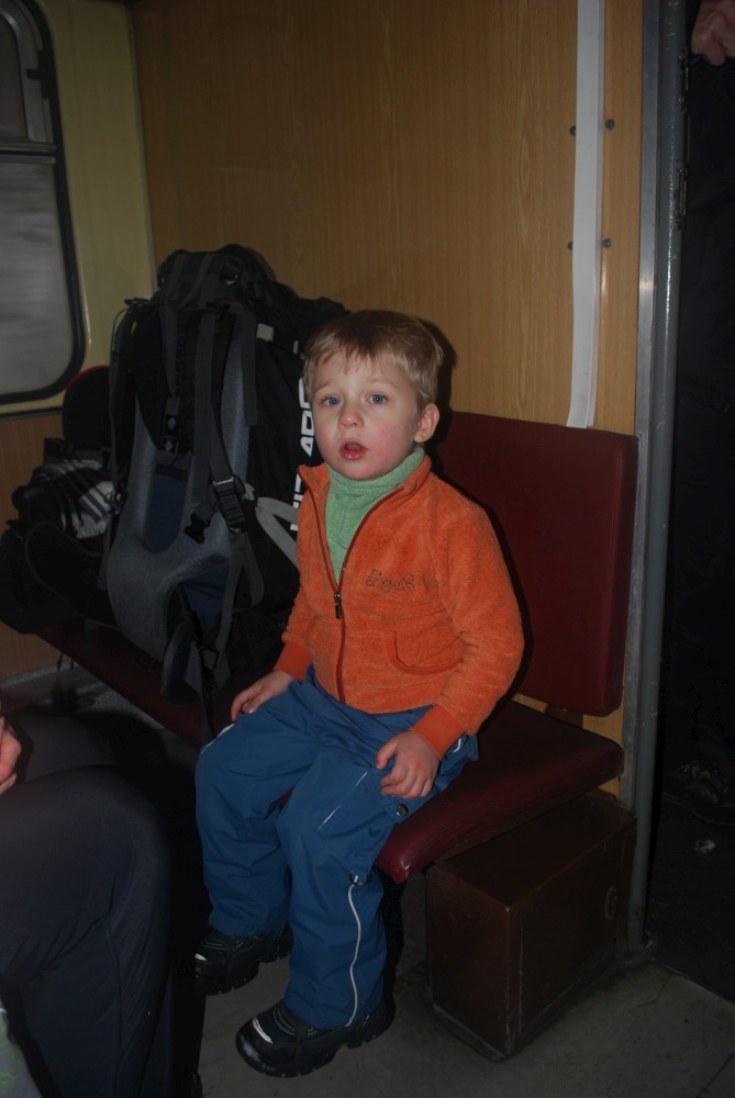 Vyrážíme jako první, chceme stihnout vlak v 10 hodin. Na nádraží jedeme autem, auto necháváme na stanici a nasedáme do vlaku. Nakládat 2 vozítka a 3 kluci je celkem zážitek. Vlakem jedeme asi půl hodinky až do Čachtic. Cestou jsou dva tunely a ve vlaku je při průjezdu tma jako v pytli.